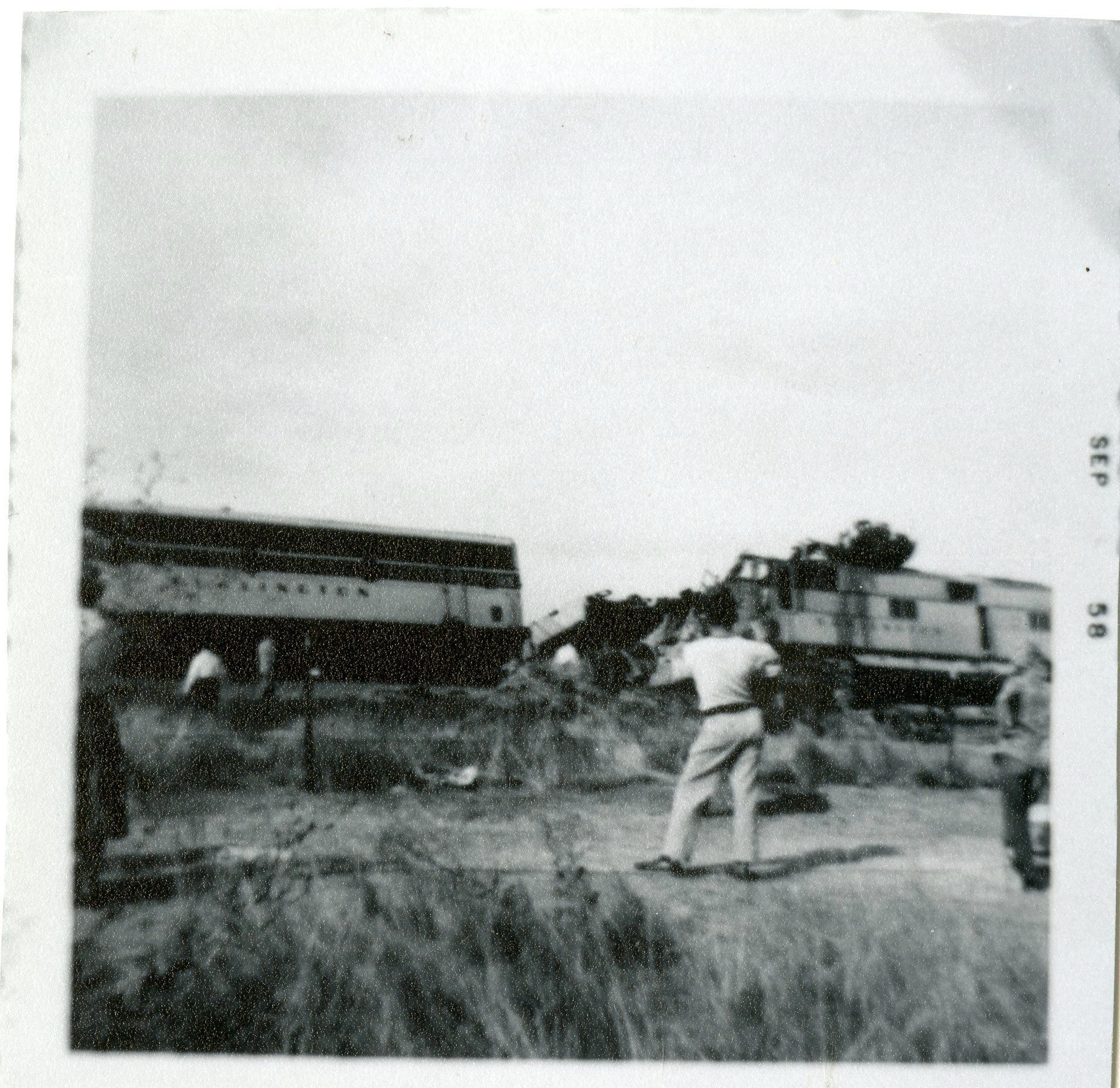 Black and white photograph depicting a train wreck in or near Broomfield CO. It also shows bystanders looking on while other people help. Photograph taken in September of 1958.