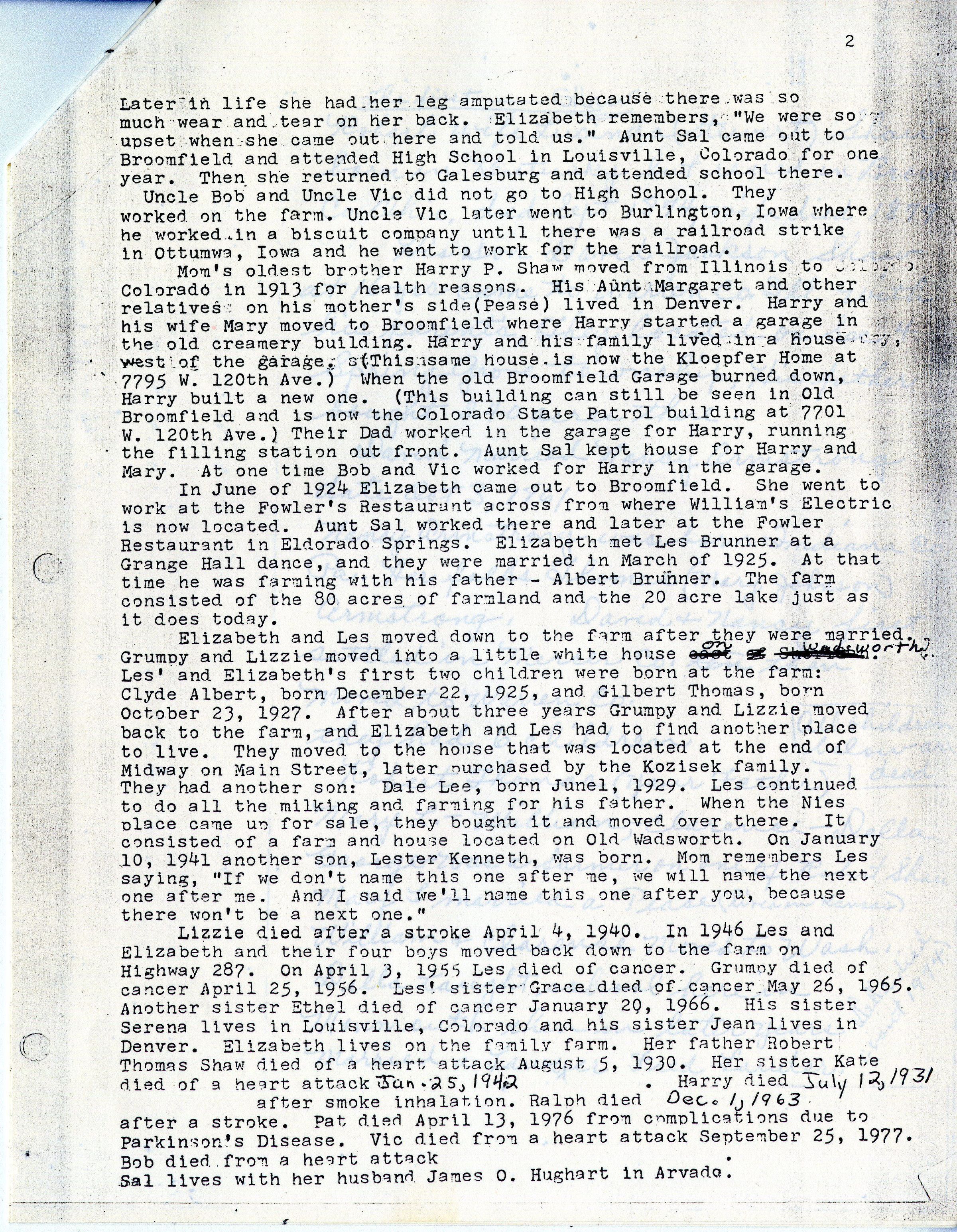 A transcription of the history of the Brunner family before and after they moved to Broomfield. It was all written by Kathy Brunner in November of 1979. The document relays the immigration of Rudolph Brunner and his wife Elizabeth Kunz to America, from Switzerland, and the birth of their children, including Albert Brunner. Albert Brunner married Elisa Berges, and after living in Kansas for a little while, moved to Broomfield. This document also talks about the immigration of Kate Eliza Lucas, (Elizabeth Brunner's mother), and the subsequent movement of Elizabeth and her siblings around the country. Eventually Elizabeth, and most of her siblings moved to Colorado. Elizabeth met Lester Brunner (one of the children of Albert and Elisa Brunner), and they got married. Their children included Clyde, Gilbert, Dale, and Lester. At the time of the writing of the document, Elizabeth Brunner was still alive.Collection