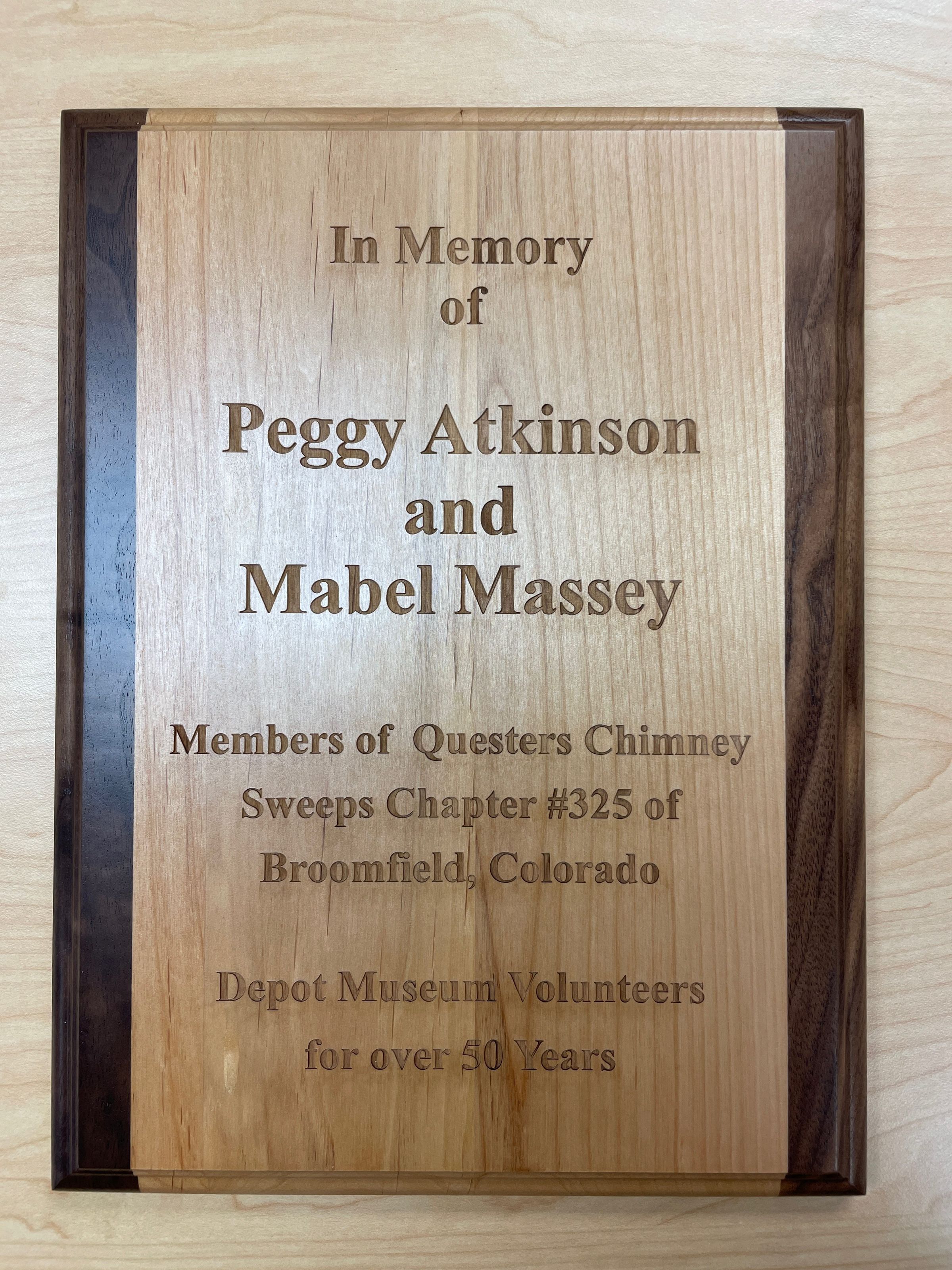 Wooden plaque honoring Peggy Atkinson and Mabel Massey. Presented to the Broomfield Depot Museum and The Friends of Broomfield History by the Chimney Sweep Questers on January 21, 2023. The plaque reads “In Memory of Peggy Atkinson and Mabel Massey Members of Questers Chimney Sweeps Chapter #325 of Broomfield, Colorado Depot Muséum Volunteers for over 50 years”.