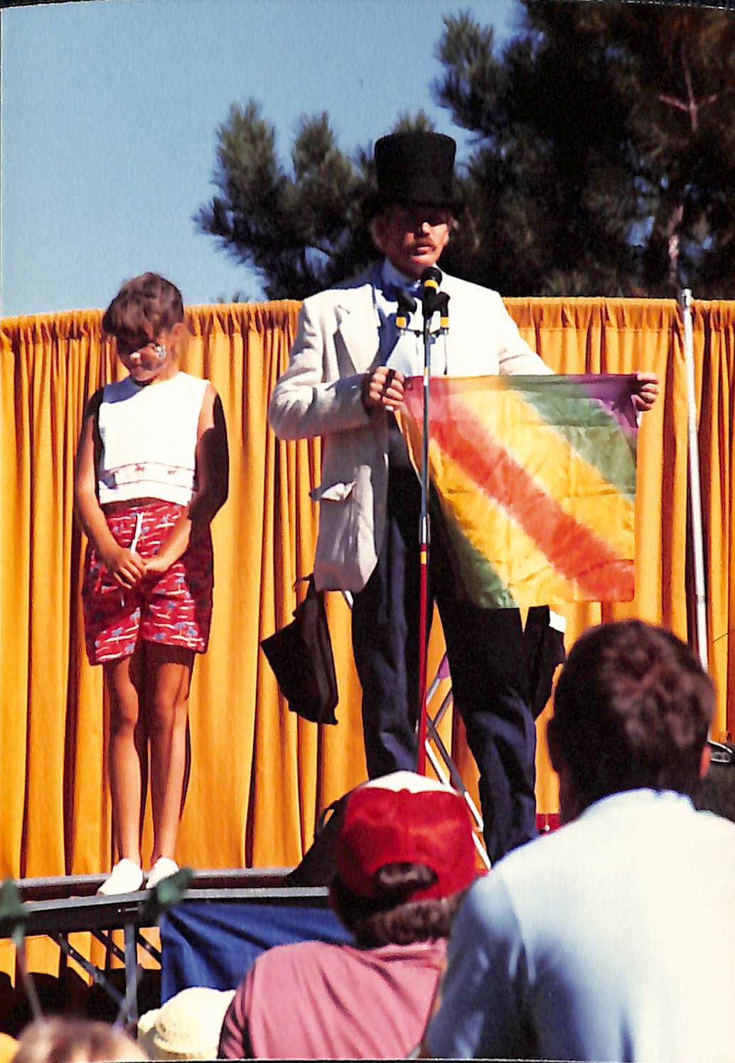 Item is a photograph printed on Kodak paper taken during the 1989 Broomfield Days event. The photo is of a magician wearing a tall black hat, white suit, and navy pants standing atop a metal outdoor stage. He is standing behind a microphone and holding a bandana with stripes of color across it, as if showing it to the crowd. A young girl stands to his left, wearing a white shirt and red pants with face paint on her cheek. Facing away from the camera are two men, one with a red baseball cap and shirt, the other with a blue shirt, and they look as though they're watching the show from the crowd. Behind the stage is a yellow curtain, and above this curtain, a pine tree and blue sky are visible.Photograph Details