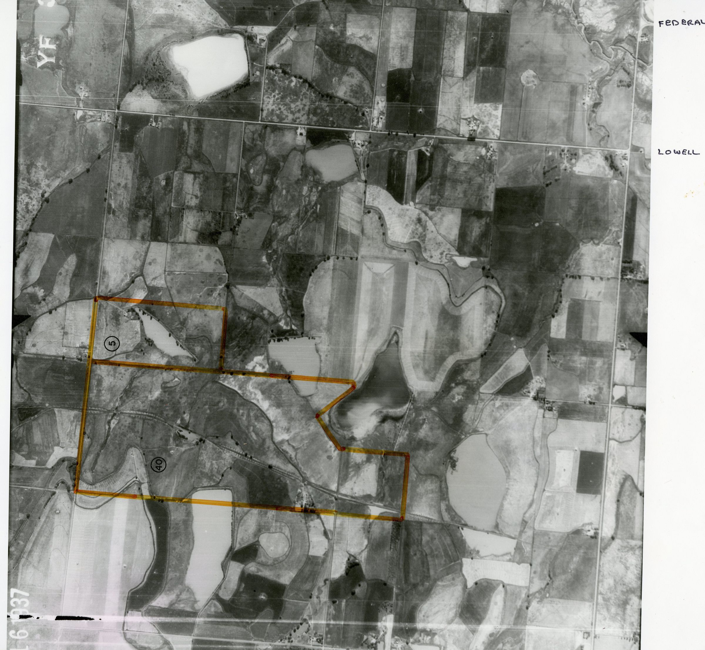 Item is a black-and-white aerial photograph of Broomfield taken on July 16, 1937. The code "YF 33 31" is present in the top right corner. Some areas on the map are numbered, and their borders are highlighted by an orange marker. 128th Avenue and 120th Avenue are labeled intersecting Lowell Boulevard and Federal along the map's border in black ink. Attached to the map by a piece of red ribbon is a notice from the General Services Administration from the National Archives and Record Service confirming that the document is correct. It was signed by Charles E. Taylor, Acting Chief at the Center for Cartographic and Architectural Archives, on November 19, 1980. This paper is also marked with a bright orange seal.Photograph Details