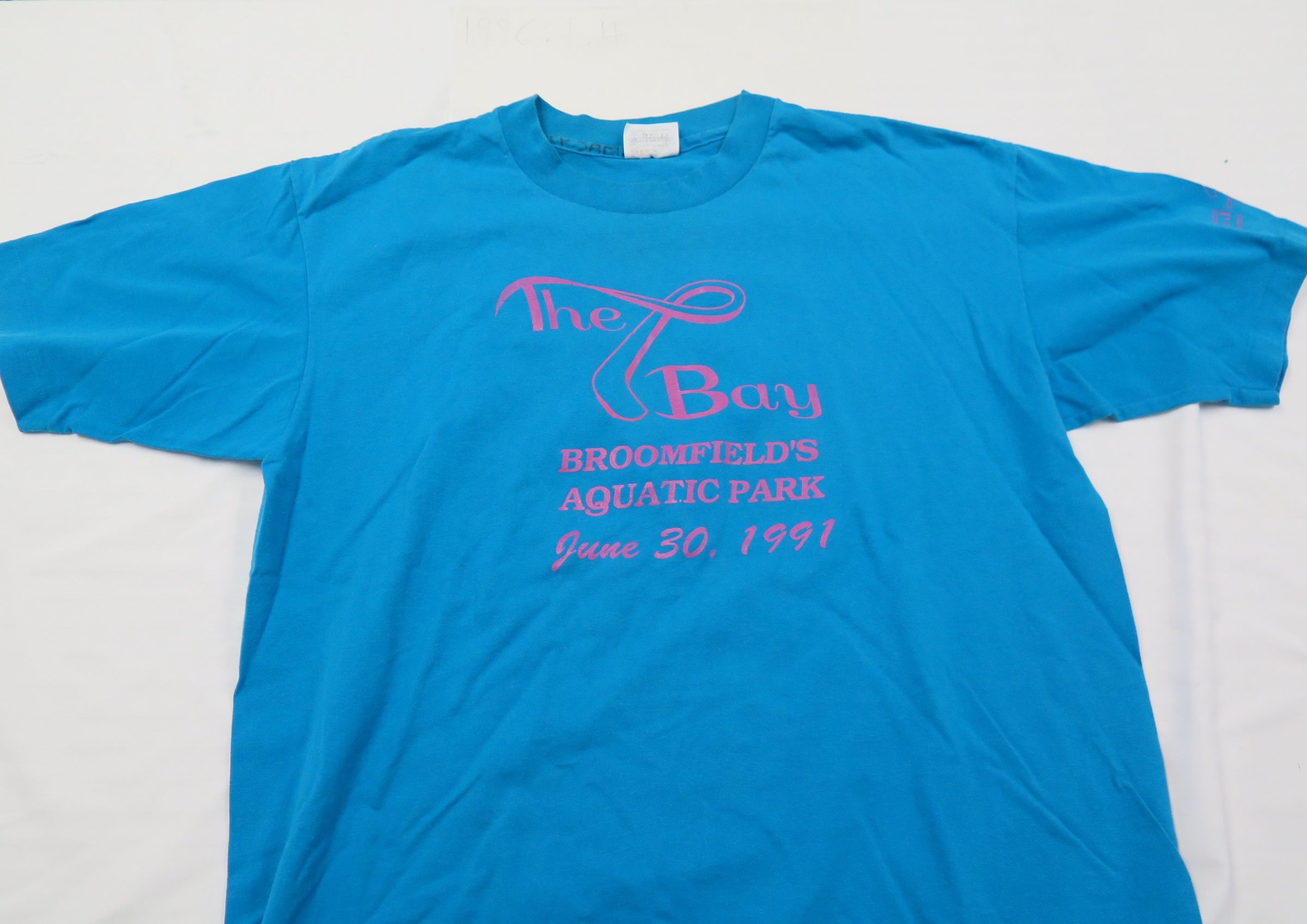 This is a blue t-Shirt with pink text on the from that reads "The Bay/ Broomfield's Aquatic Park/ June 30, 1991". The shirt is a size XL.
