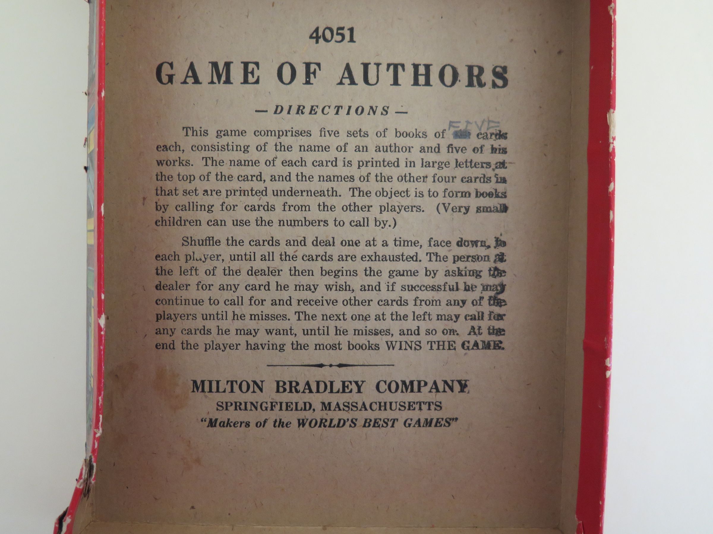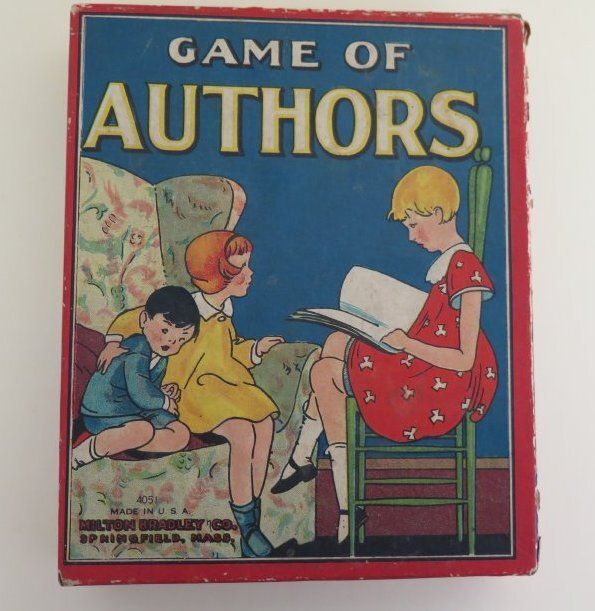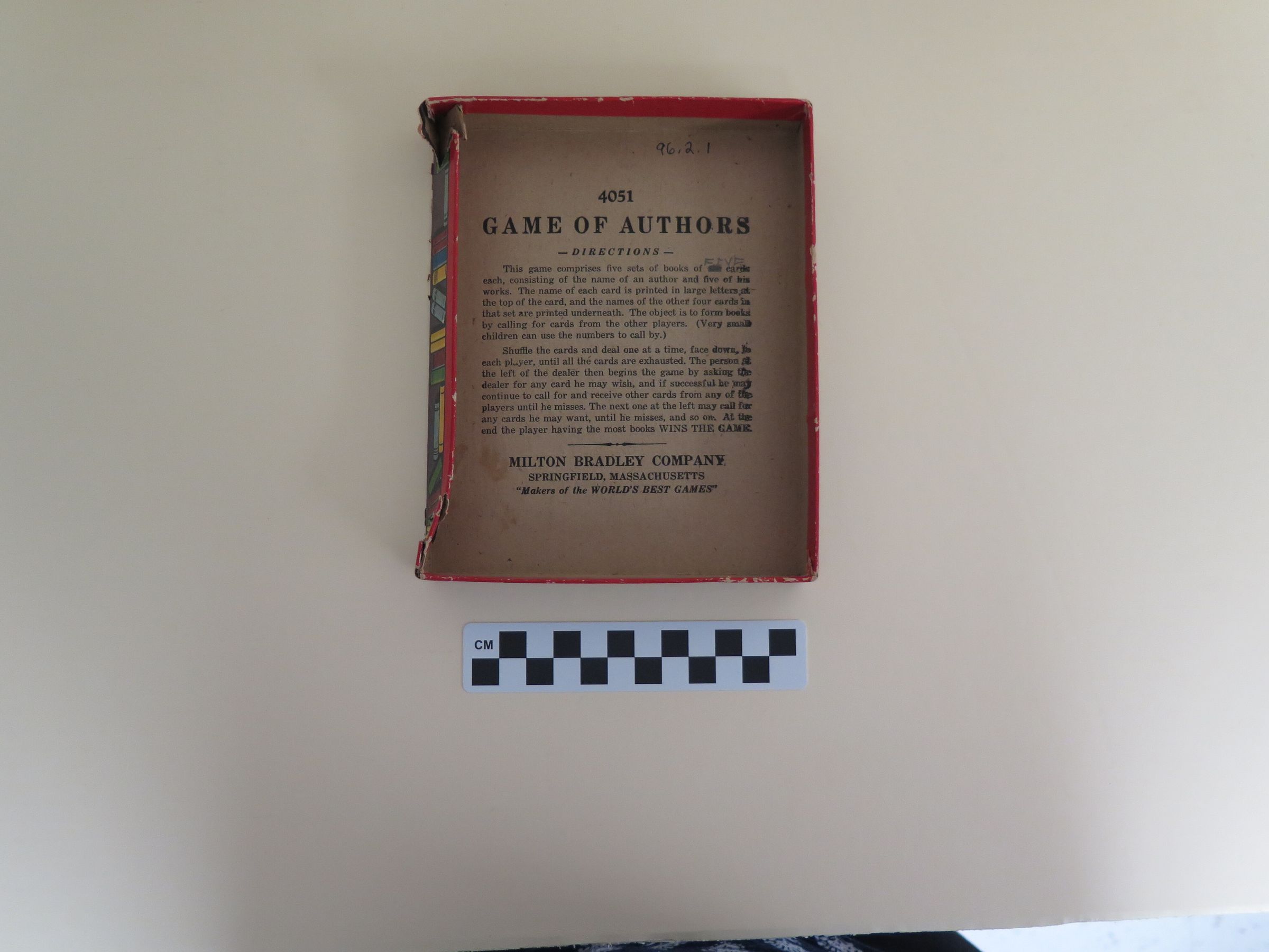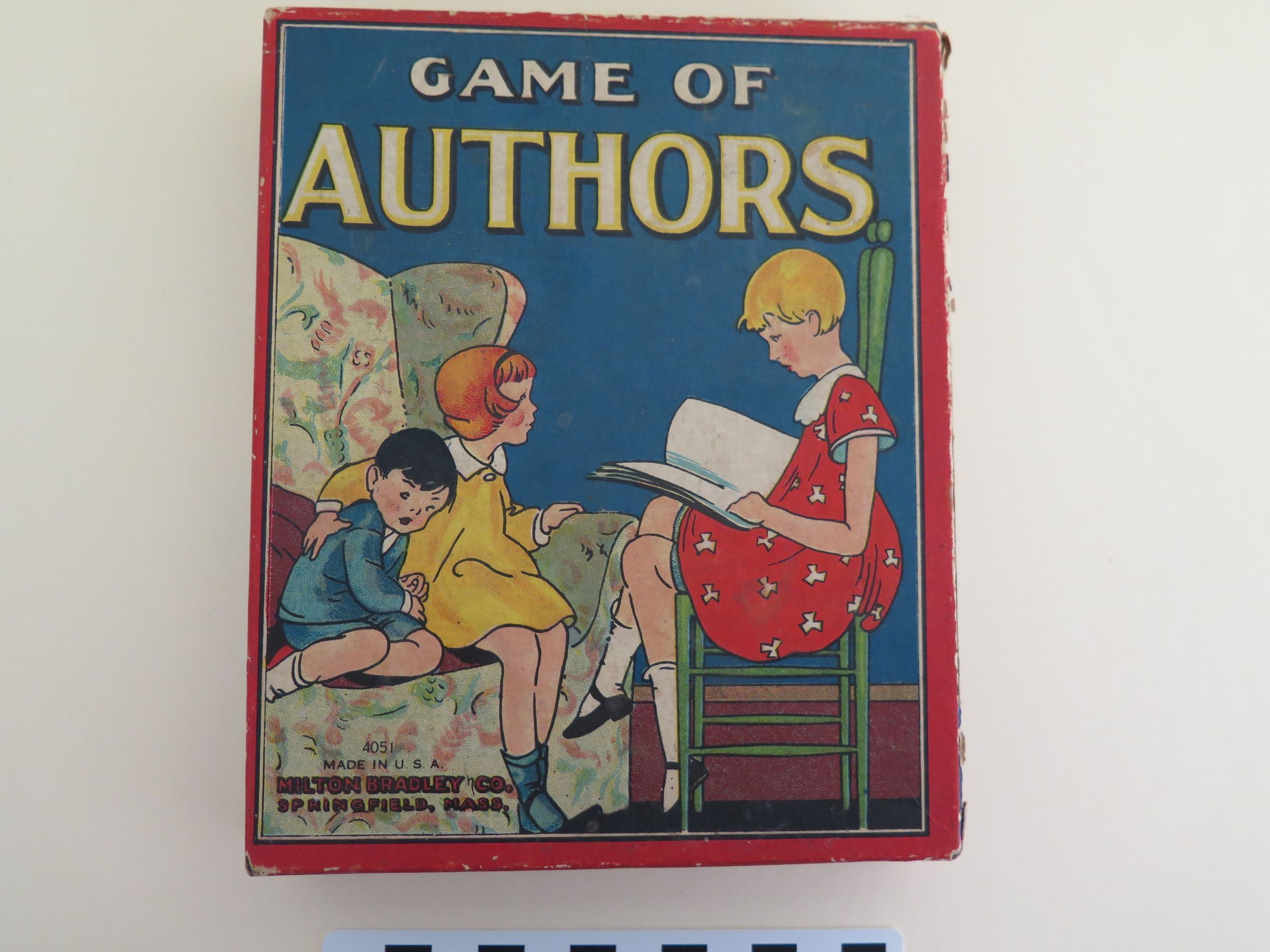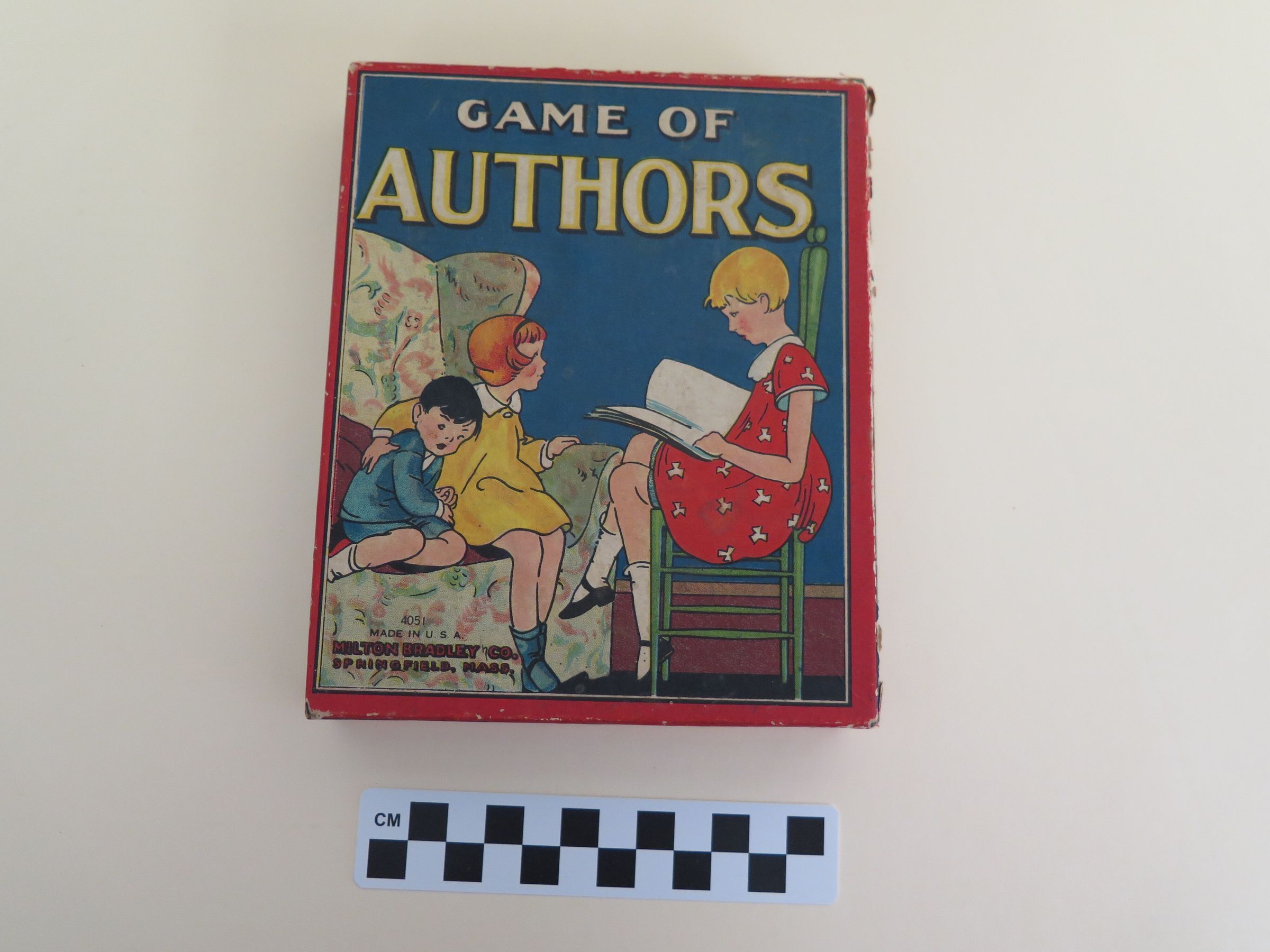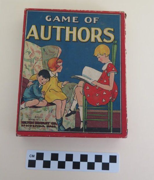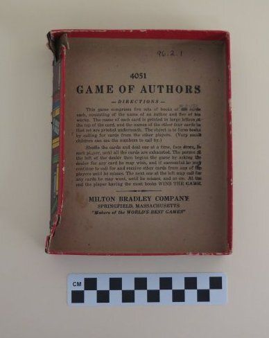 This is the carboard lid to the box for "Game of Authors". The front of the lid shows three kids playing and reads, "Game of Authors/ 4051/ Made in U.S.A./ Milton Bradley Co./ Springfield, Mass.". The directions for the game are printed on the inside of the box top in black ink. The box lid measures 1" (h) x 5.5" (w) x 6.75" (d).Collection