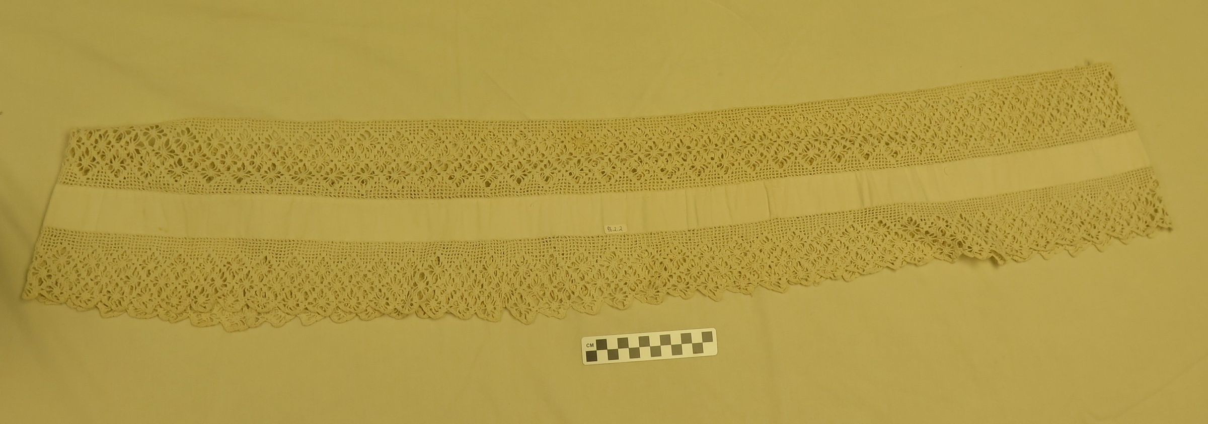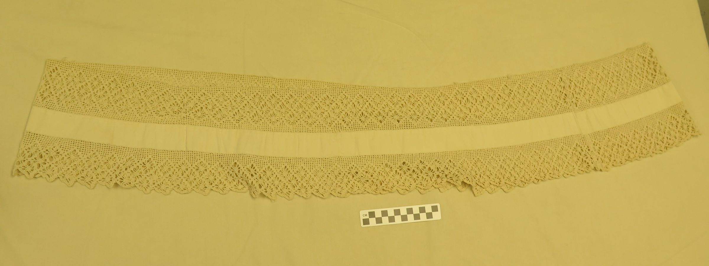 This is a piece of cotton with crochet on both sides. The crochet has been sewn together in a large loop. The crochet measures 7.5" (w) x 39" (diam).Collection
