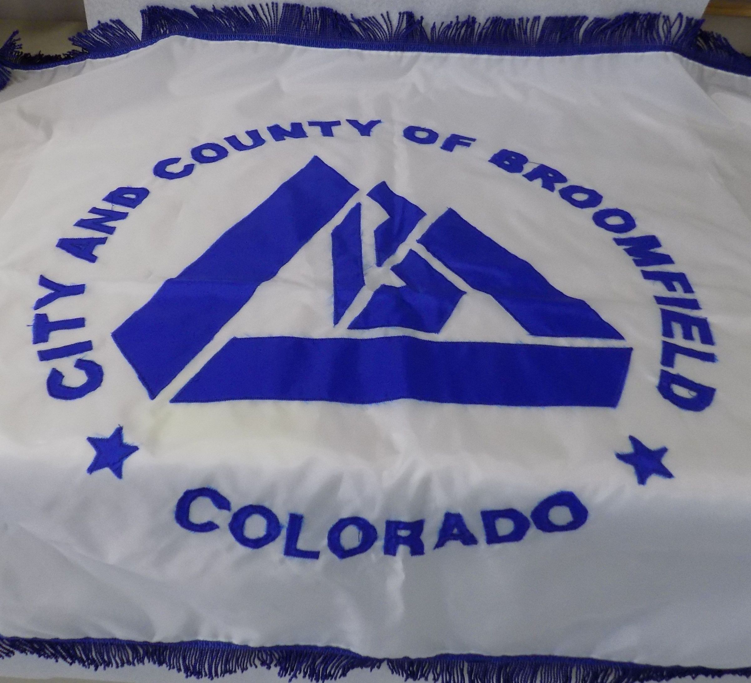 Item is a flag from the city and county of Broomfield manufactured in Denver by American Pennant. This textile features a white background with the words "City and County of Broomfield, Colorado" arced around an embroidered image of the city's logo. The flag is bordered by a sewn-on band of navy blue tassels, which cover all sides except the one that would attach to a flag pole.Collection
