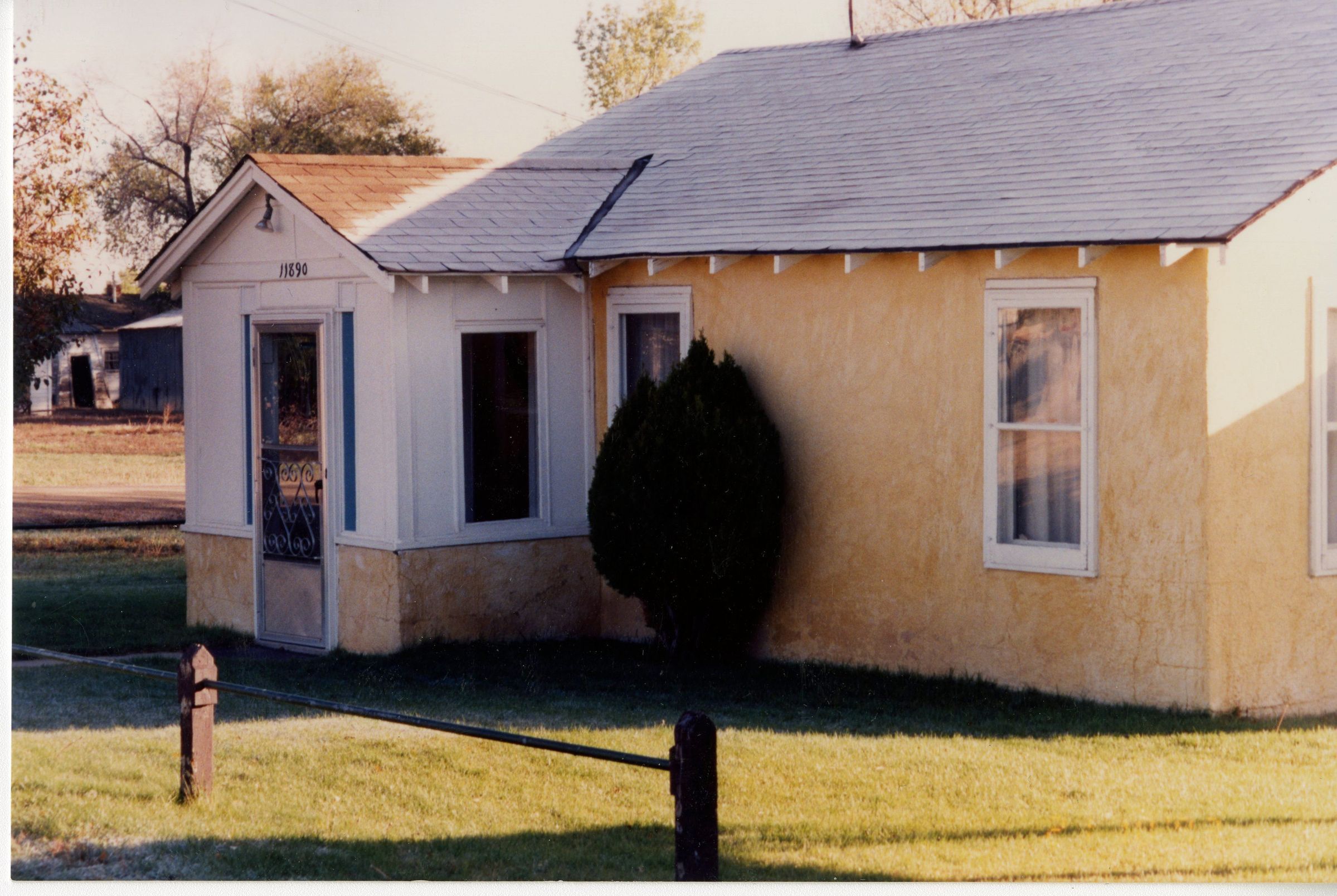 Unidentified house circa 1993. Building has beige stucco, white siding, white trim, four windows shown, one door, open gable roof. Small evergreen bush near front door of the house with a green lawn. Small wood and metal pole fence in front. Likely demolished.