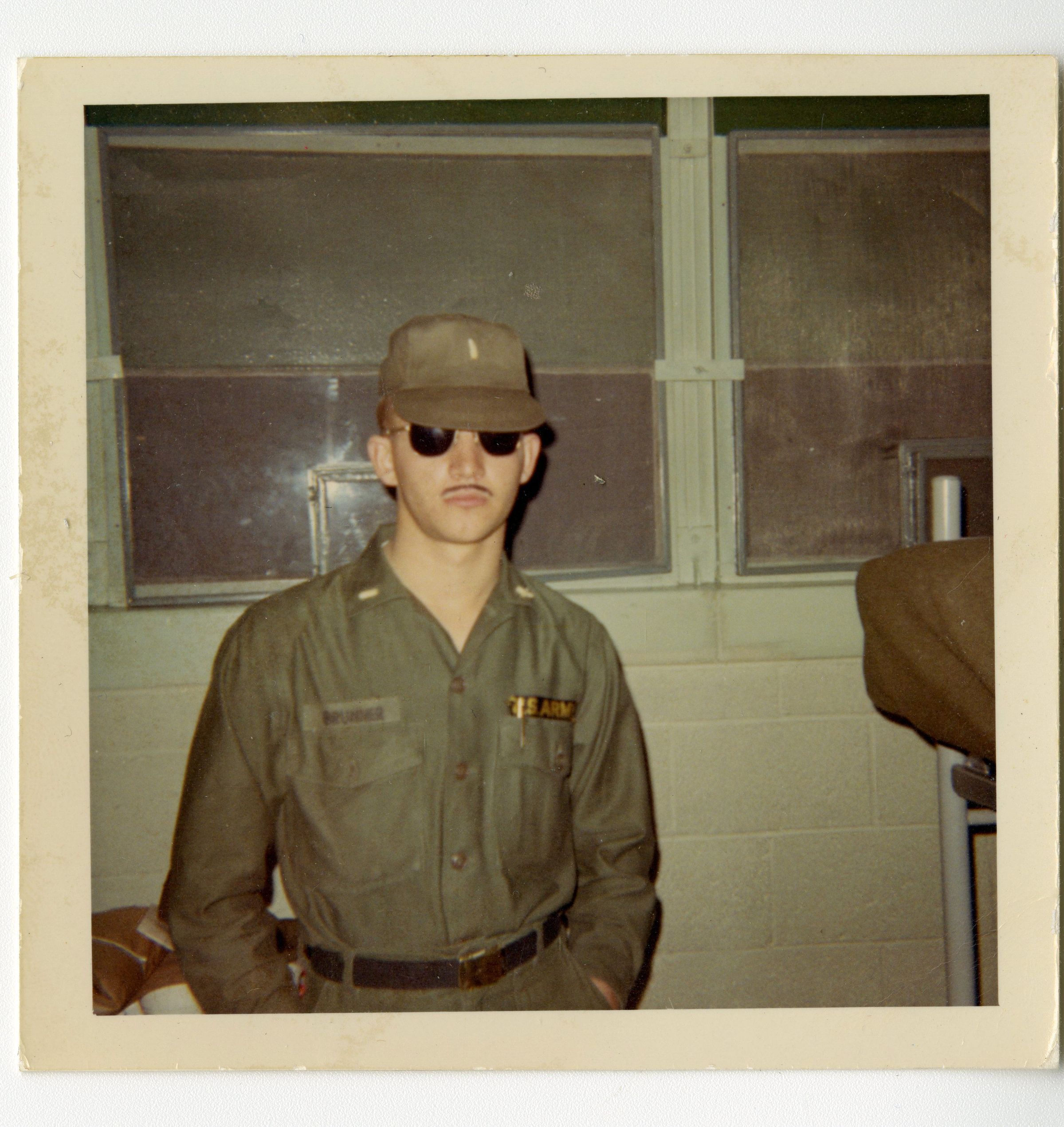 Color photograph of a man in an army uniform. The man is identified as Dale Paul Brunner. Photograph taken in front of a brick wall with windows, the exact location is unknown.