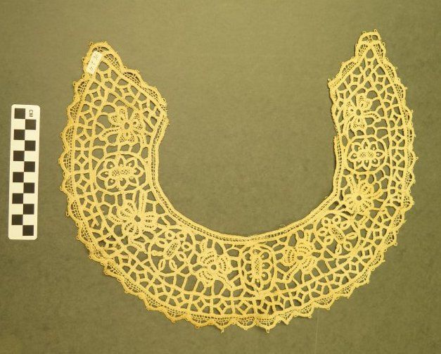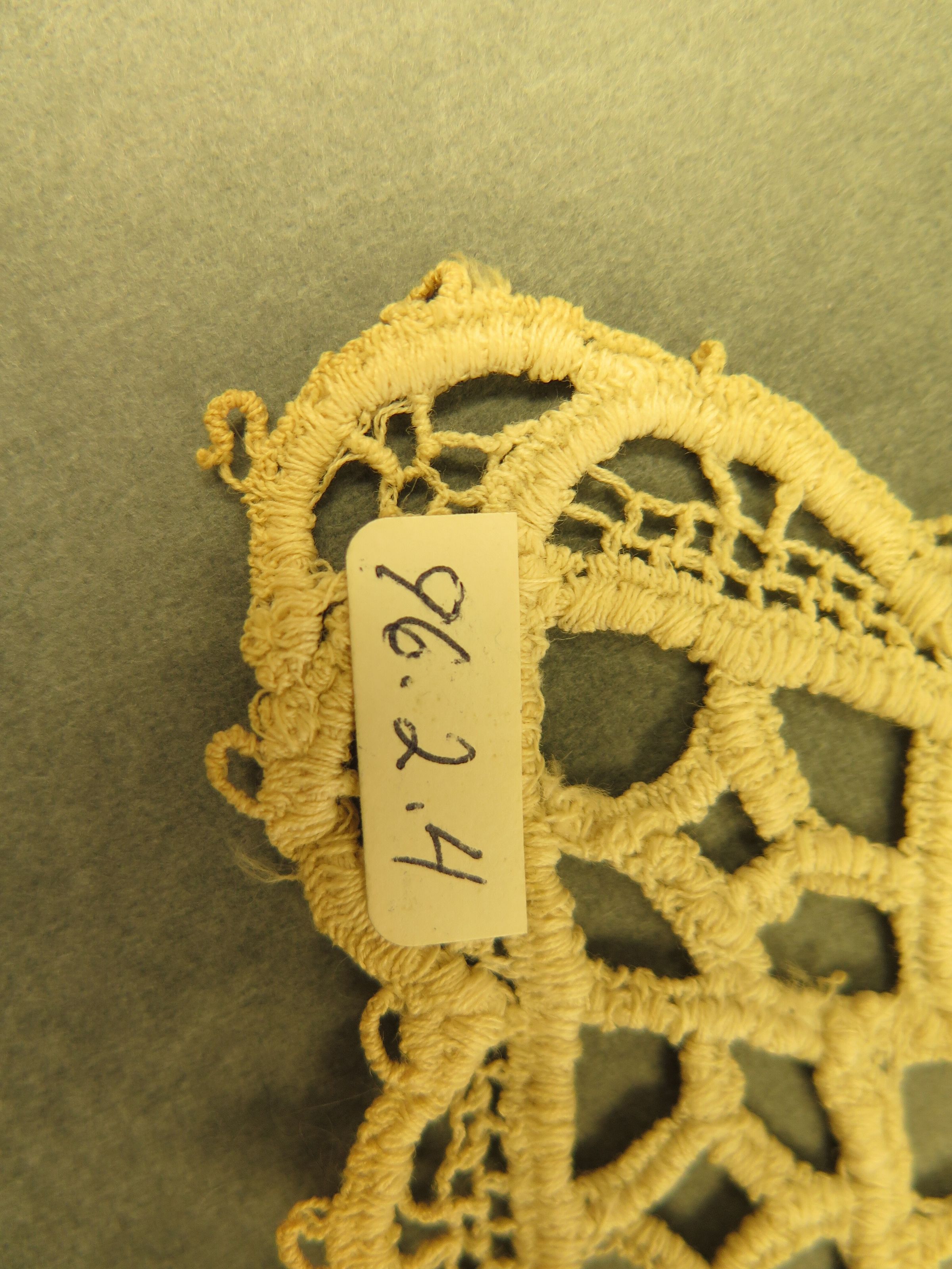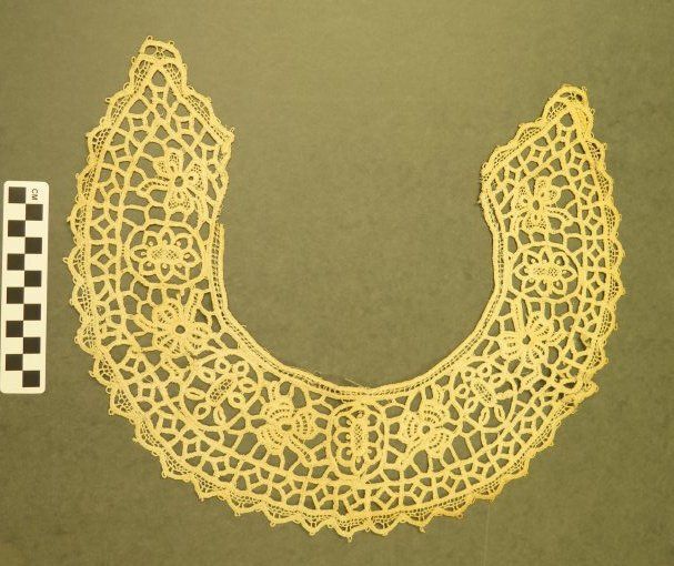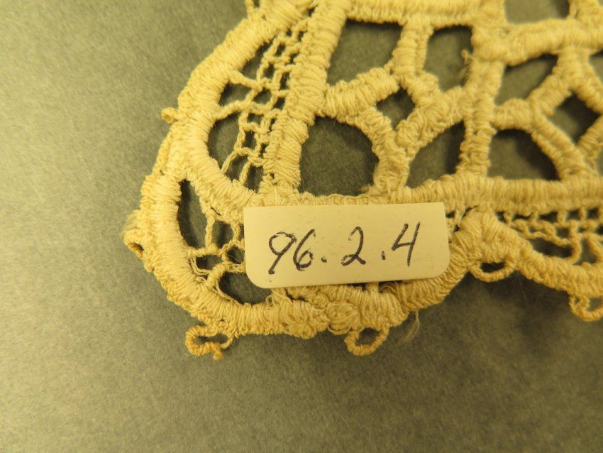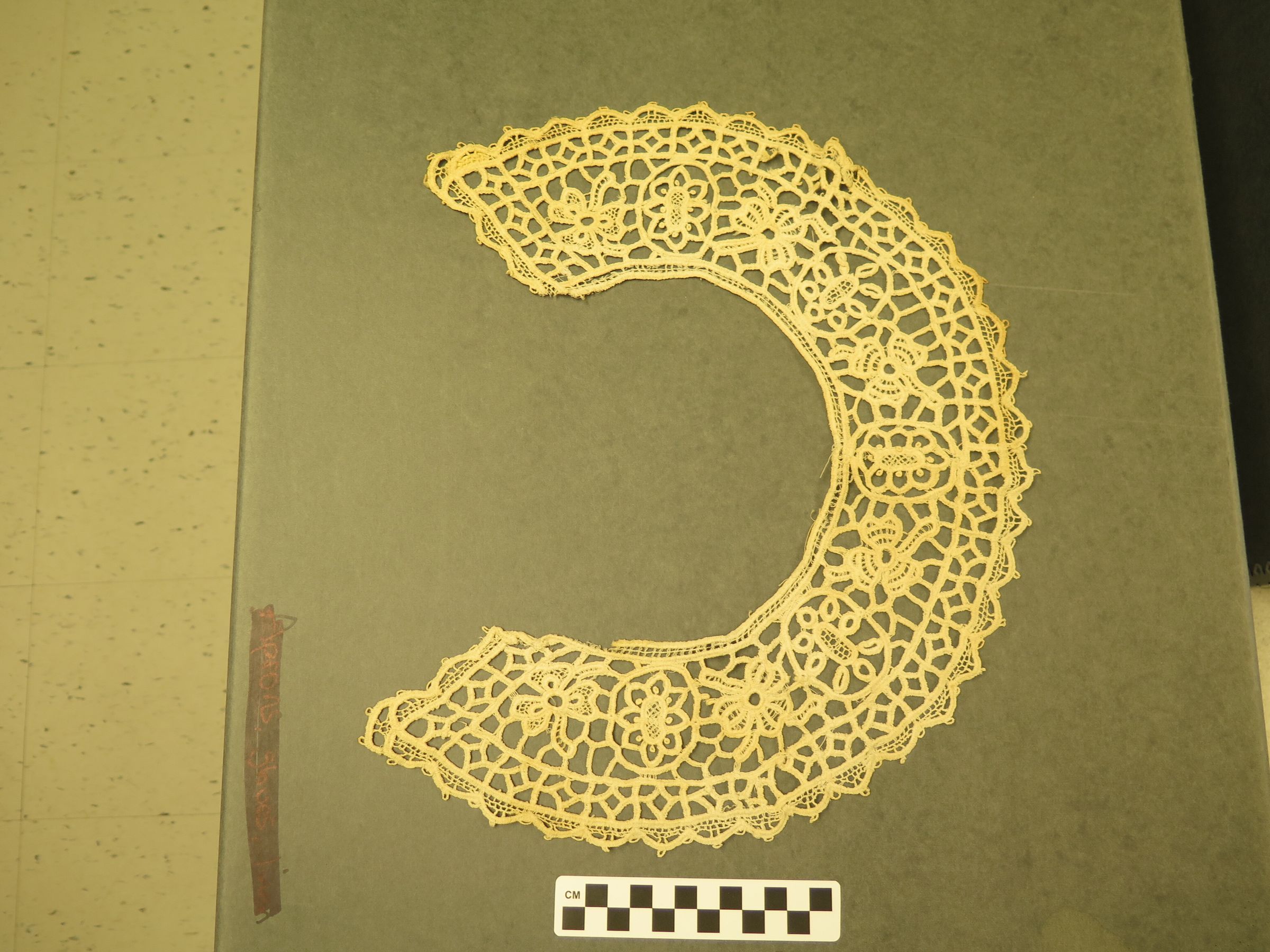 This is a white piece of crochet that makes 3/4 of a circle. It is possibly a collar. The crochet measures 13.5" (w) x 11" (l).