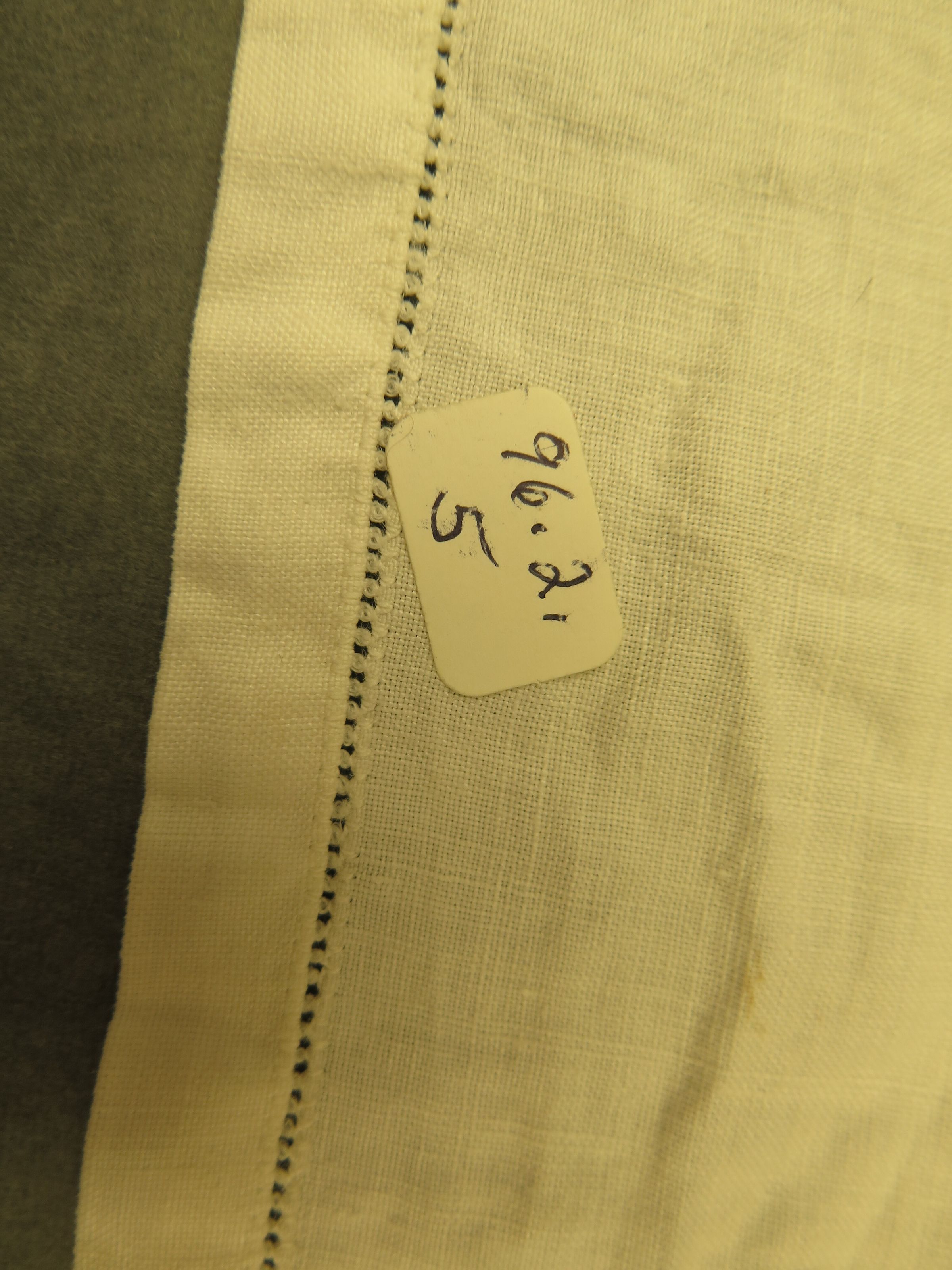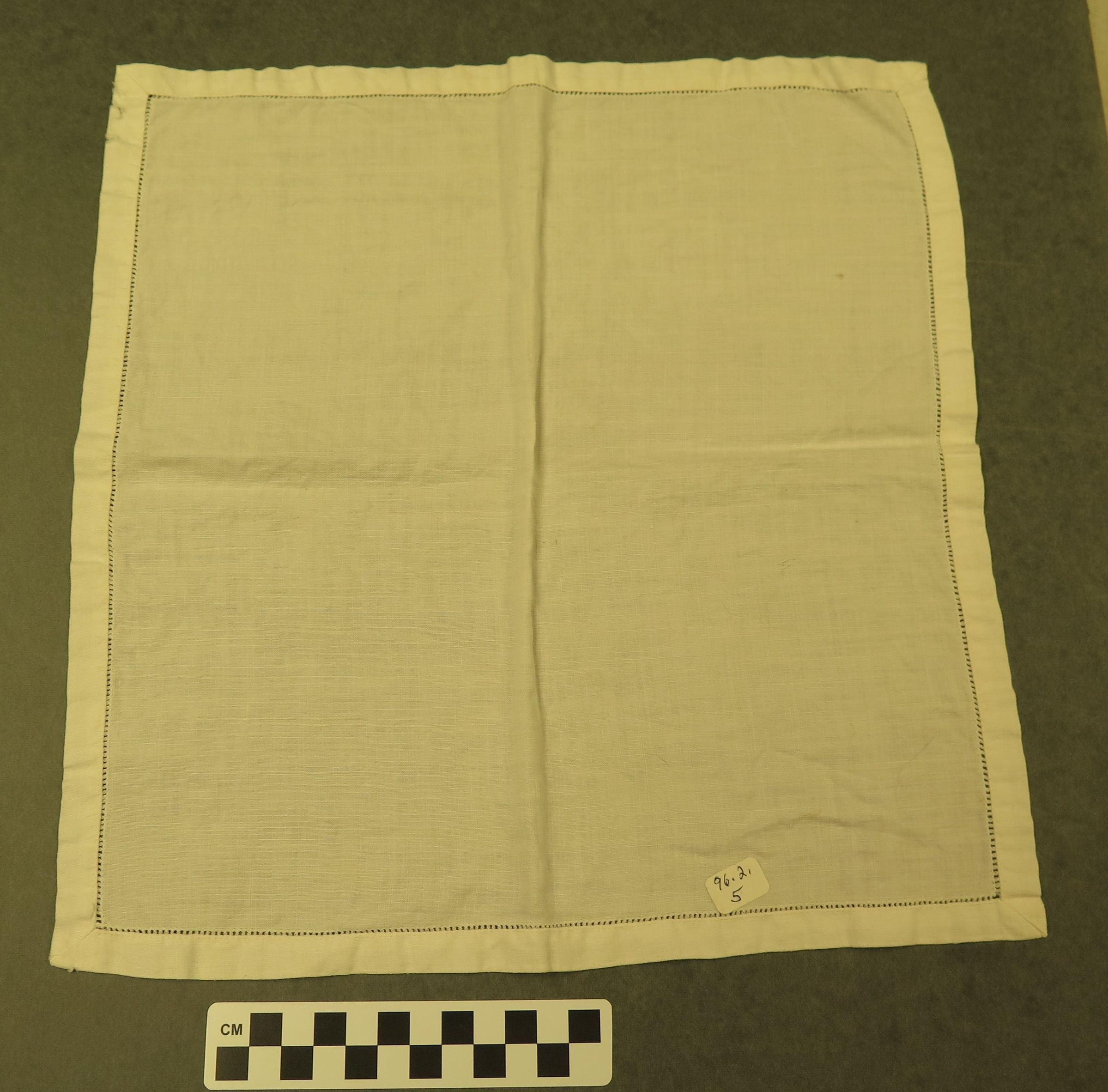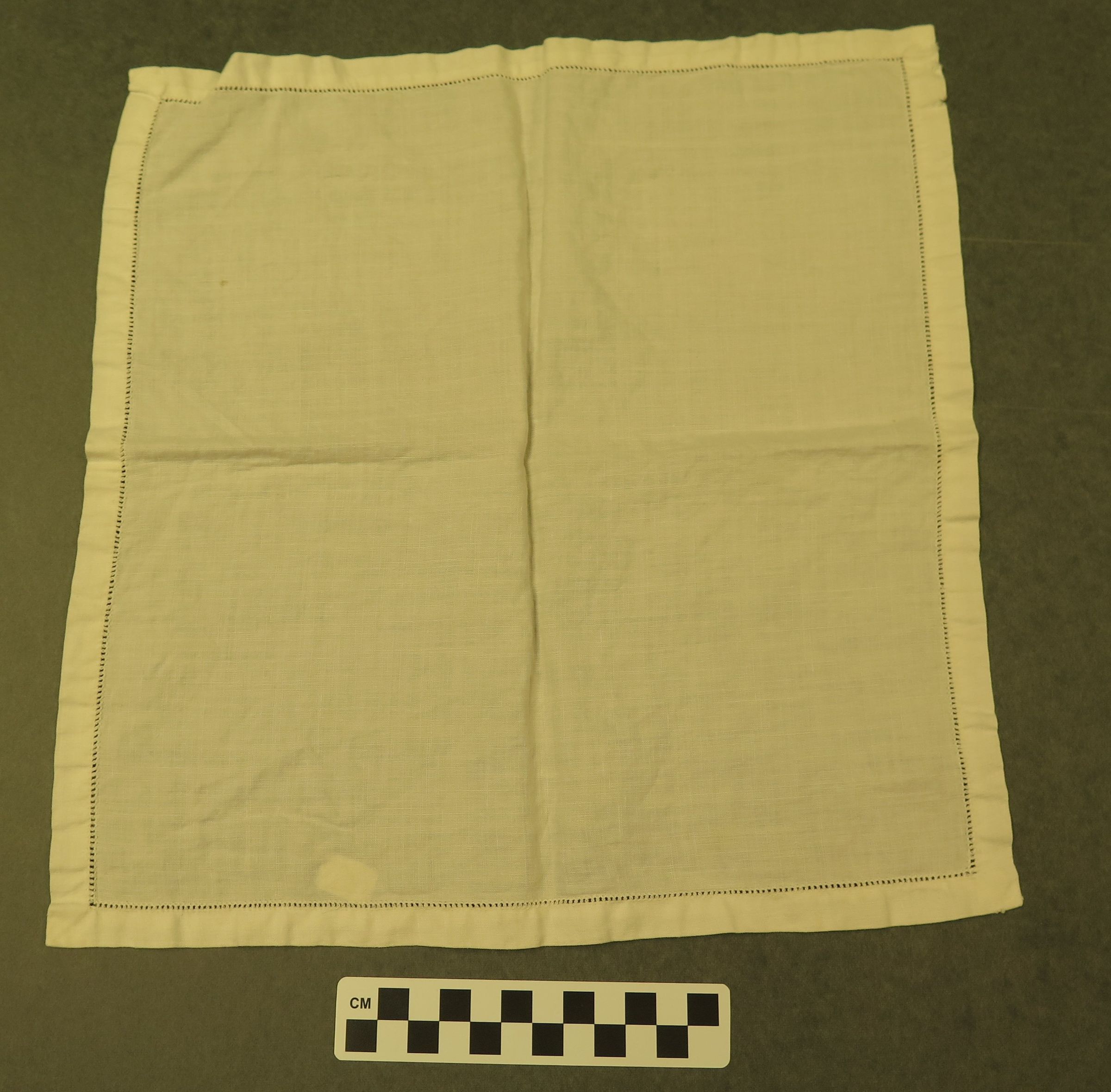 This is a white cotton handkerchief with an eyelet pattern around the border. Handkerchief measures 10" (w) x 10" (l).