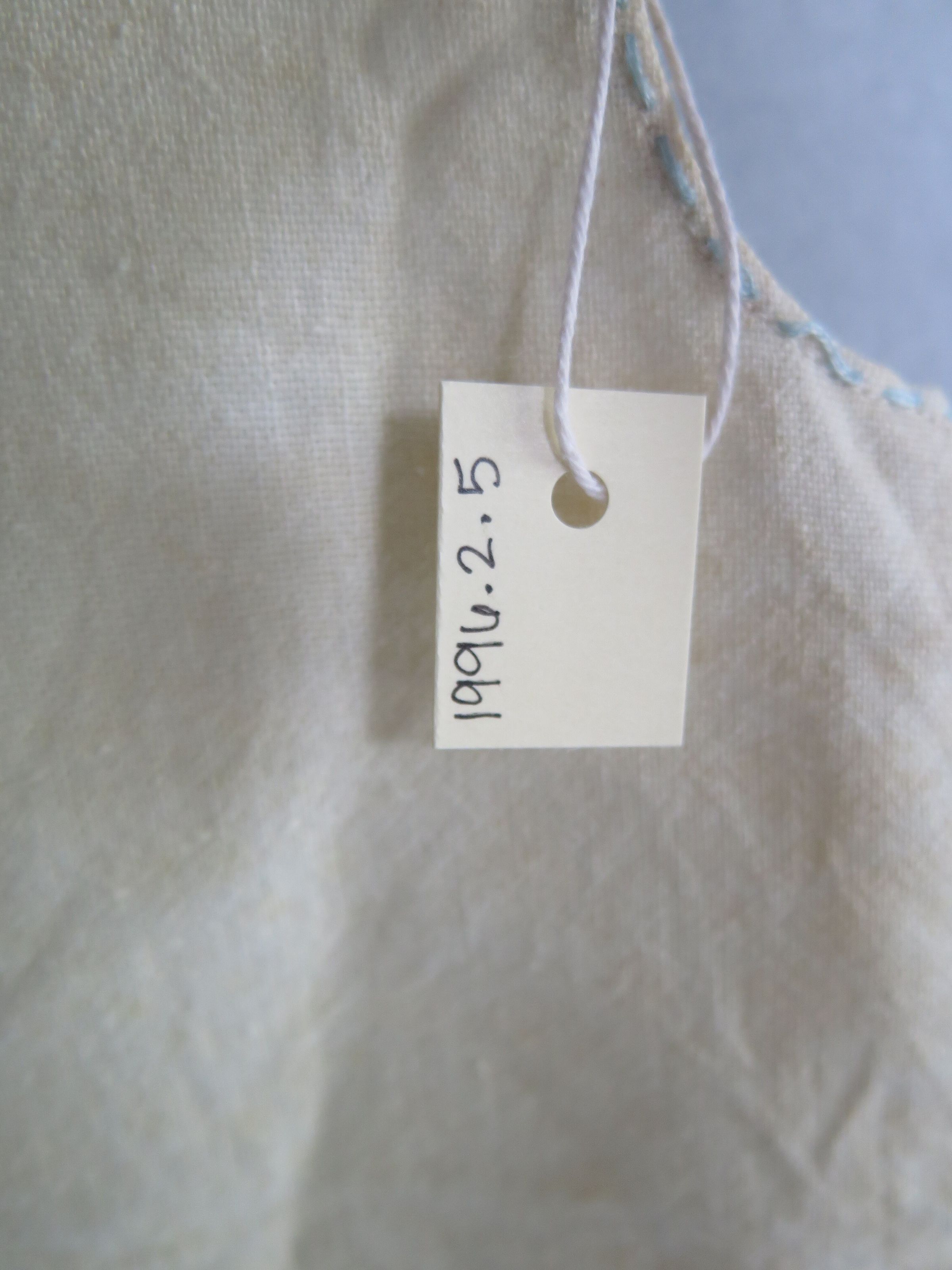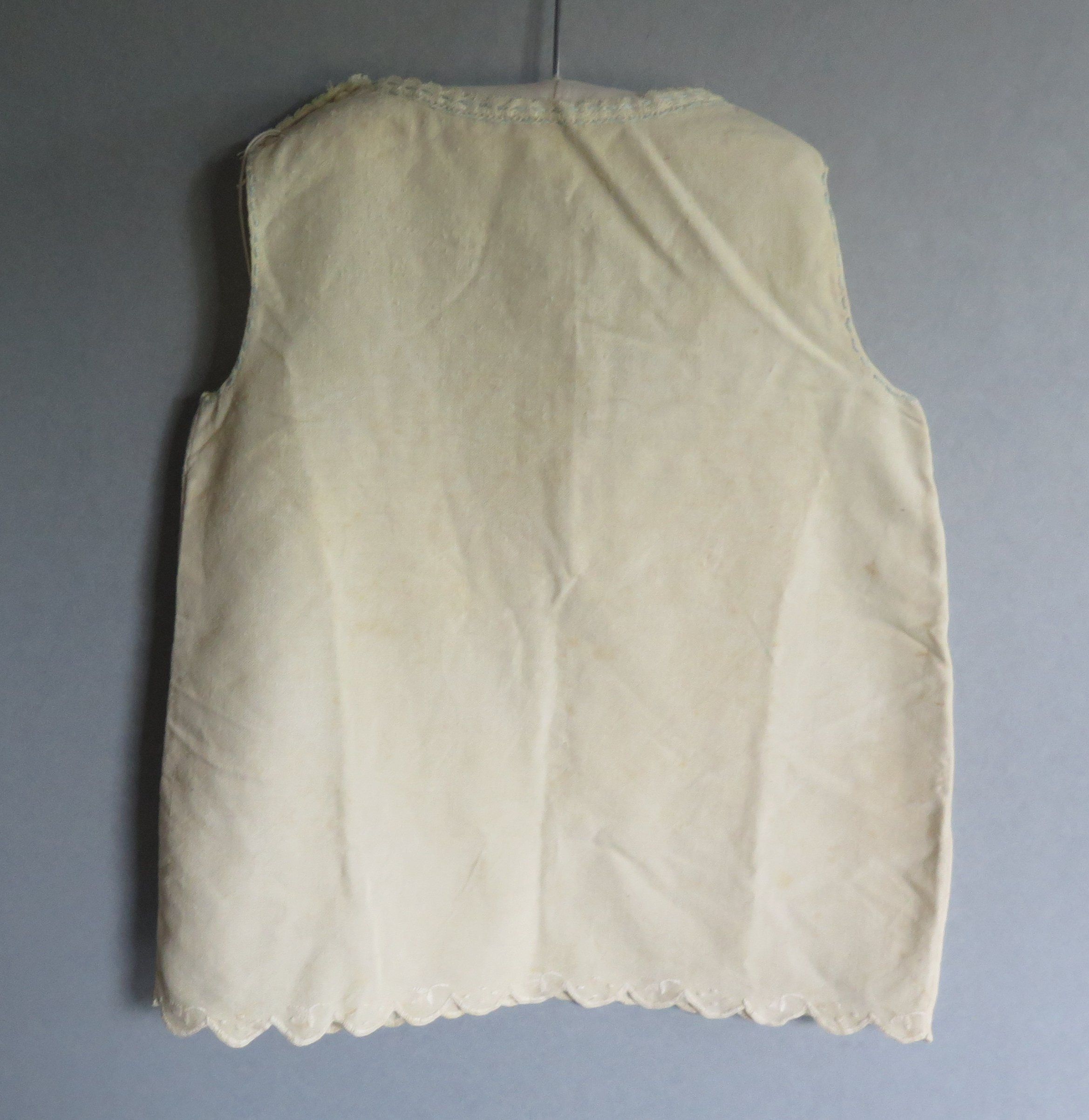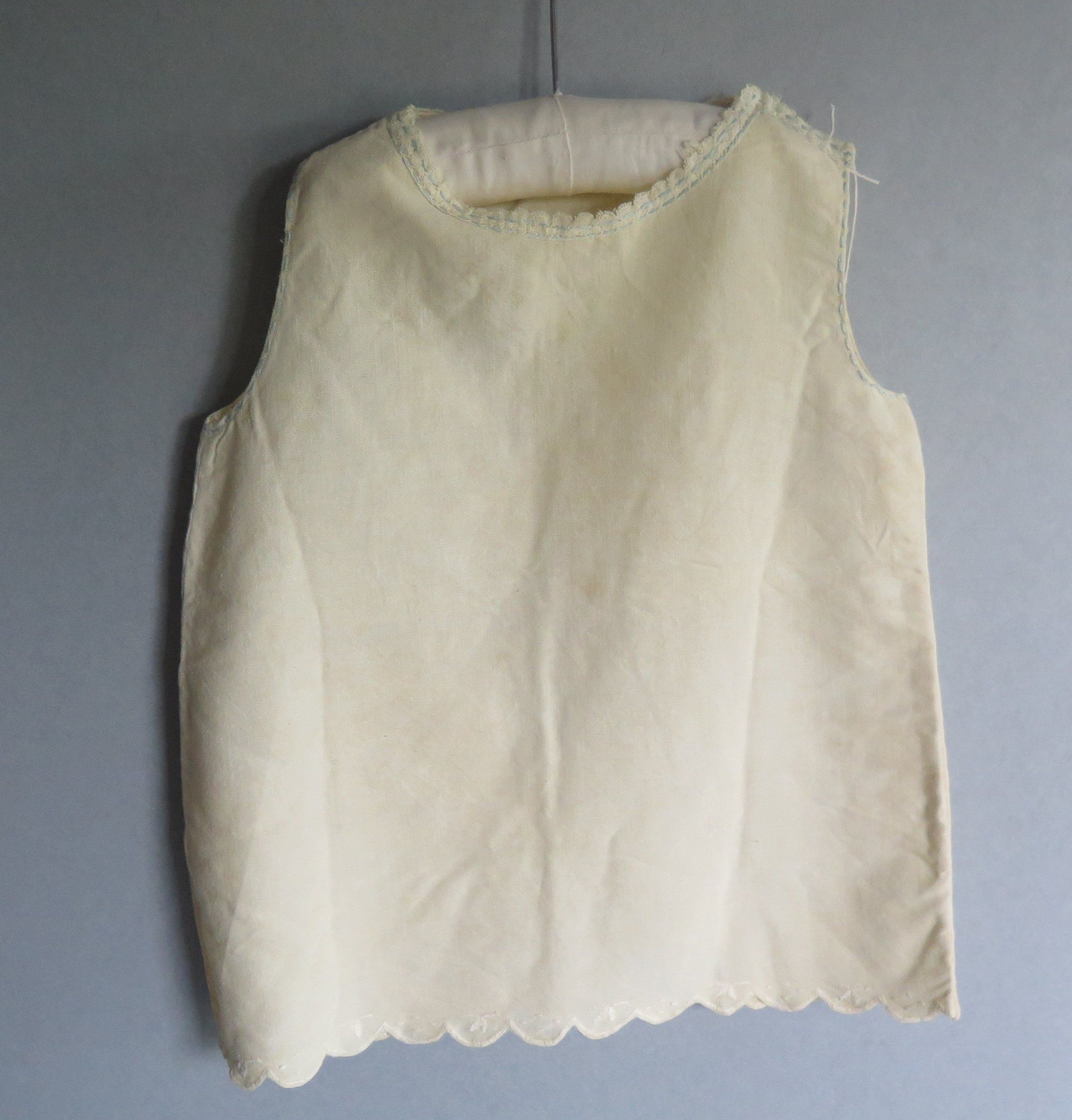 Baby's white sleeveless flannel slip. The bottom of the slip has scalloped edges. The neckline and arm holes have blue trim. the slip opens and closes with buttons on both shoulders of the slip. The slip measures 8" (w) x 16" (l).
