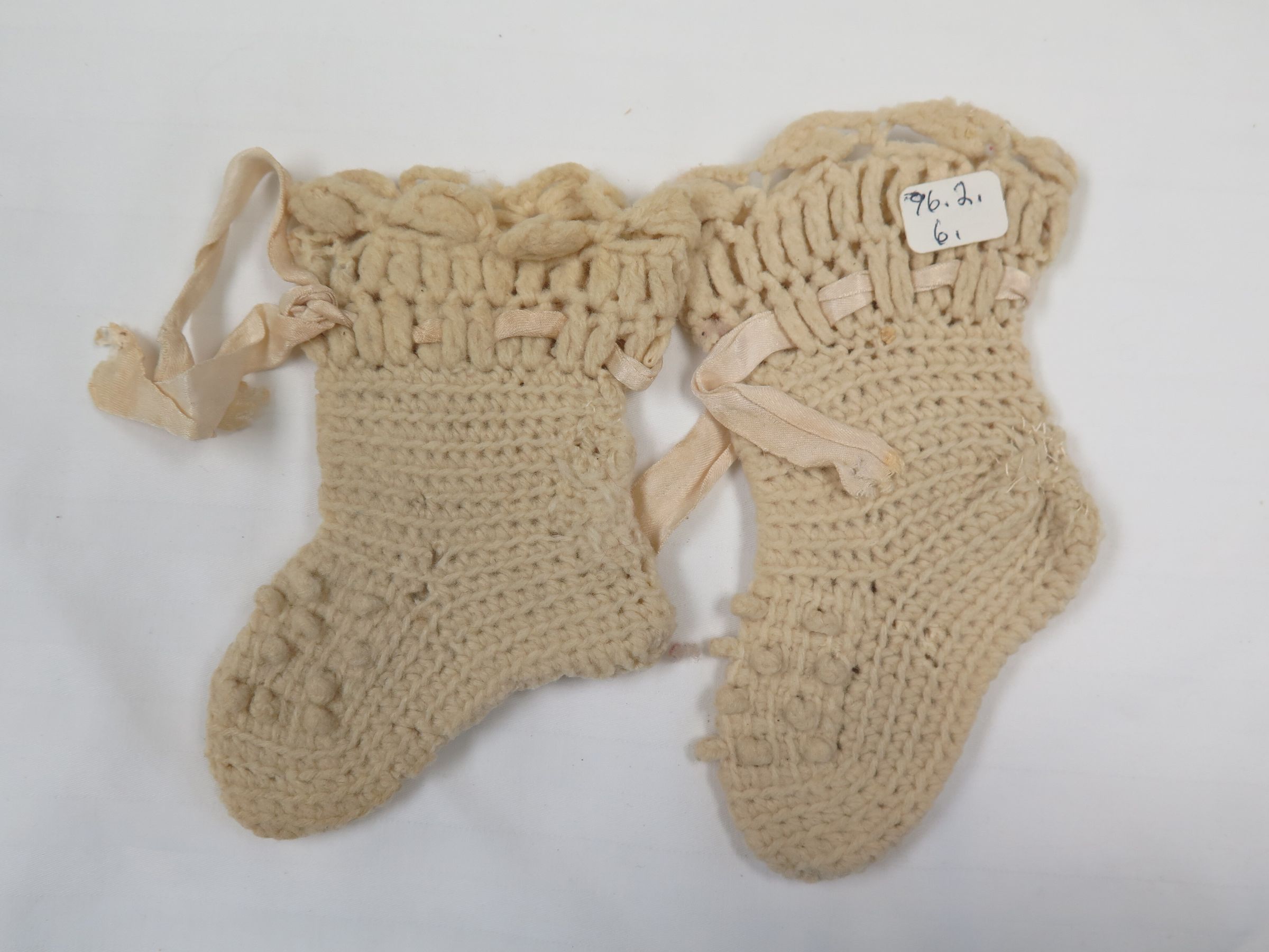 This is a pair of knit baby booties in a cream color. There is cream silk ribbon around the ankle and a scalloped edging around the top of the bootie. Booties measure 2.5" (w) x 5.5" (l).