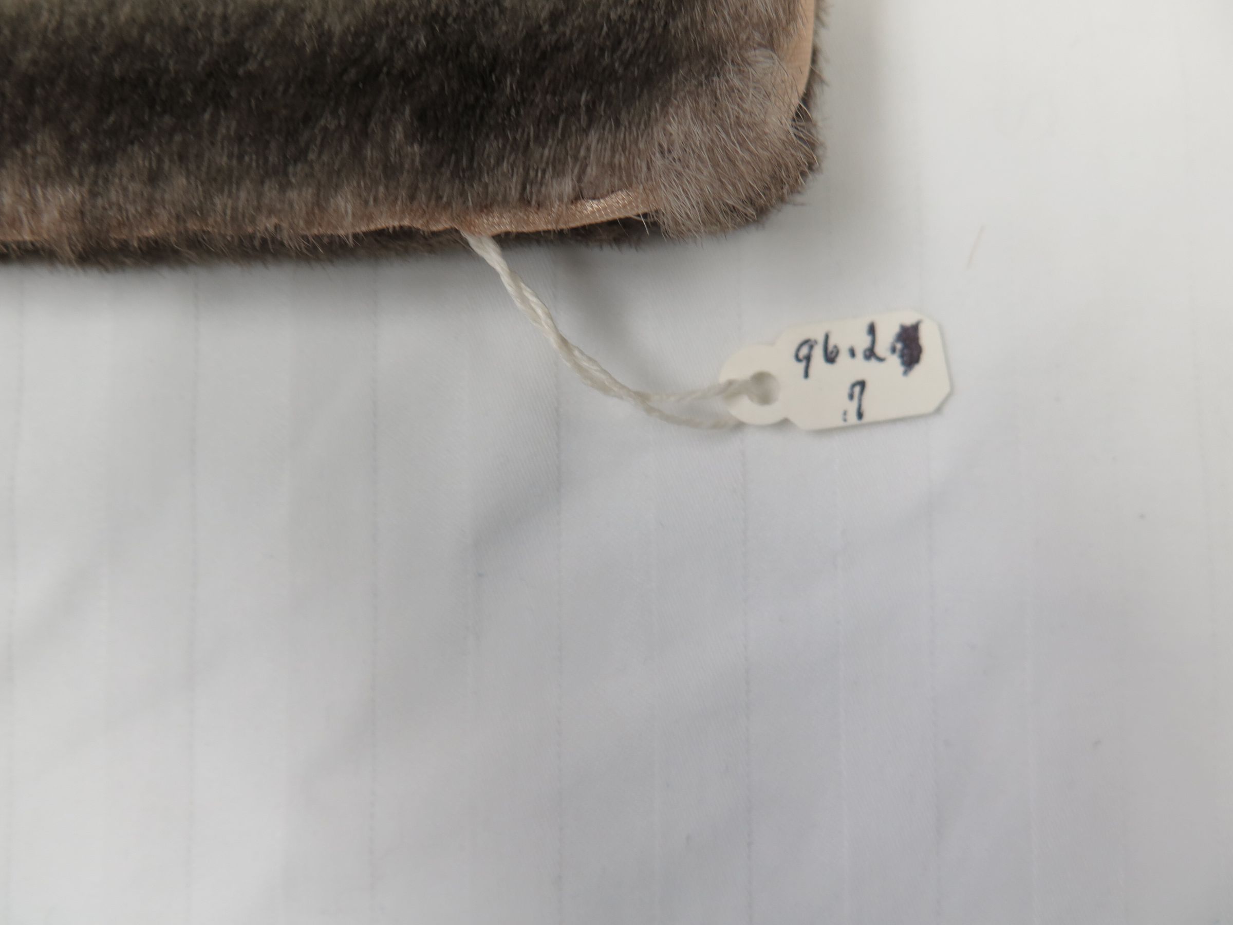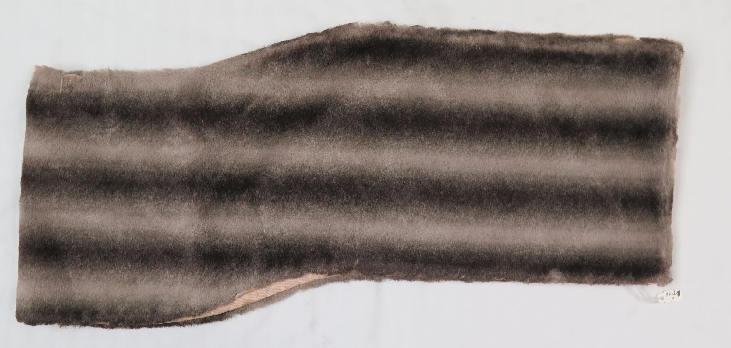 This is a brown fake fur stole. The stole has stripes running the length that alternate between dark and light brown. The stole measures 16" (w) x 42" (l).