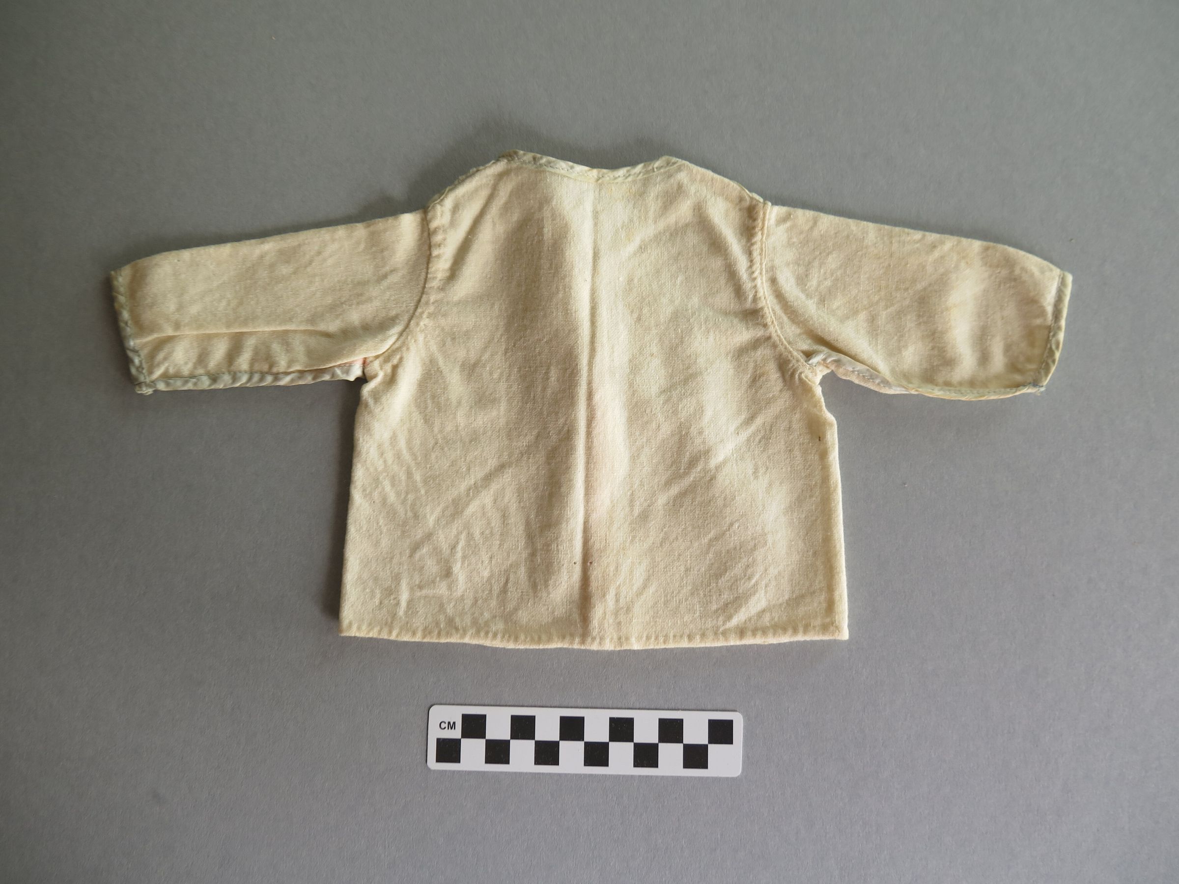 Child's off-white flannel jacket. The trim of the jacket is a faded blue. The jacket measures 8" (w) x 16" (l).