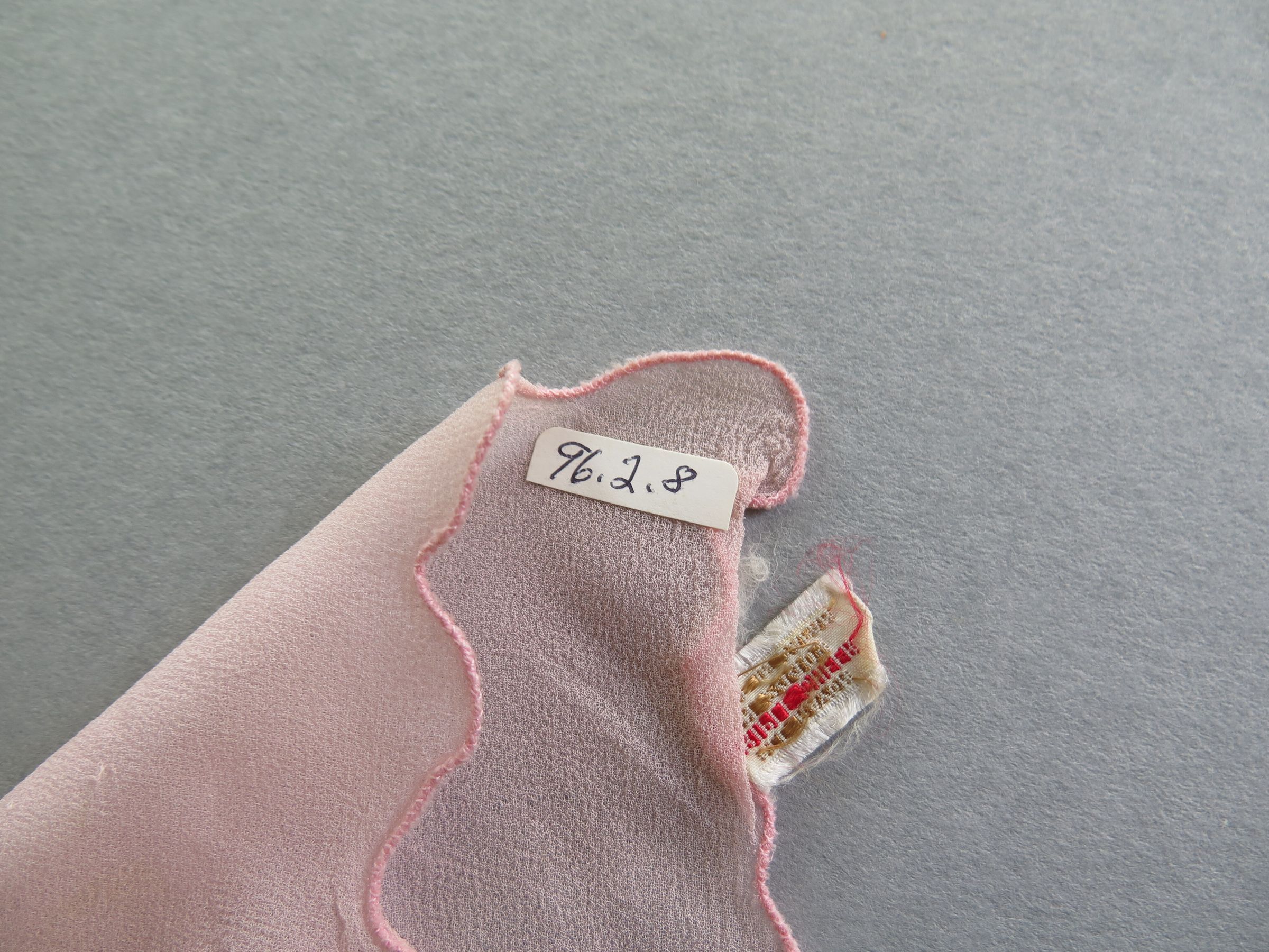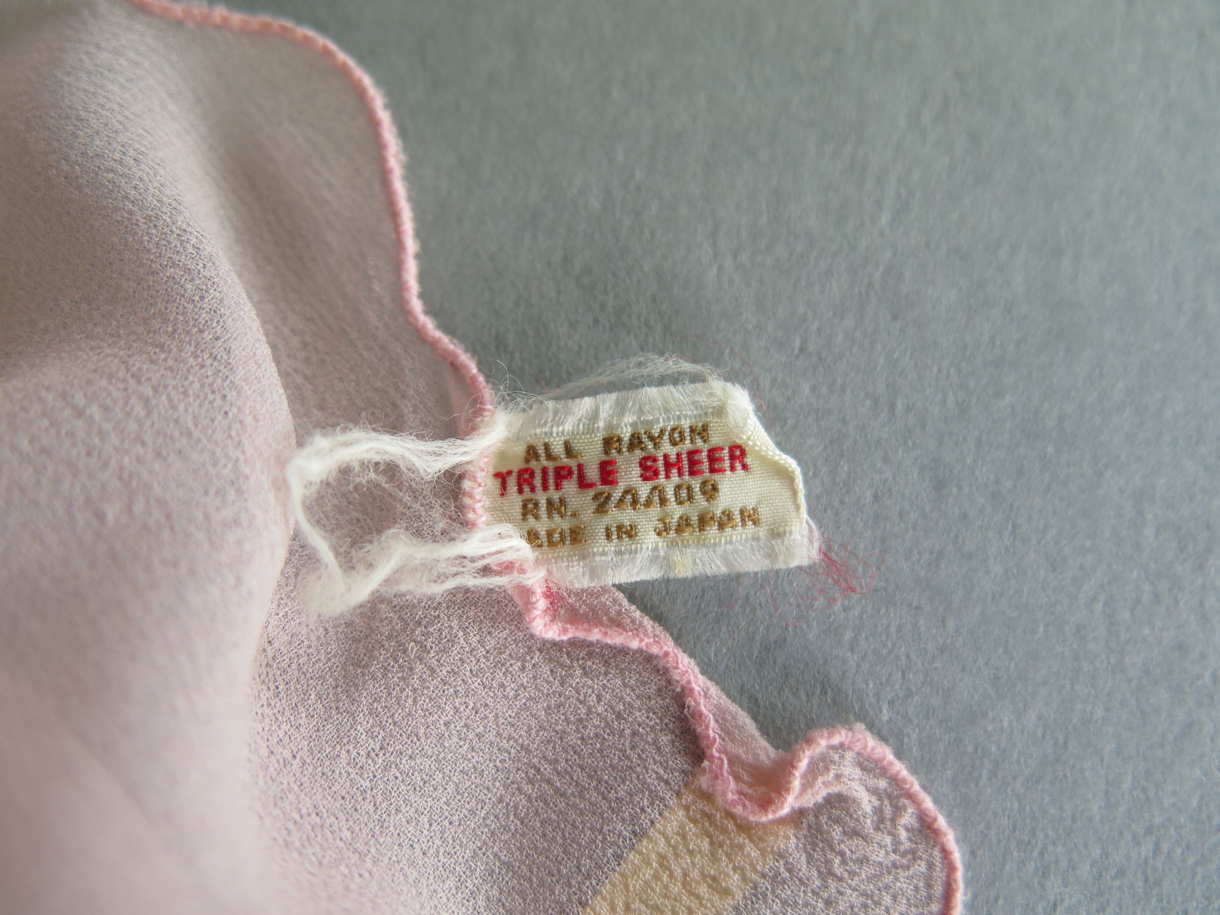 Pink rayon scarf of piece of cloth. The edges of the scarf are scalloped. The tag reads "All Rayon Triple Sheer RN 24408(?) Made in Japan." Scarf measures 8" (w) x 10" (l).