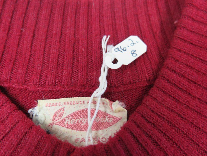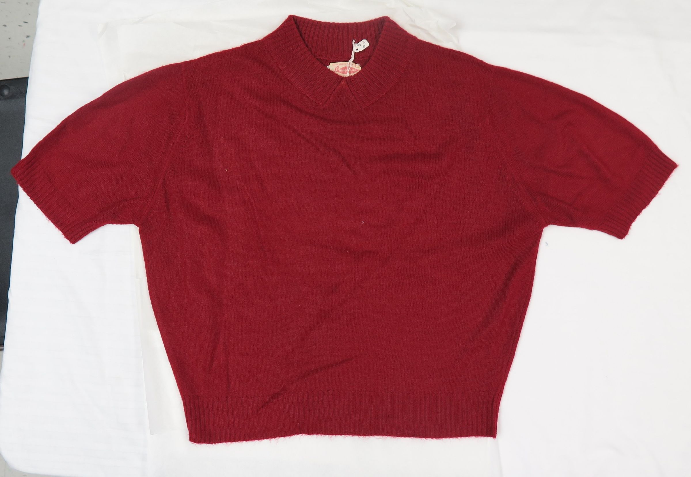 Wine colored women's sweater with short sleeves and a shirt collar neckline. The sleeves and bottom have Rib Stitch. Tag on inside of neck says "Sears, Roebuck and CO. Kerrybooke is fashion. Sweater measures 16" (w) x 20.5" (l).Collection