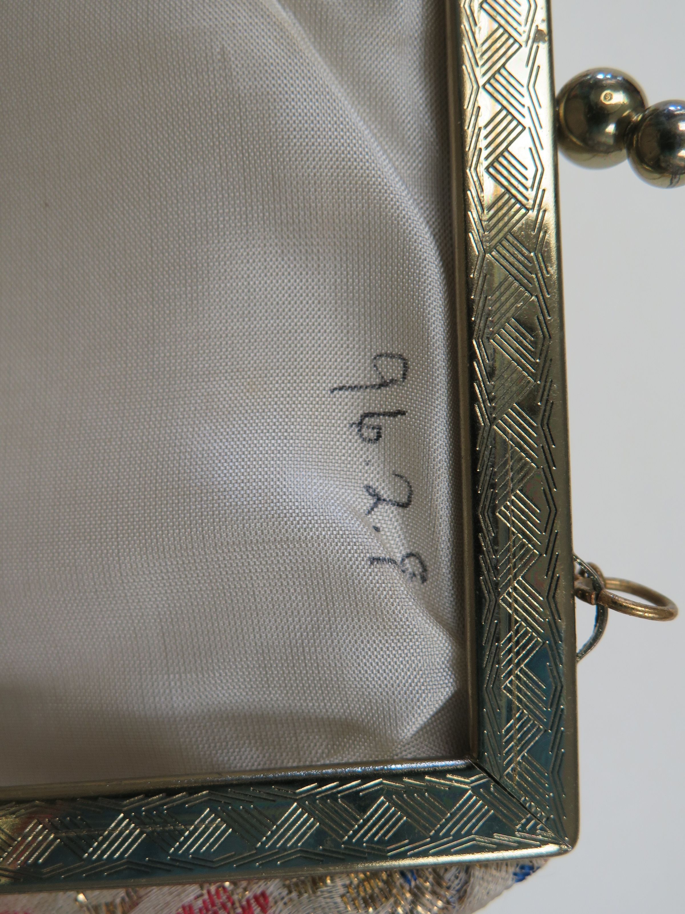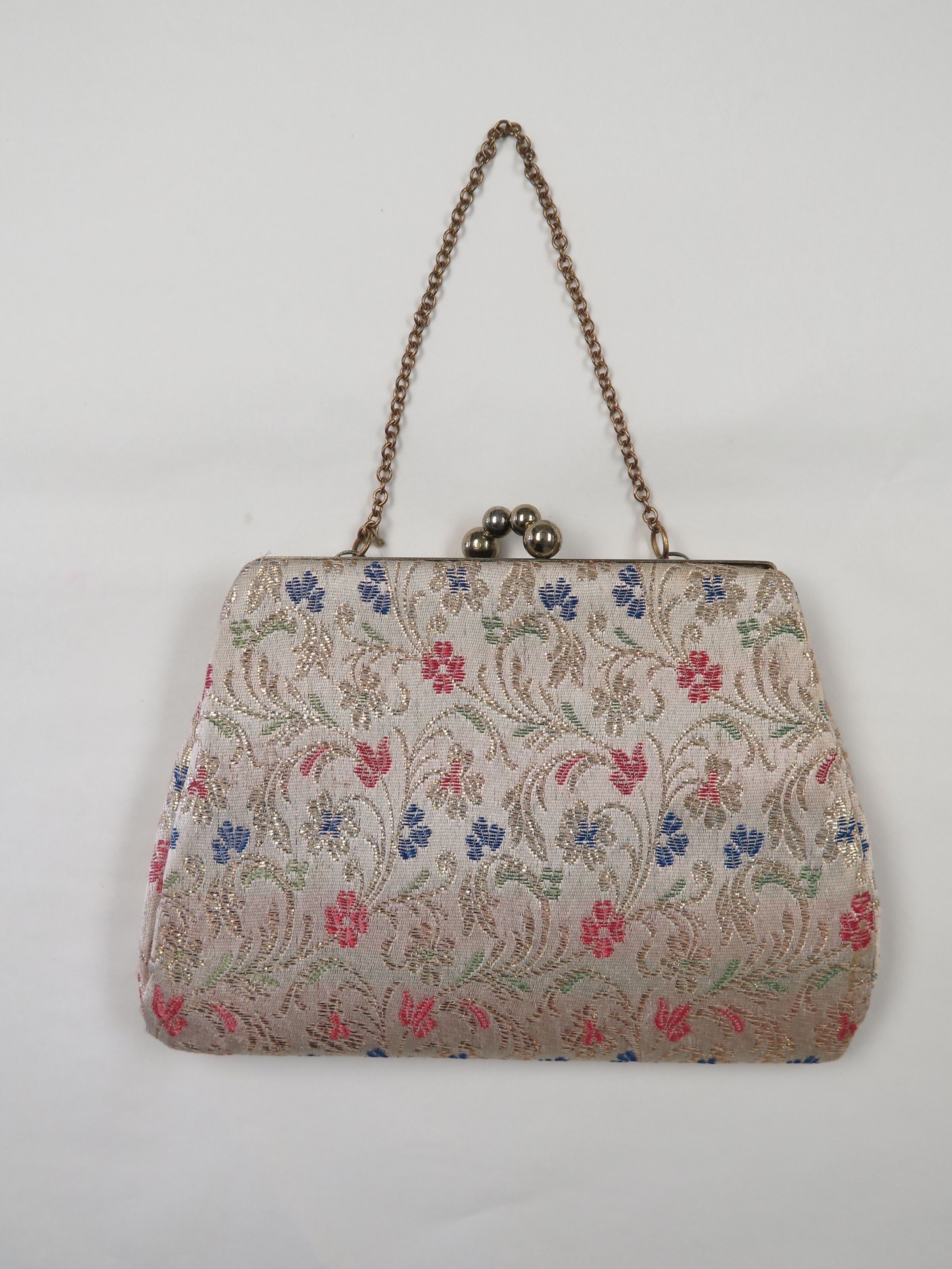 This is a purse with a metal chain and metal clasp on the top. The purse has a flower pattern with blue and pink flowers on the cloth. The purse measures 5.75" (h) x 7" (w) x 1" (d).