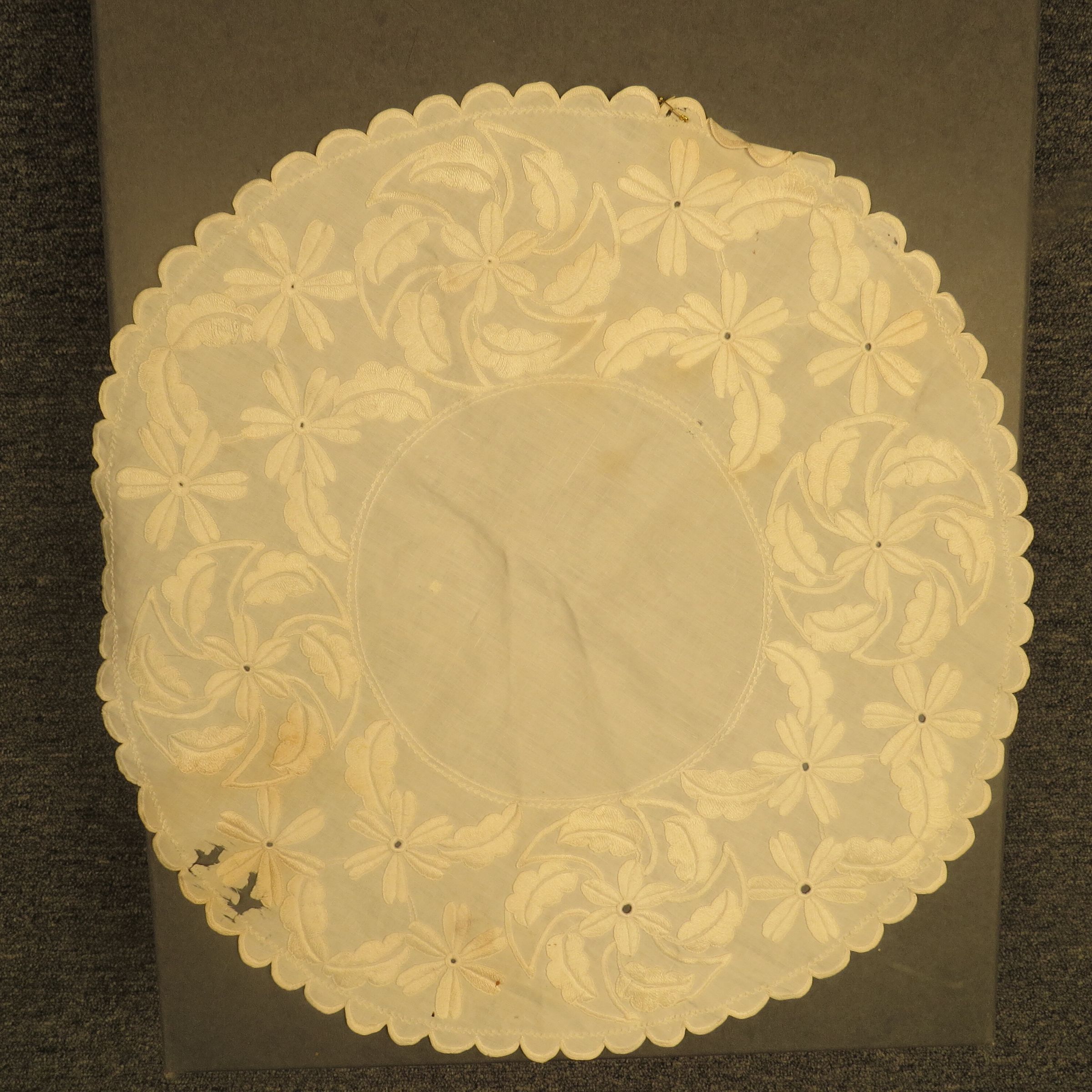 Round, white doily with a floral design around the outside. Doily measures 21" diam. Note: This was recommended for disposal by Megan Huelman in October 2013 (TTempleman 06/30/2017).