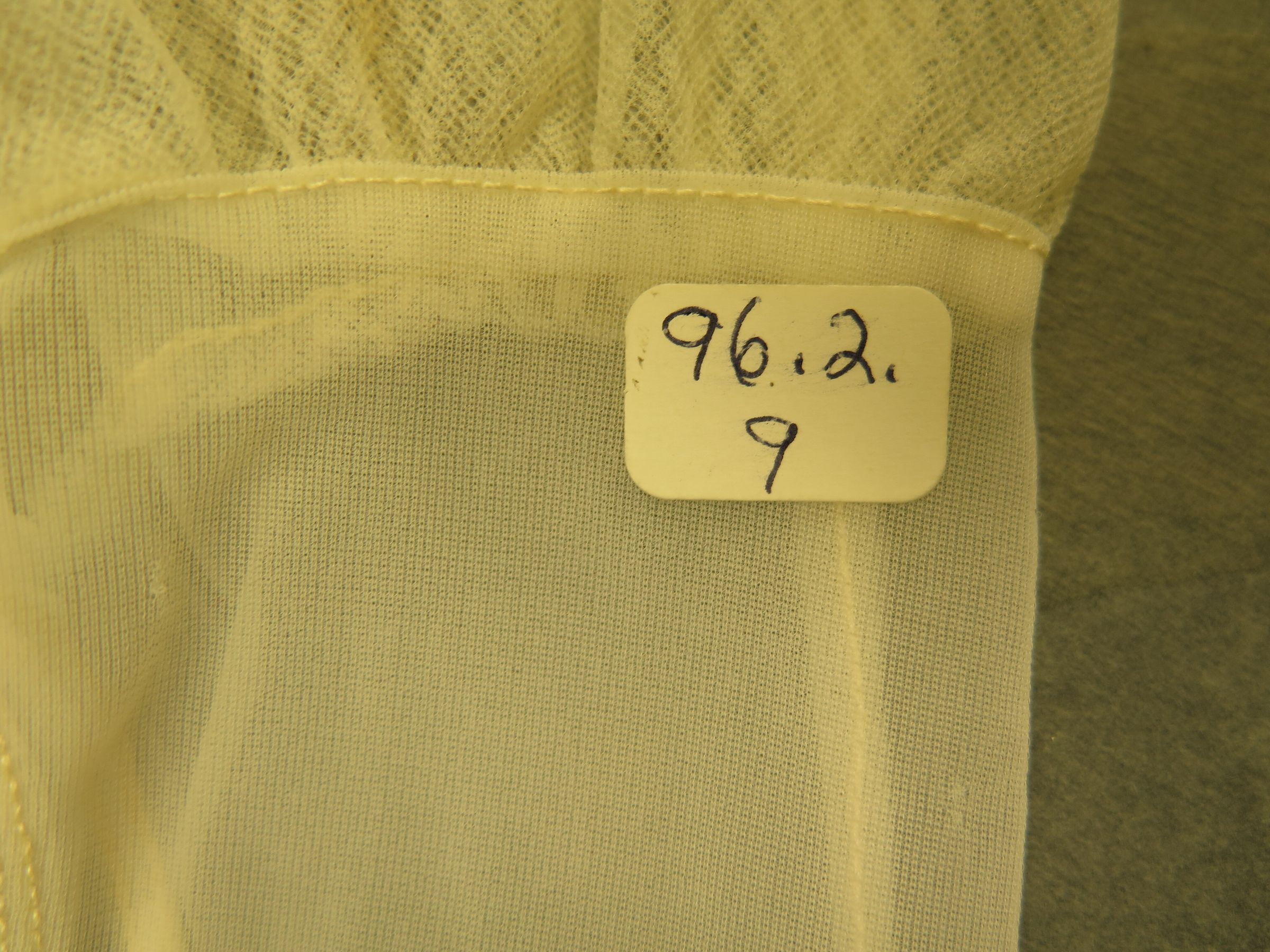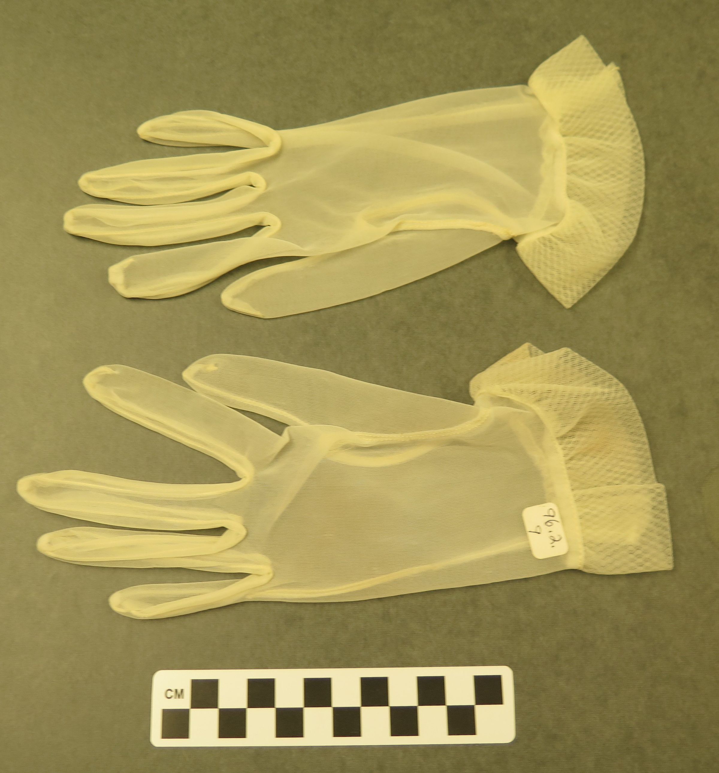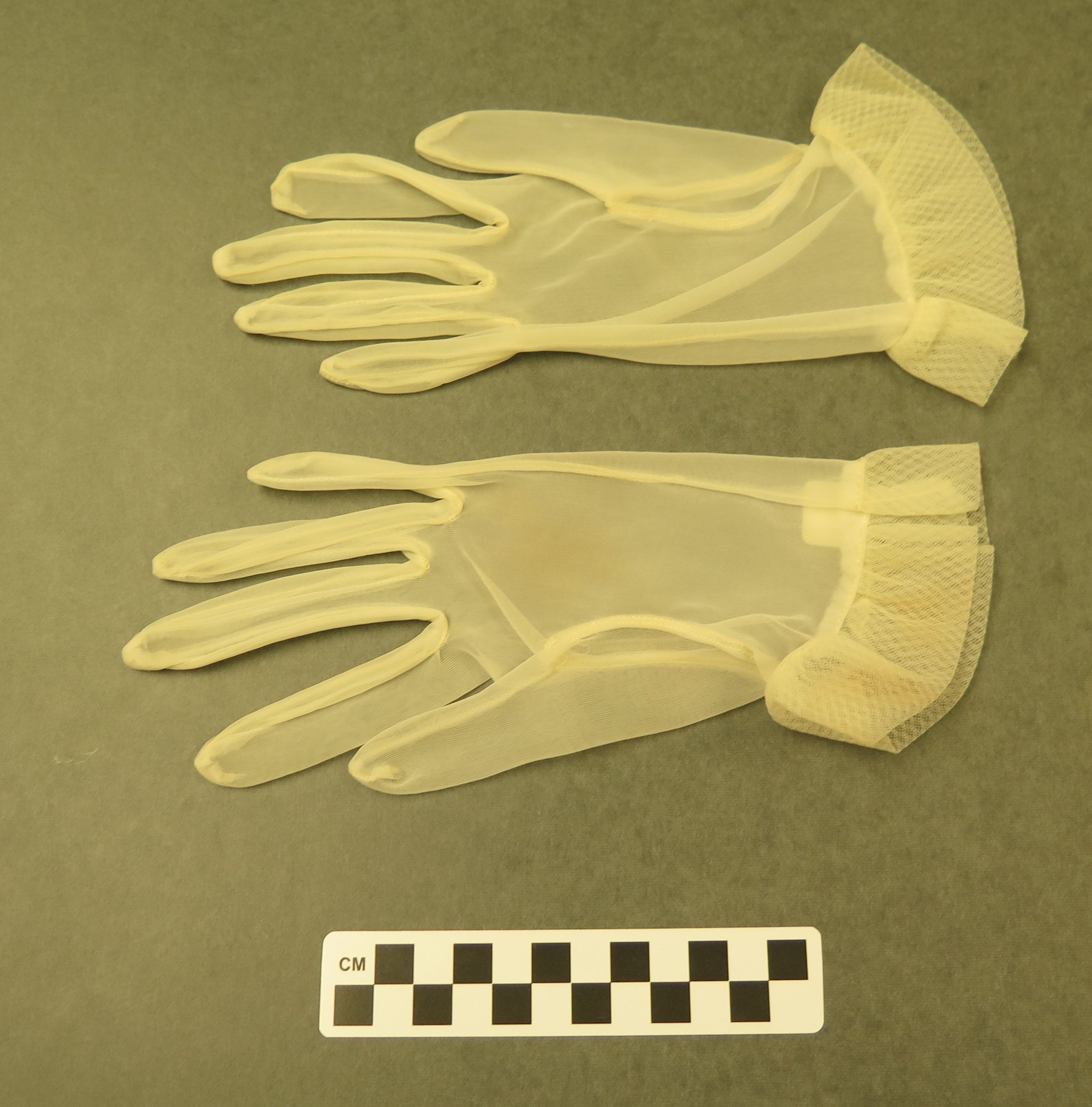This is a pair of sheer cream colored wrist length gloves. The gloves have ruffle trim at the wrist. Gloves measure 3" (w) x 9" (l).