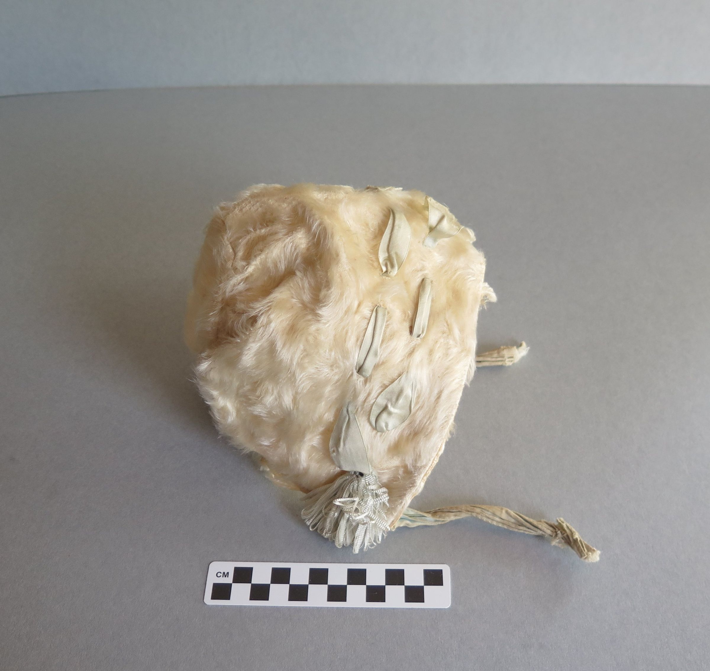 Baby's bonnet with fake fur and light green details. There are light green tassels hanging from either side as well as green stings to tie the bonnet closed at the bottom of each side. The bonnet measures 7" (w) x 8" (l).