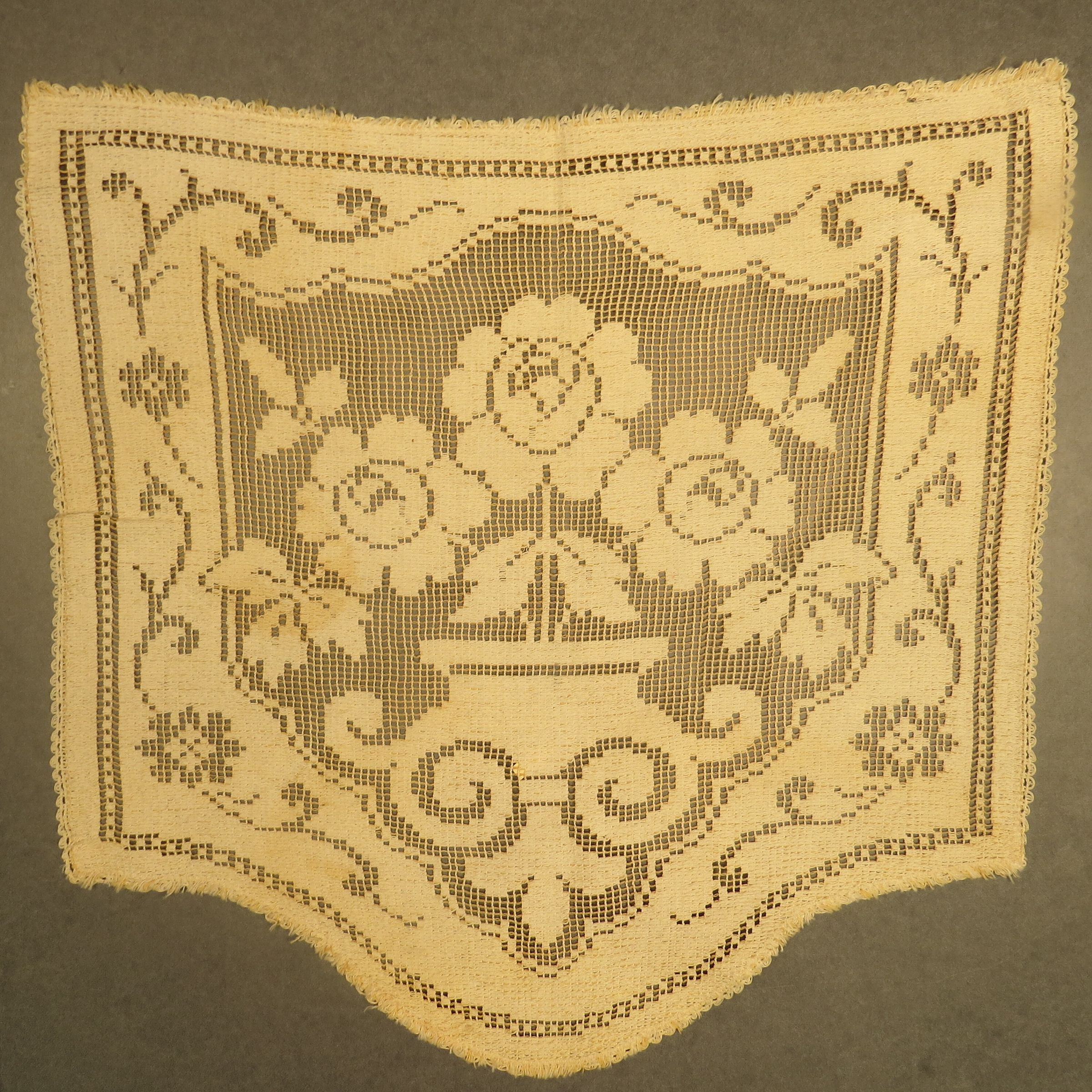 White doily with a flower design. Doily measures 14" (w) x 15" (l).