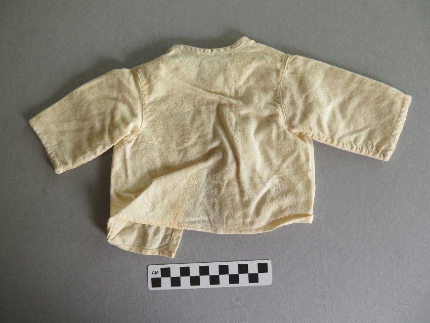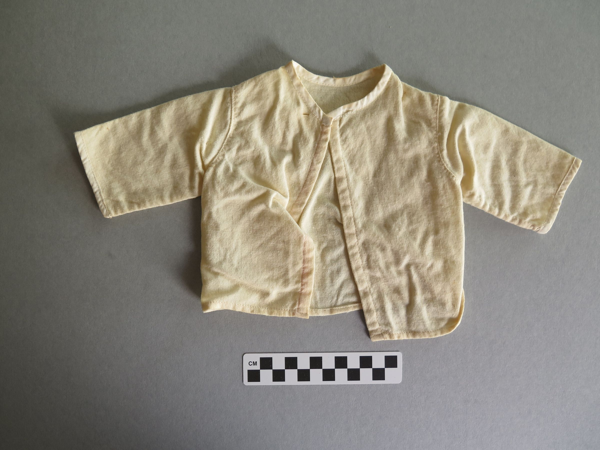 Chil'd off white jacket, could possibly doll clothes. The jacket measures 8" (w) x 16" (l).