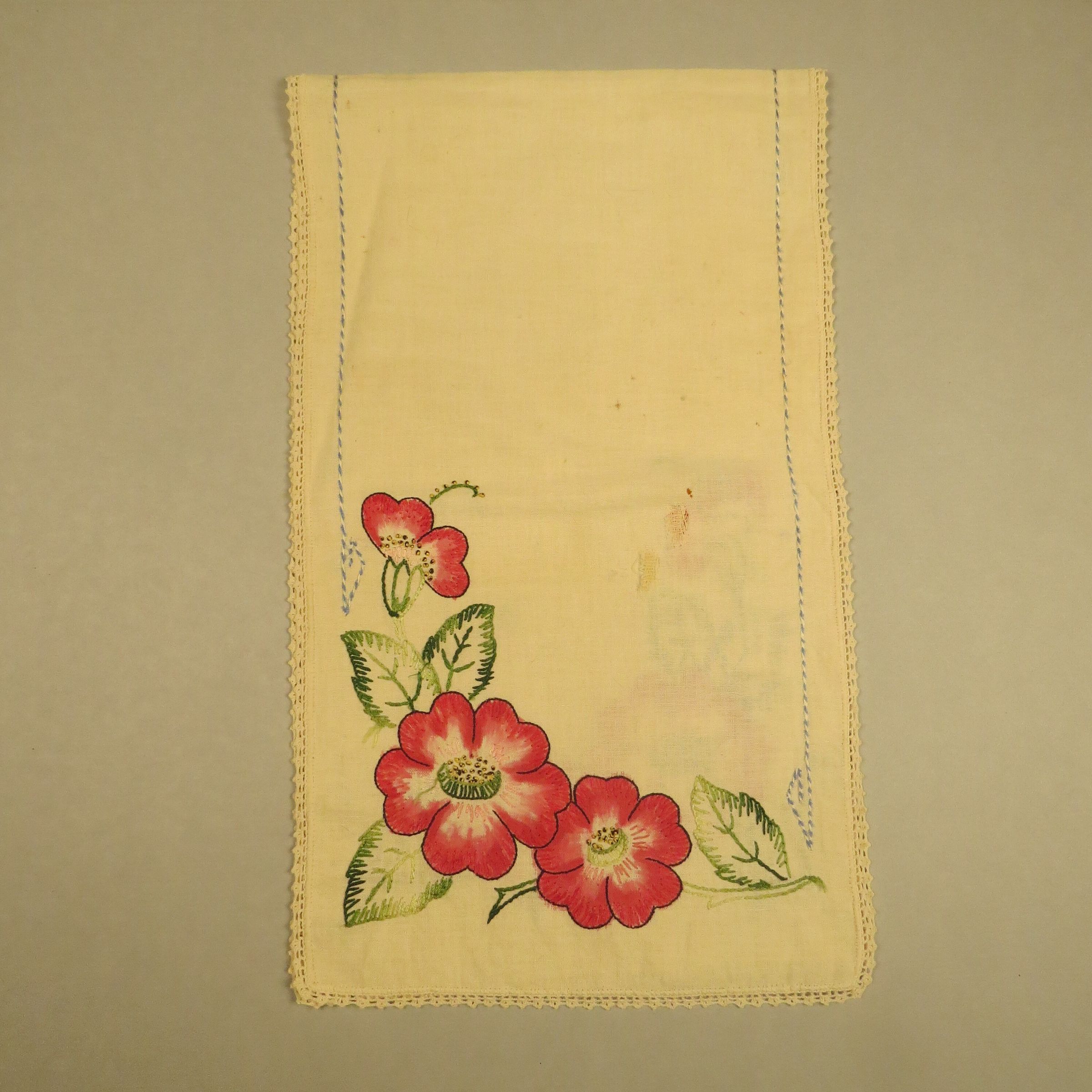 Furniture runner is a white color with red flowers and green leaves in the bottom corners. The edges are scalloped and the border of the furniture runner is a light purple or blue color. Furniture Runner measures 13" (w) x 40" (l).Collection