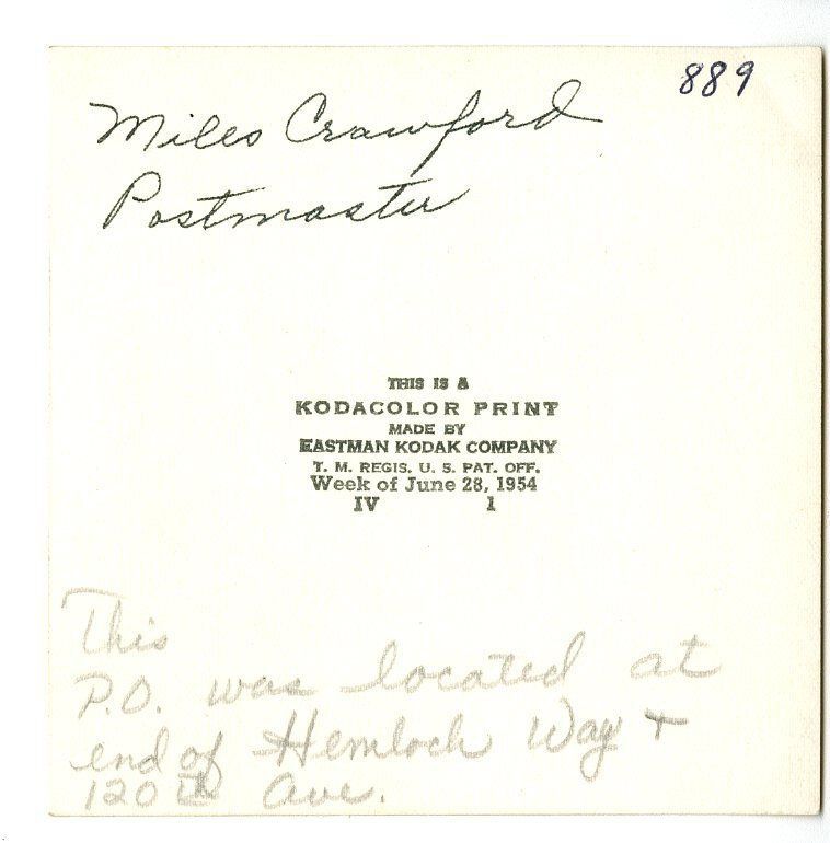 Miles Crawford with two bags of mail in front of the Broomfield Post Office. Post Office location was at the end of Hemlock Way and 120th. Original
