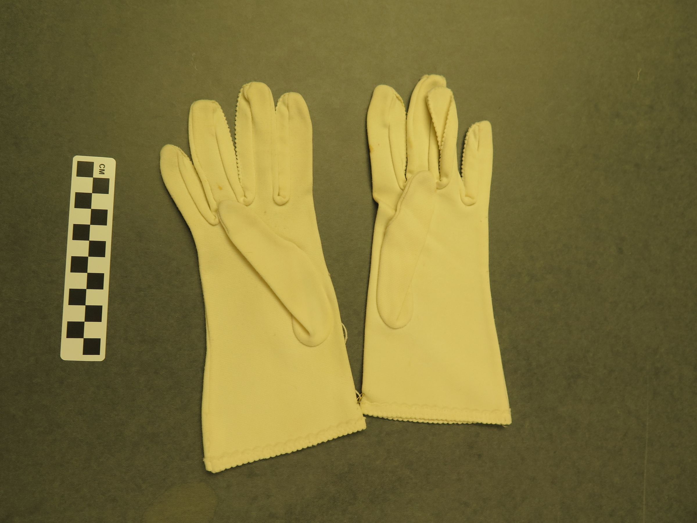 This is a pair of white nylon gloves with a scalloped and a single line on the top of the hand. One of the gloves has 2 brown stains on the back of the hand. The gloves measure 9" (w) x 4" (l).