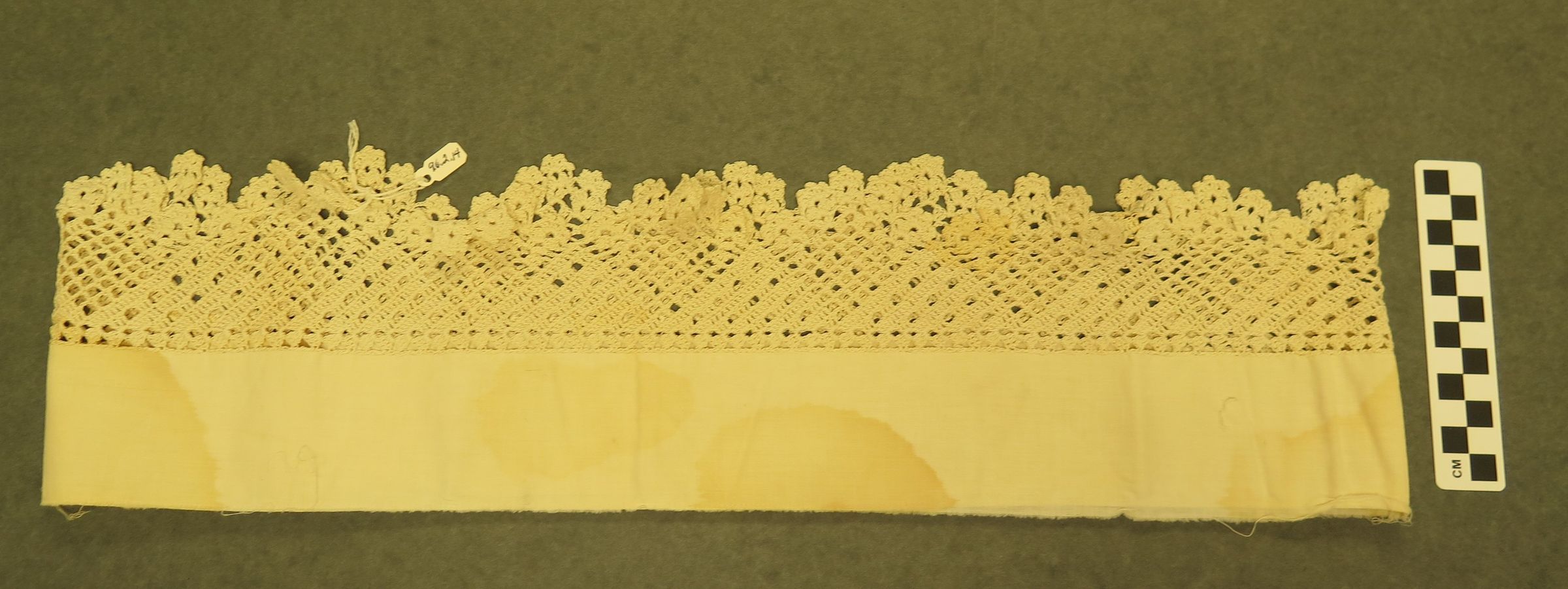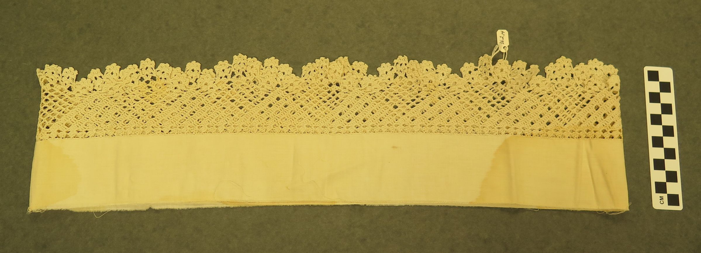 This is a piece of white cotton with crochet lace at the end. The cotton has been sewn together to make a circle. The lace may have been for a pillow edge. Lace measures 3" (w) x 40" (l).