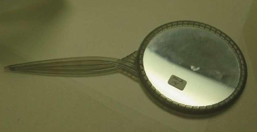 This is a round hand-held mirror with a clear plastic frame. There is a sticker on the mirror with the Object ID on it. The mirror measures 4.5" (w) x 11" (l).