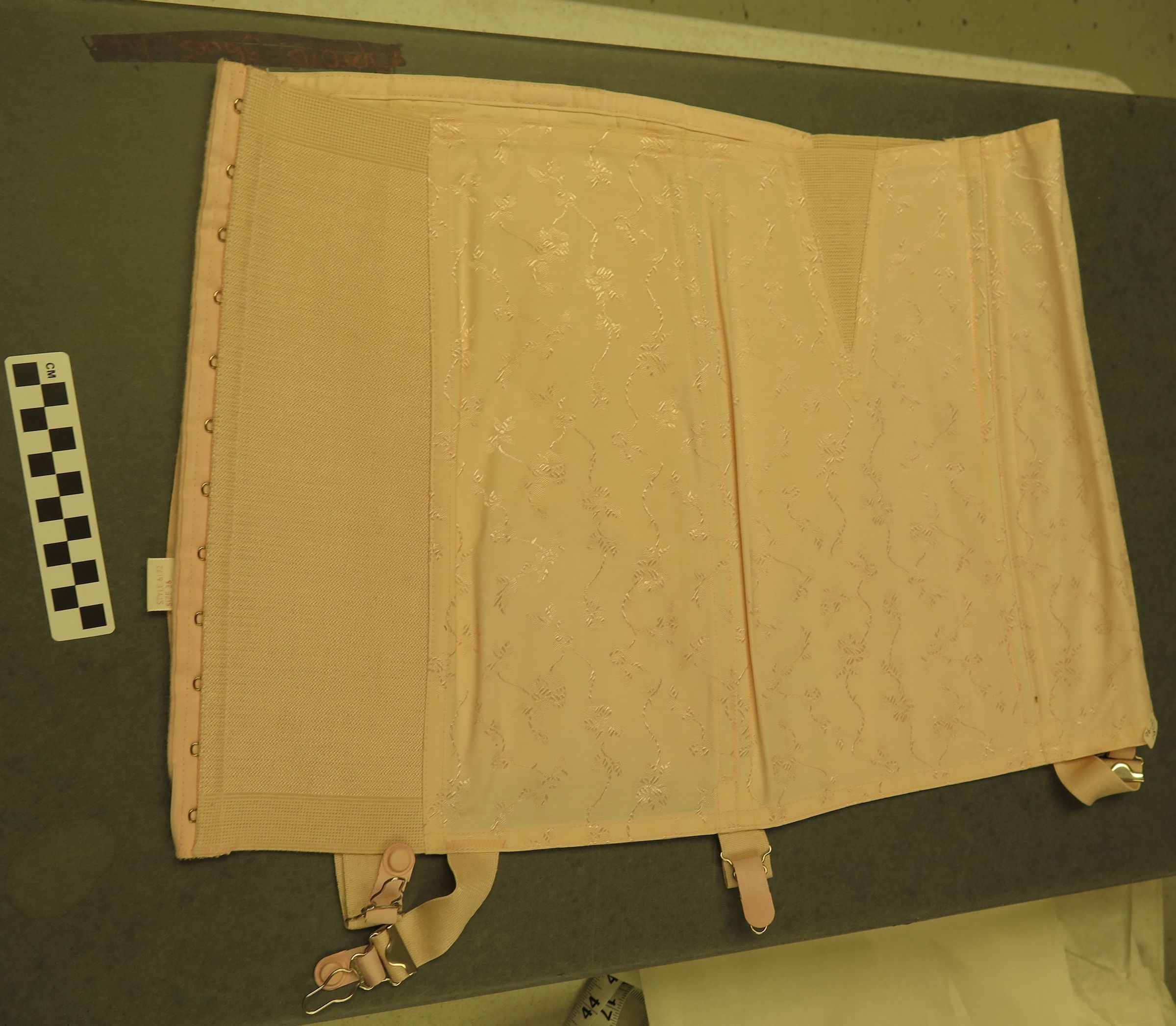 This is a pink Carol Brent brand girdle in size 36. The girdle is made of 60% cotton and 40% rayon. The elastic is made of cotton, rayon, and rubber. The girdle has a floral pattern on it. The corset measures 14" (w) x 40" (l).