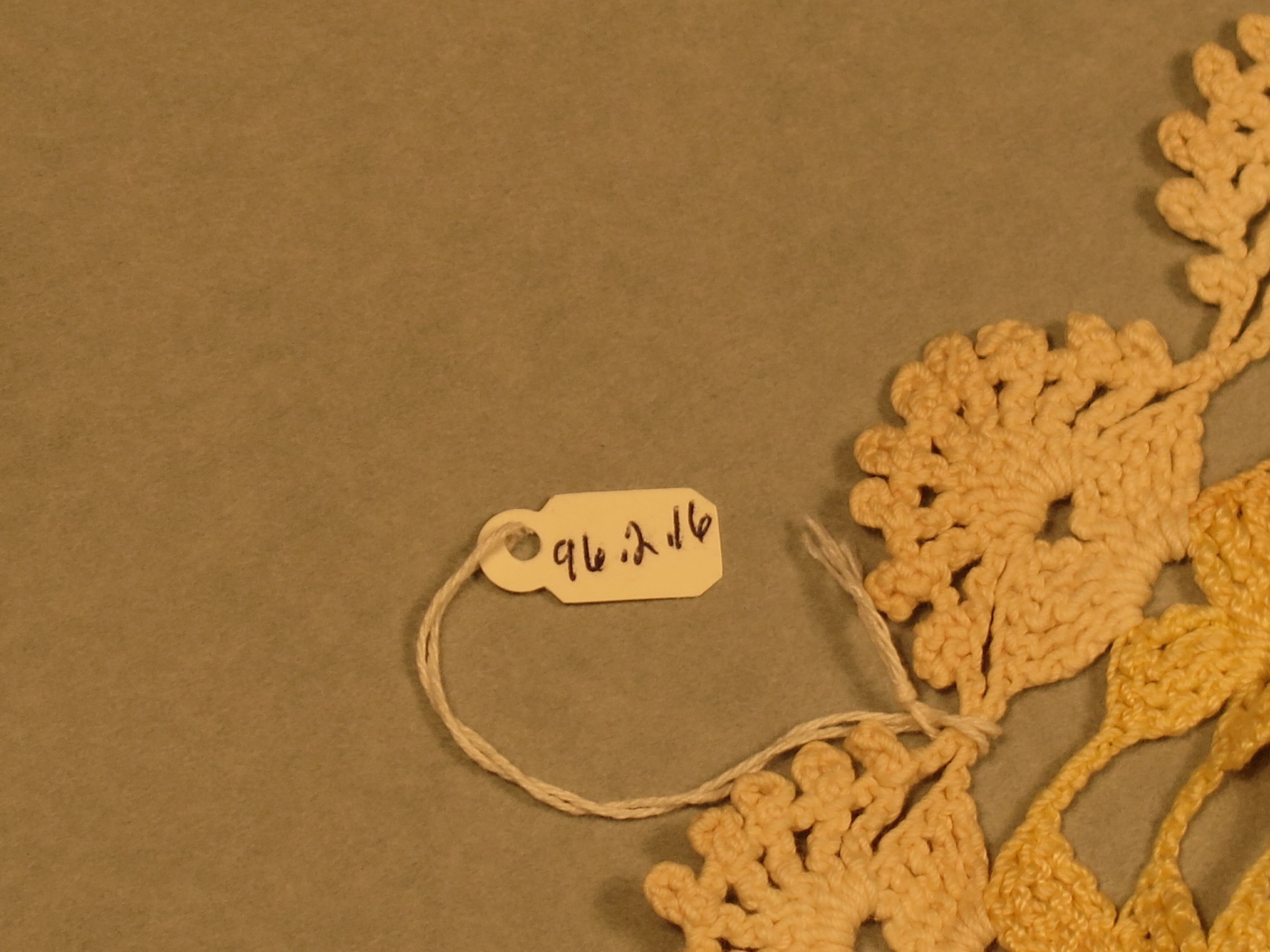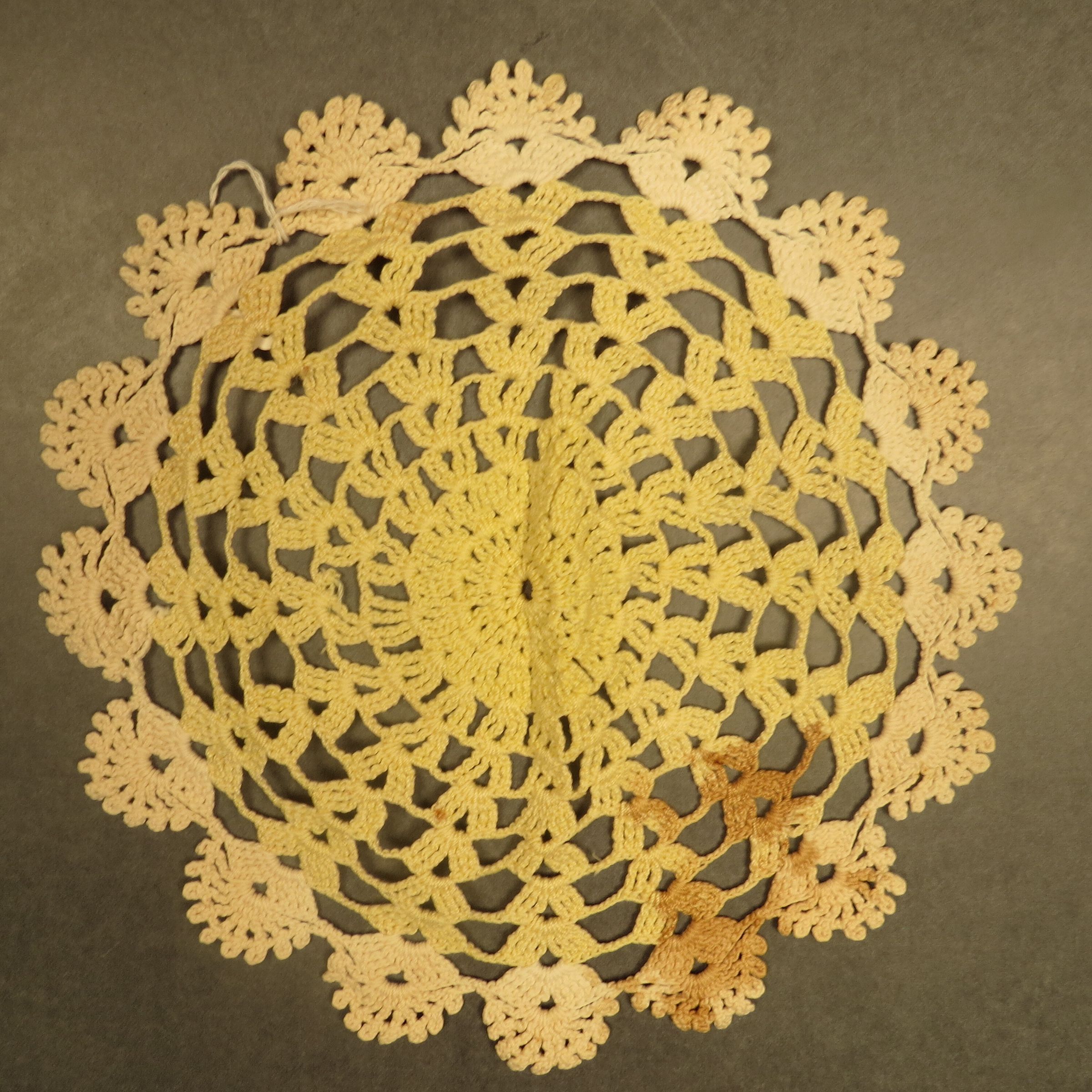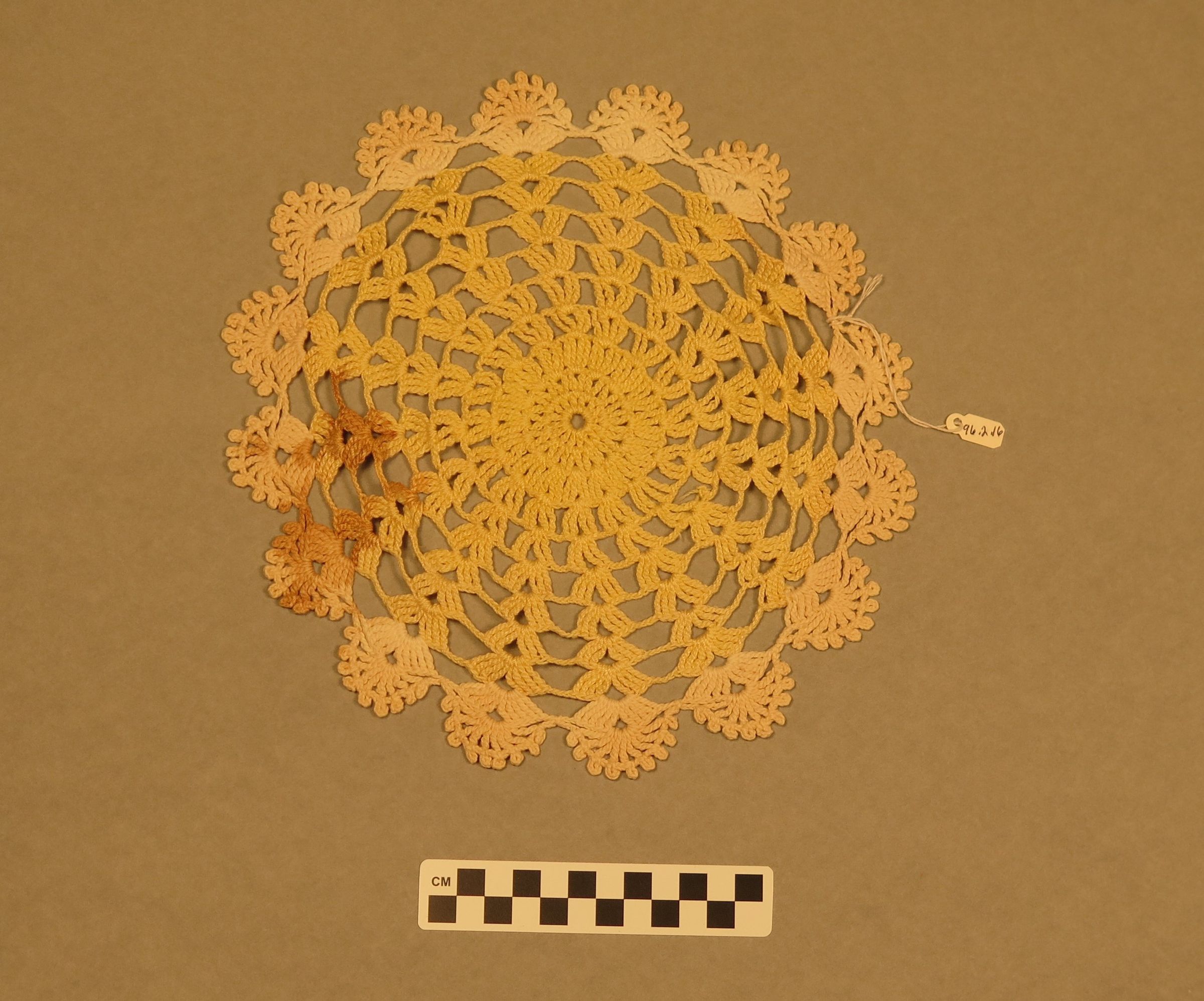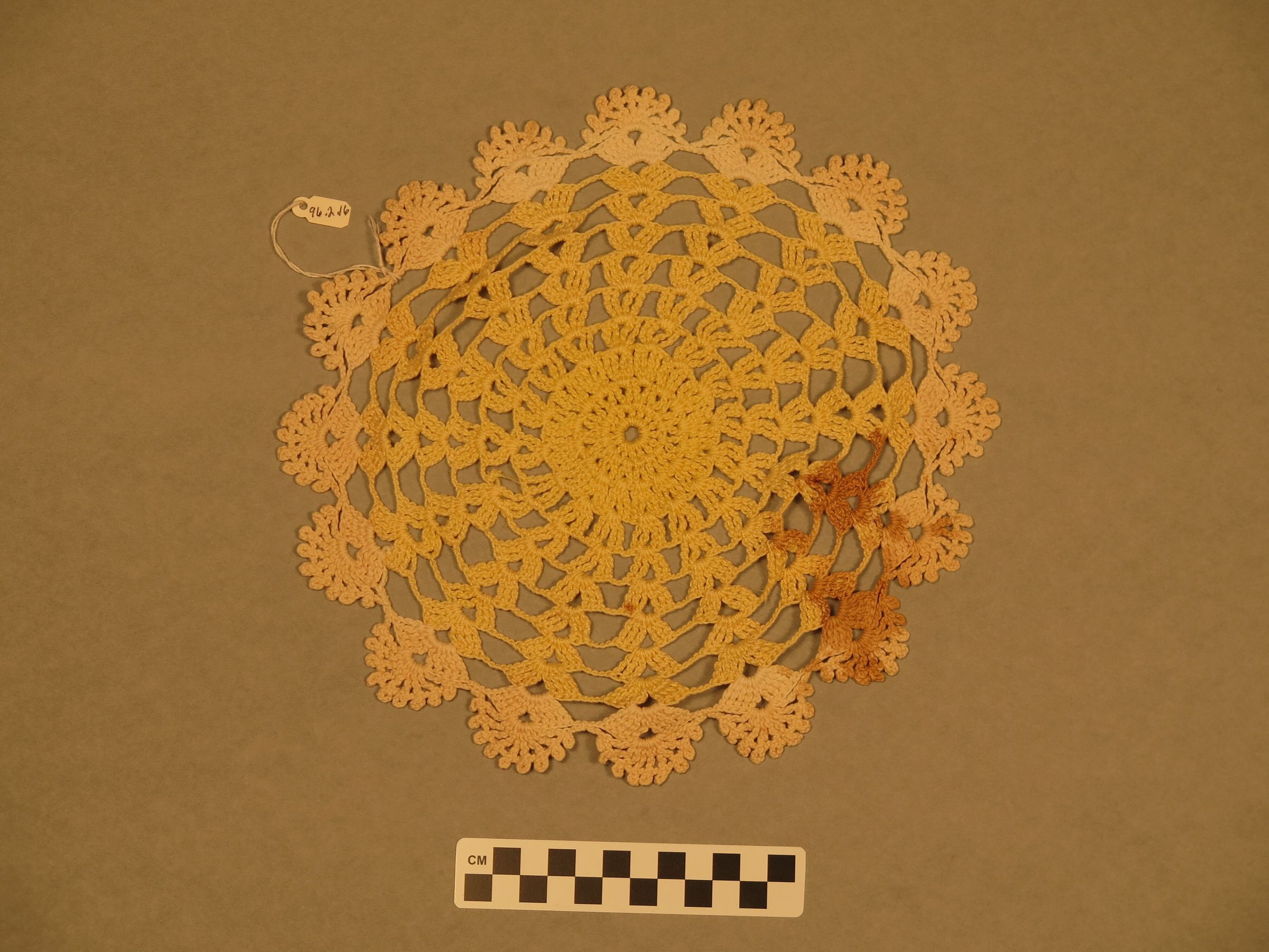Roundyellow doily with white trim. The edges are scalloped. The doily measures 10" diam.