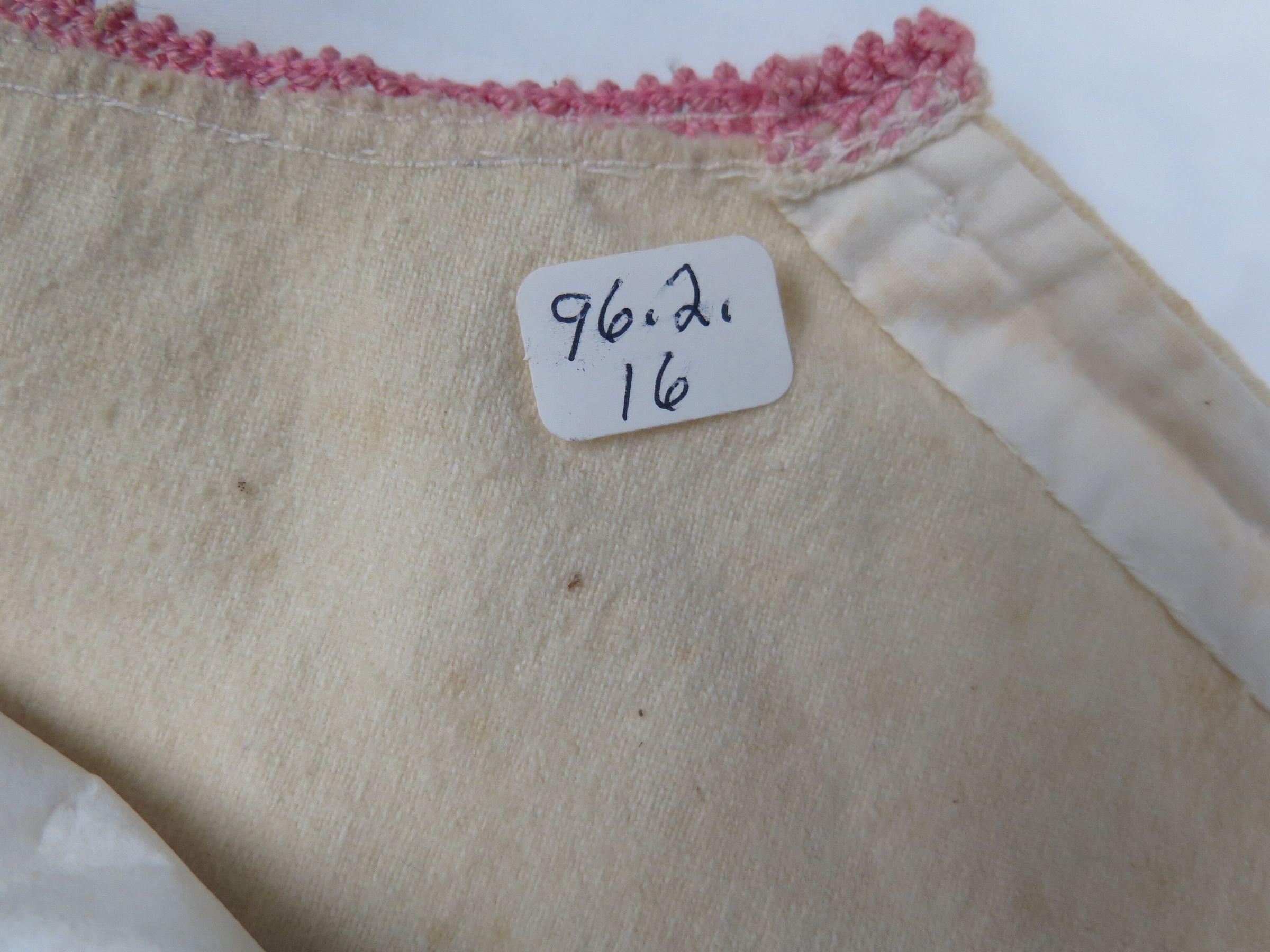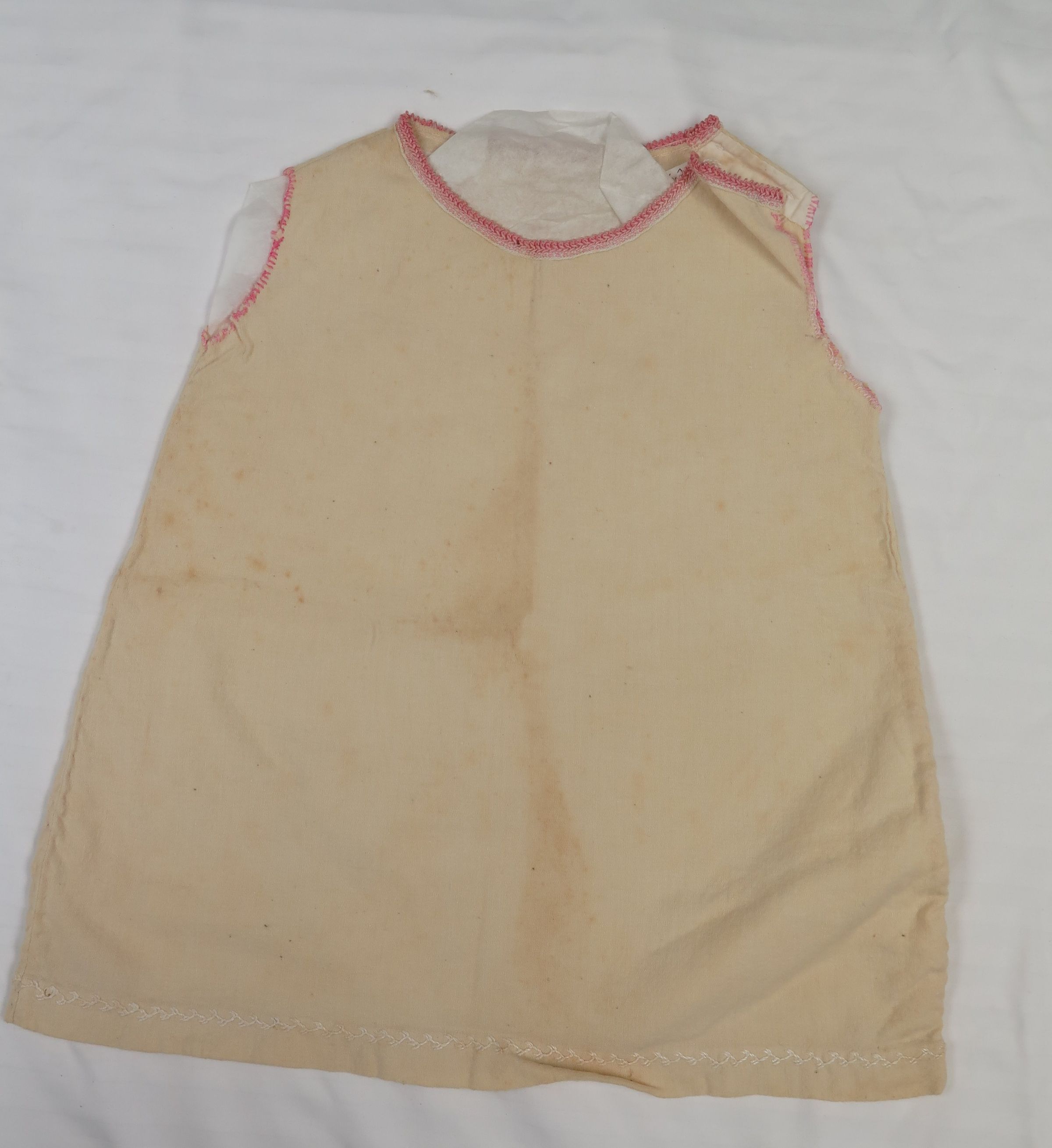 Baby's sleeveless flannel slip. Pale pink or off white color with pink trim along the sleeves and the neck. The bottom has white trim. Looks as though it would have clasped on the left shoulder, being that is it sewn open. Slip measures 9.5" (w) x 17" (l).Collection