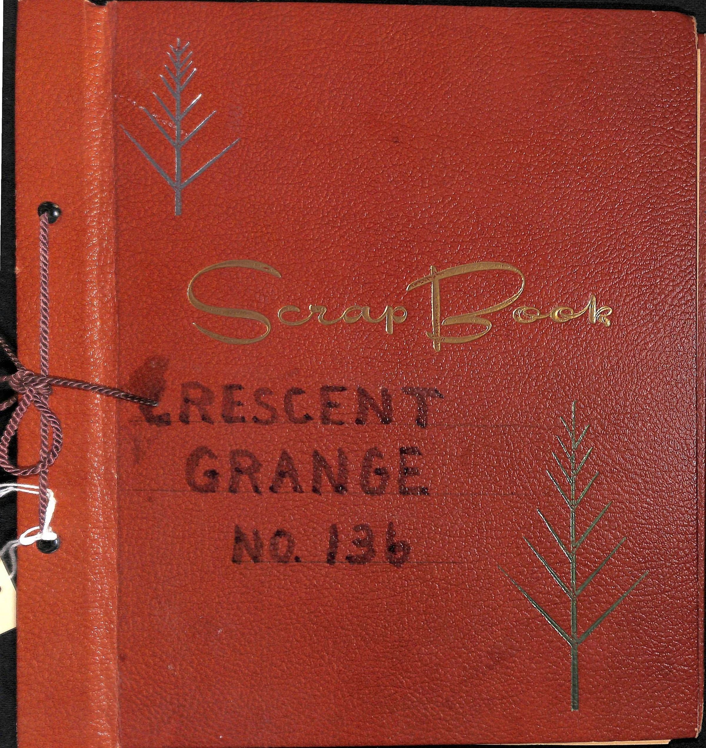 Item is a large hard-cover scrap book from the Crescent Grange, an organization that served as a means of social gathering for early Broomfield residents. The cover is red with gold, silver, and green accents, and the words "Crescent Grange No. 136" are written on the front. The pages are bound together by string. A detailed index within the scrapbook indicates which items are present on each page, and the snippets are sectioned out in periods of three months. Included is information in the form of newspaper clippings, photographs, and newsletters from Grange members.Collection