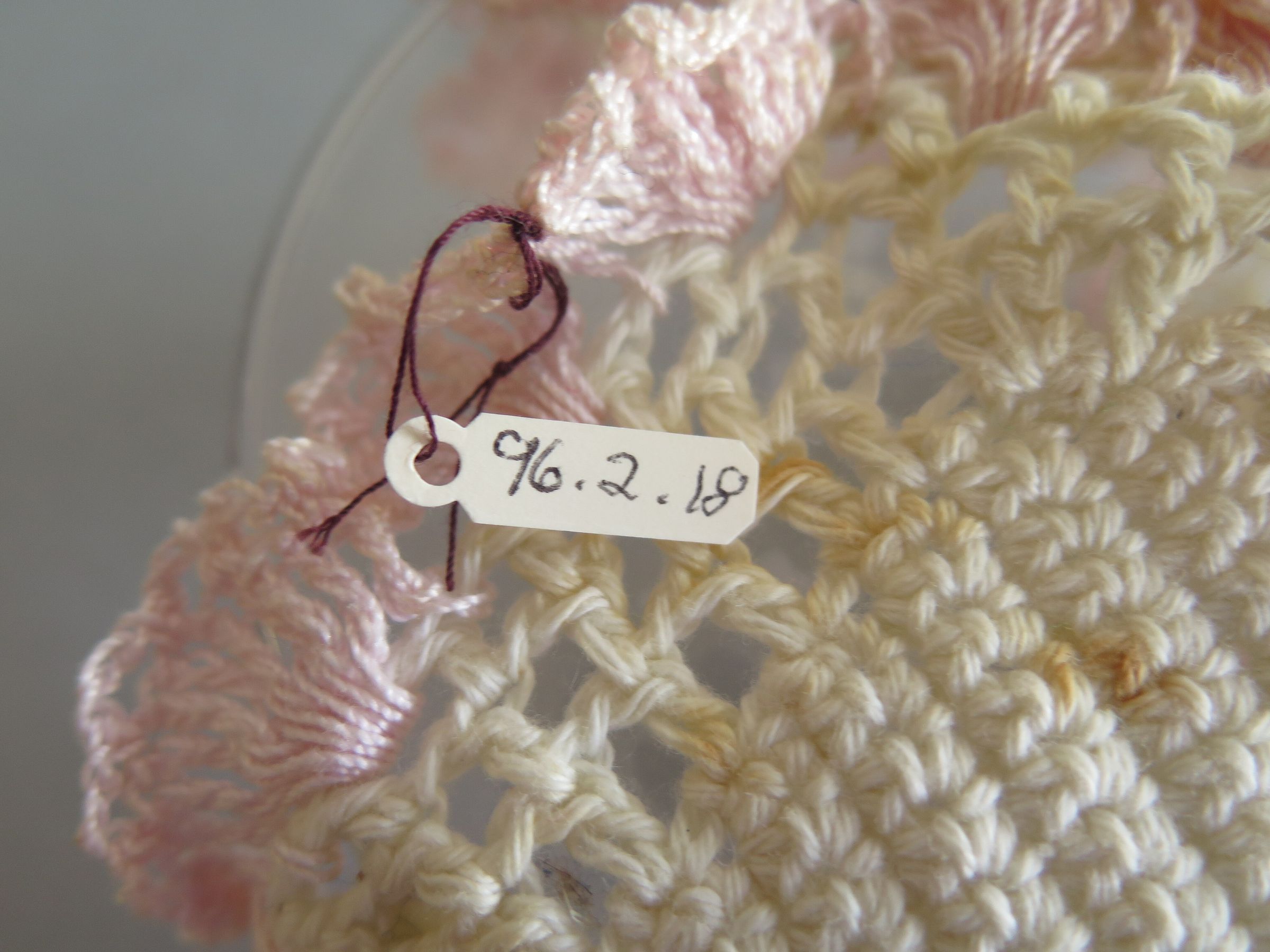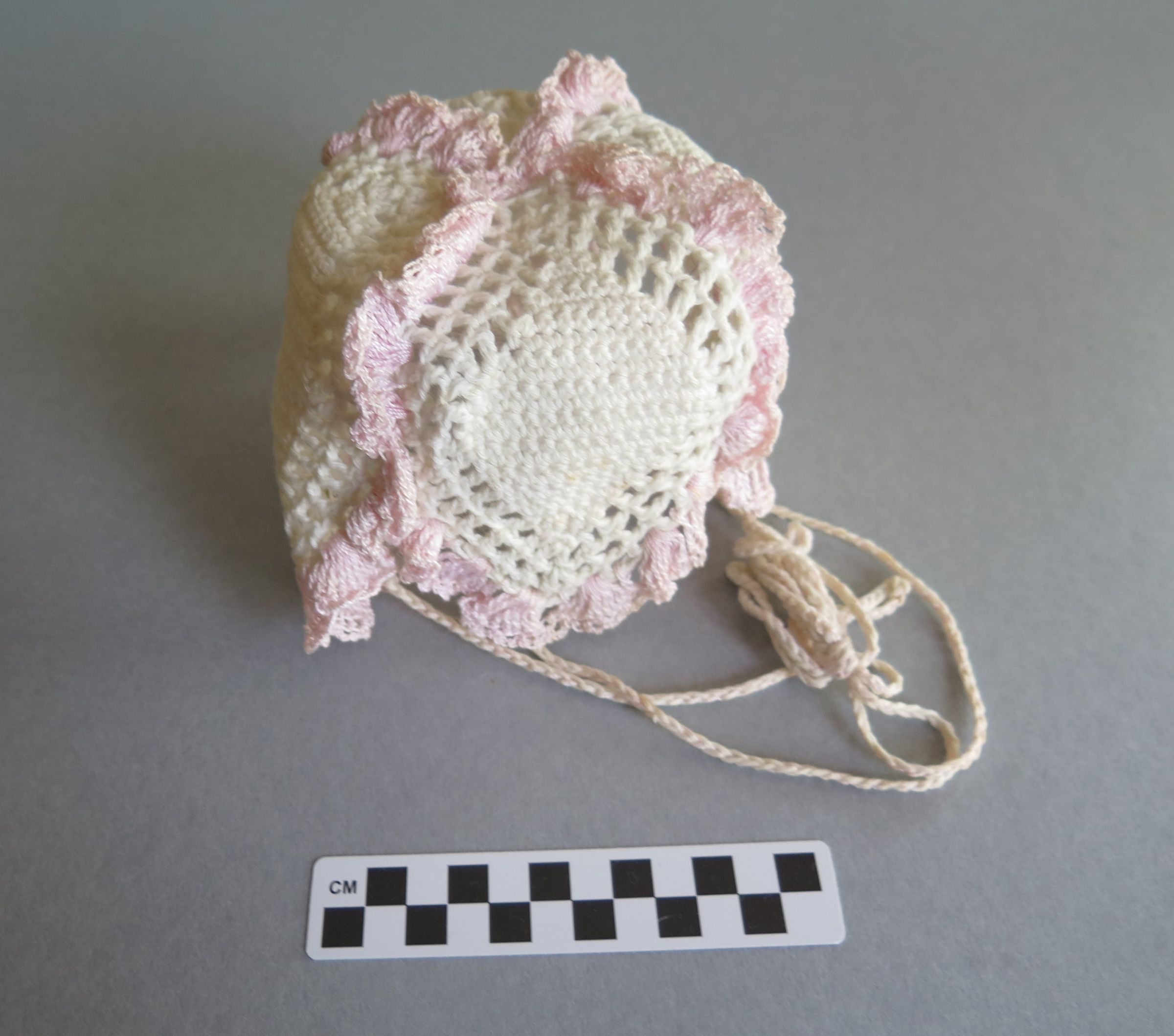 Crocheted baby bonnet or hanging planter. This is white with pink details around the scalloped edges. There are 4 stings that are all tied together that come off the bottom of this item. The item measures 5" (w) x 8.5" (l).