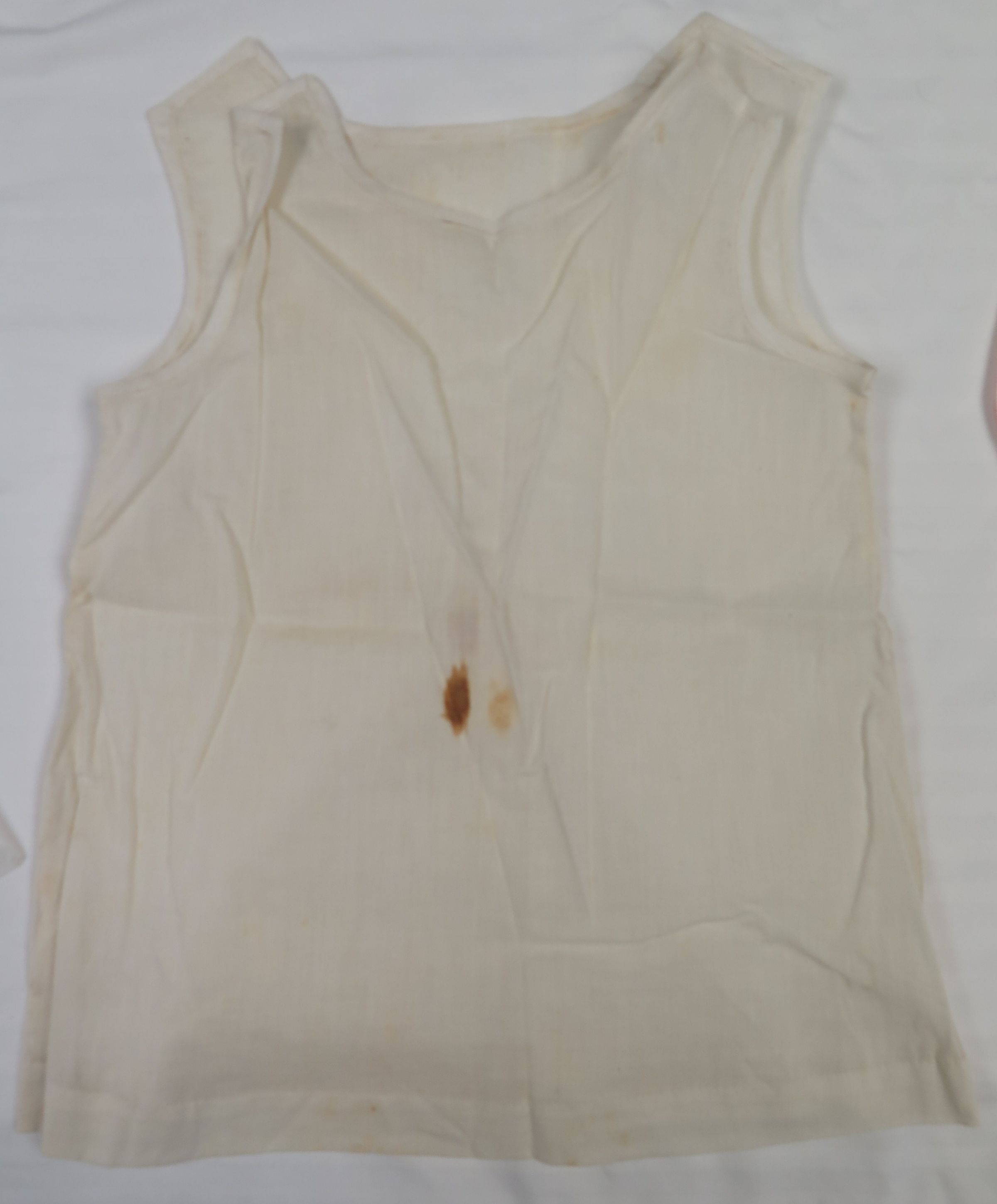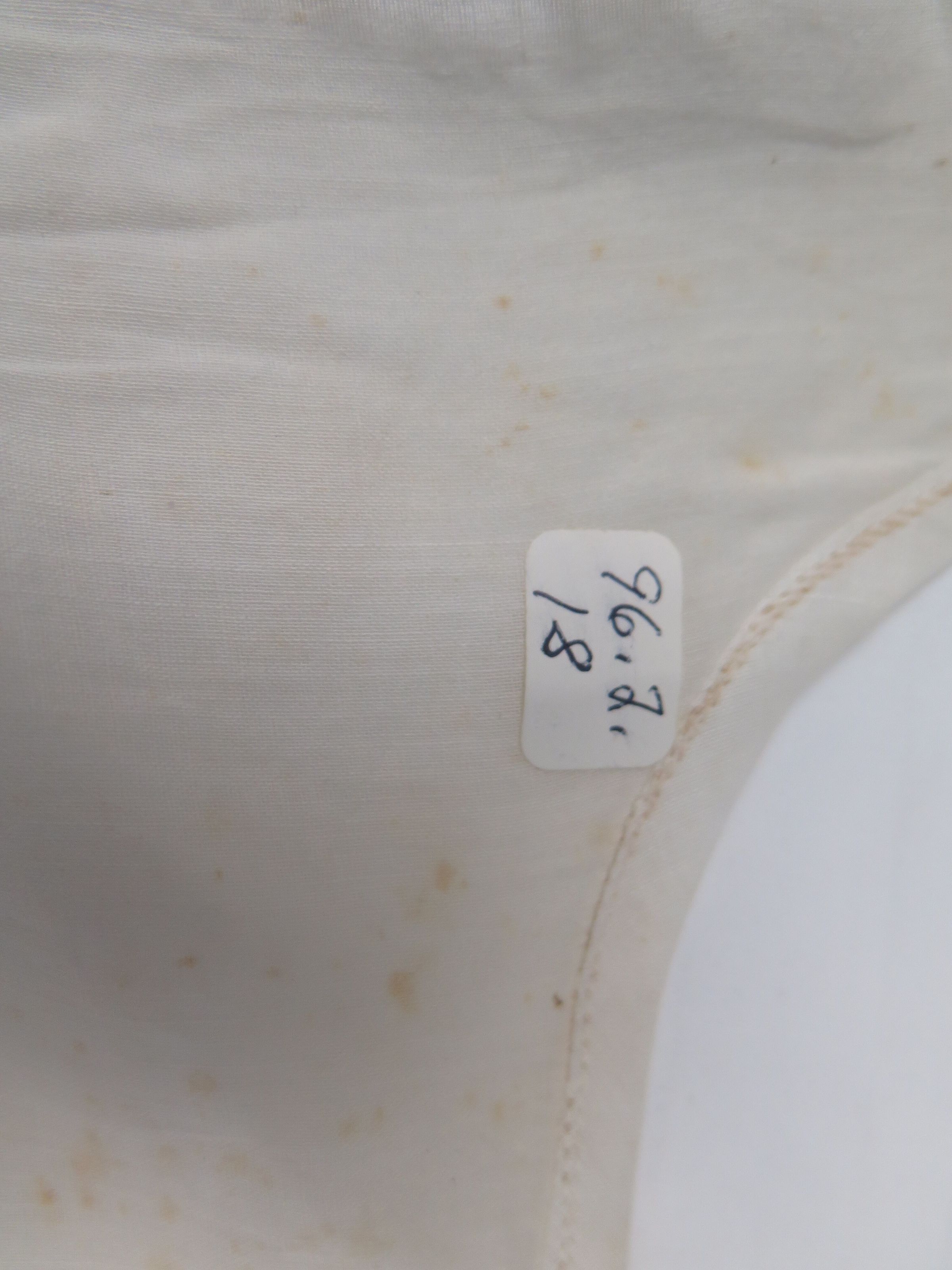 This is a white cotton baby slip. There is a brown stain on the front of the slip. The slip measures 11" (w) x 19" (l).