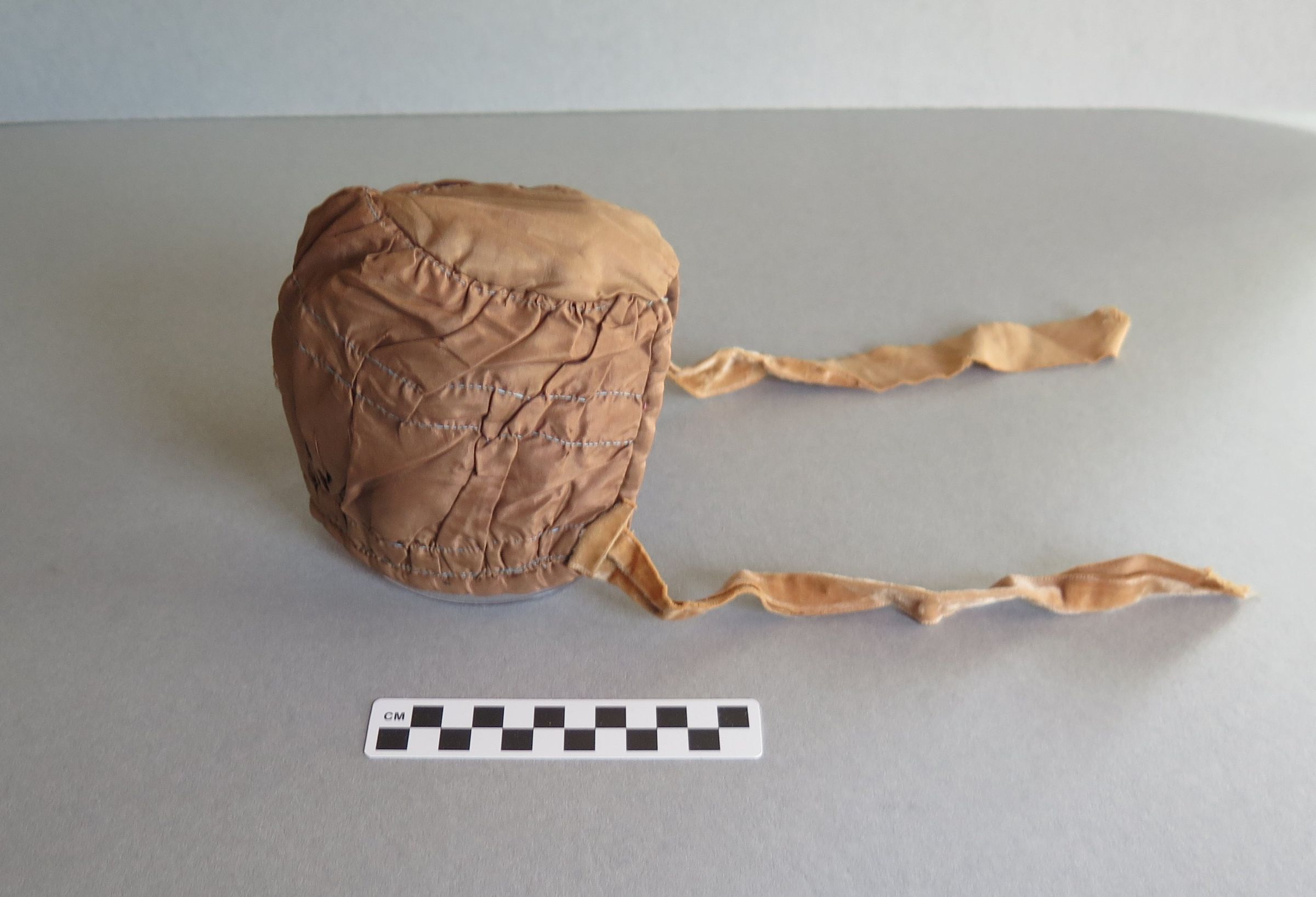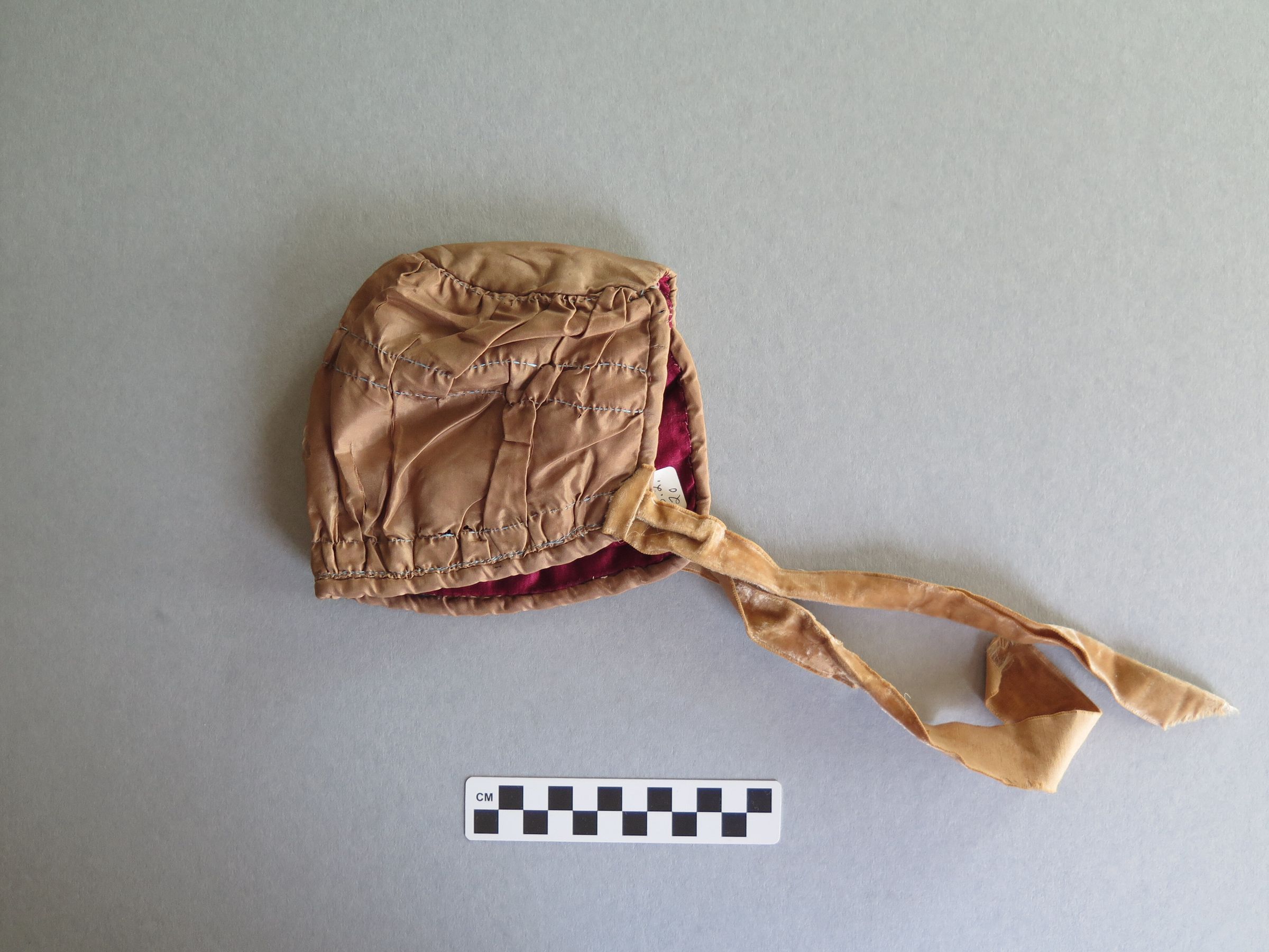 Tan baby's bonnet with a burgundy lining on the inside. There are 2 tan strings to tie the bonnet closed. Bonnet measures 6" (w) x 6" (l).
