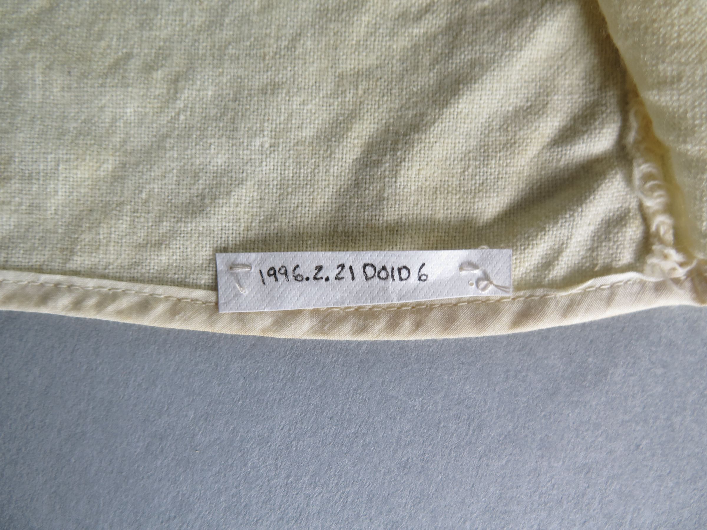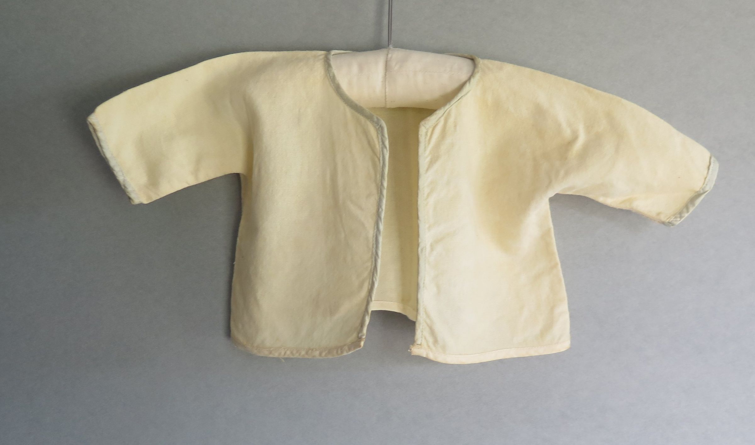 Baby's whit or off-white colored flannel jacket. The jacket is trimmed in a pale blue or green along the neckline and down the front as well as at the end of the sleeve. The jacket measures 7" (w) x 18" (l).
