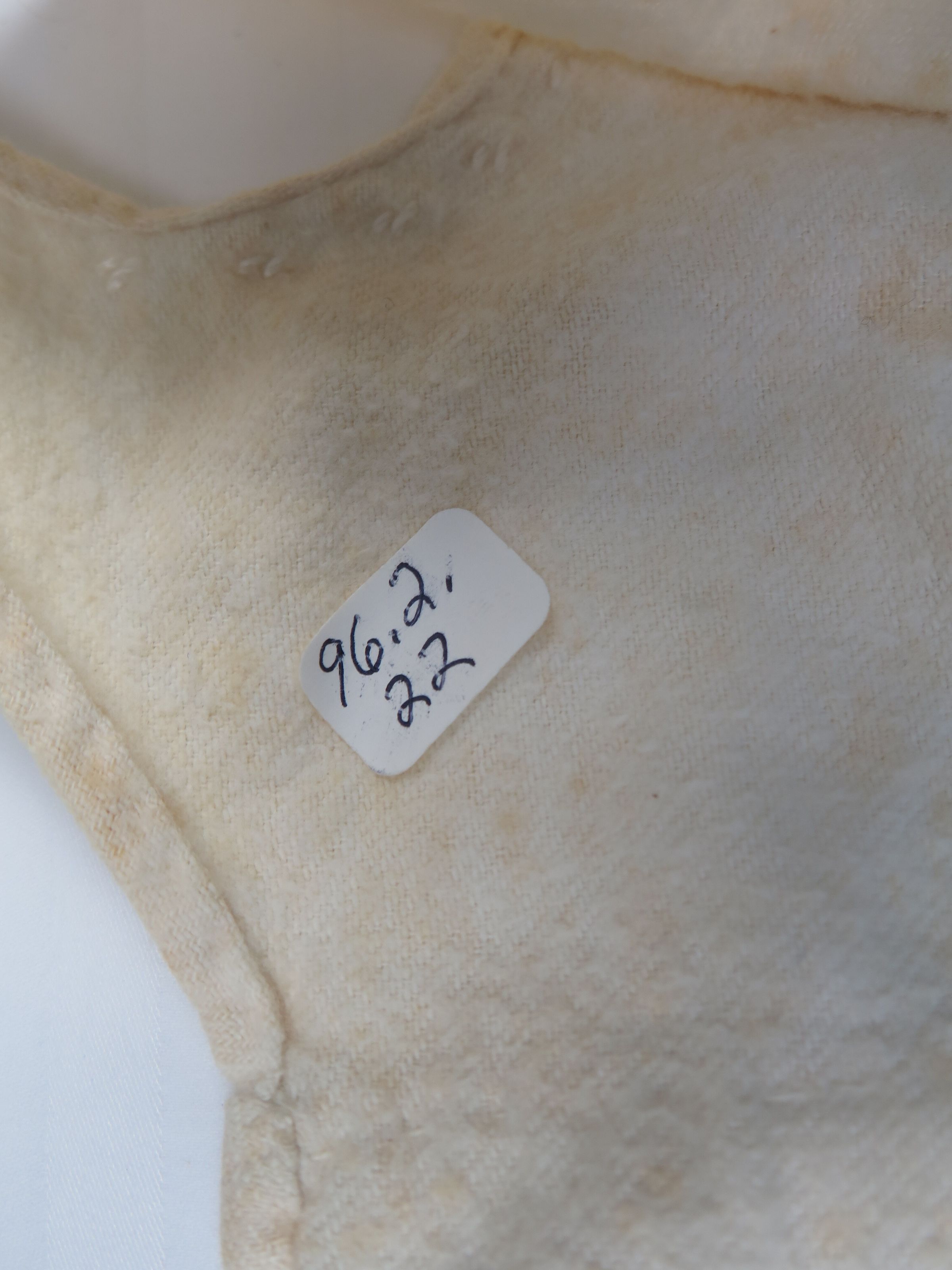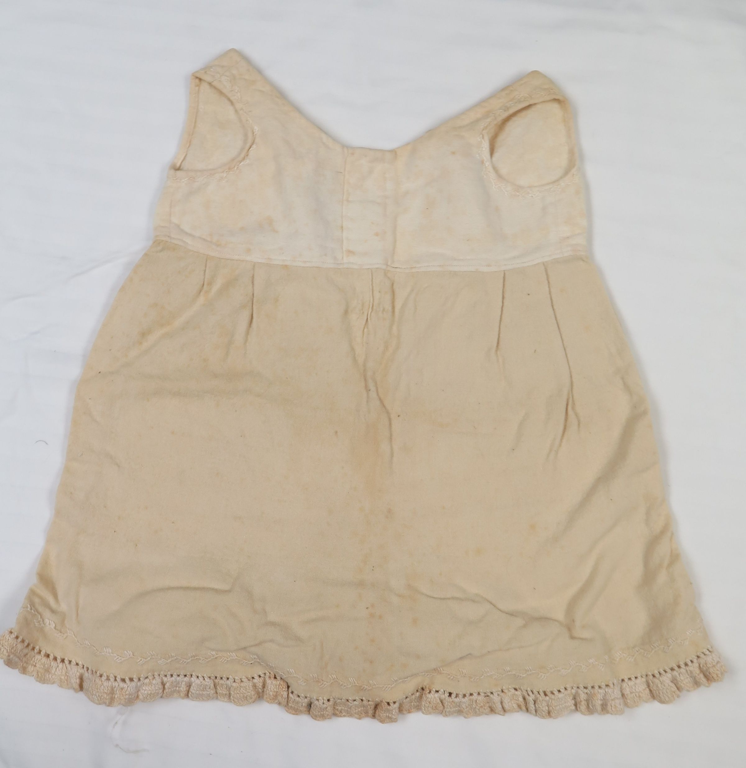 Wool white sleeveless child's slip or dress. There are white embroidered details around the sleeves and at the bottom of the dress. The bottom of the dress has a white crocheted trim. it appears as though the dress is made of two fabrics, one lighter and one darker, and sewn together at the bottom of the chest. Slip measures 10" (w) x 17" (l).Collection