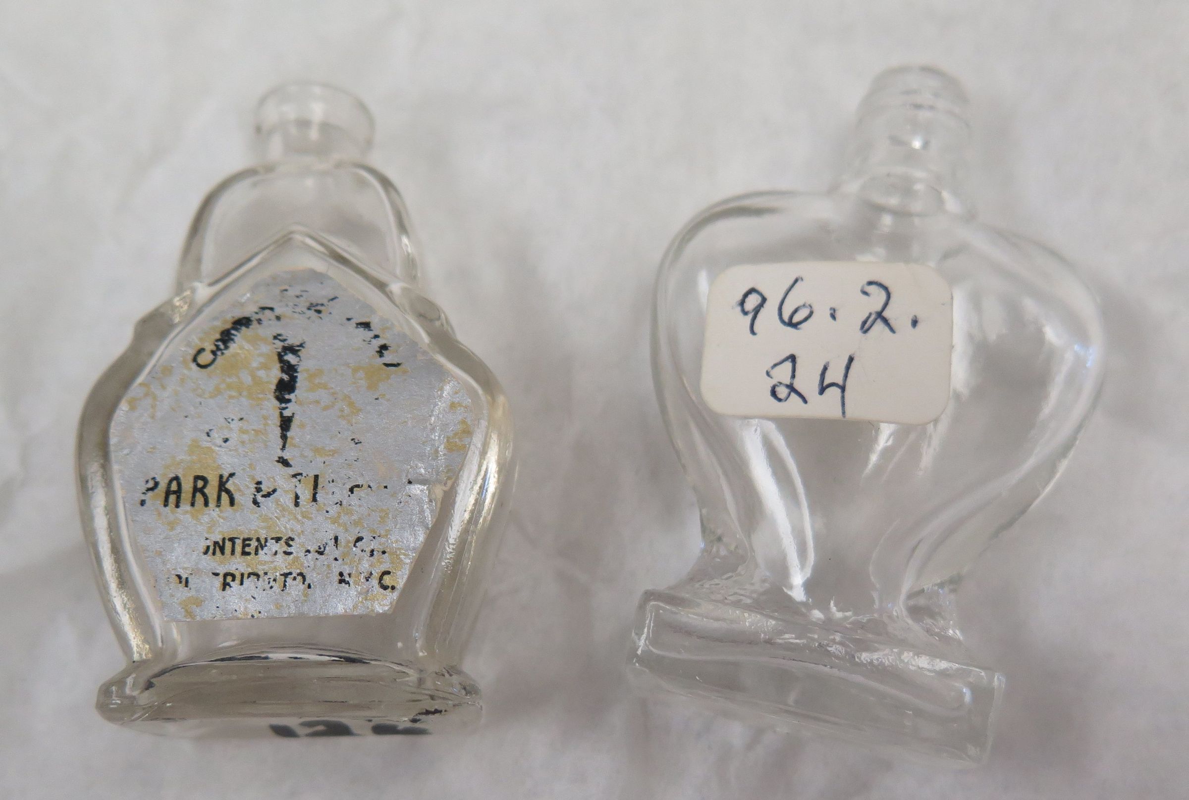 These two clear glass perfumes measure 2.25(H) x 1.5"(W). One has remnants of an original label.