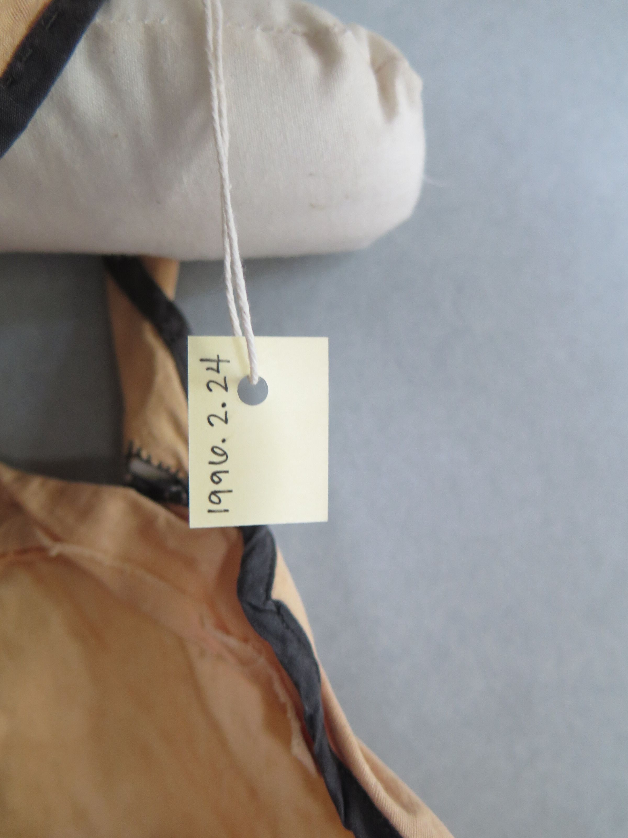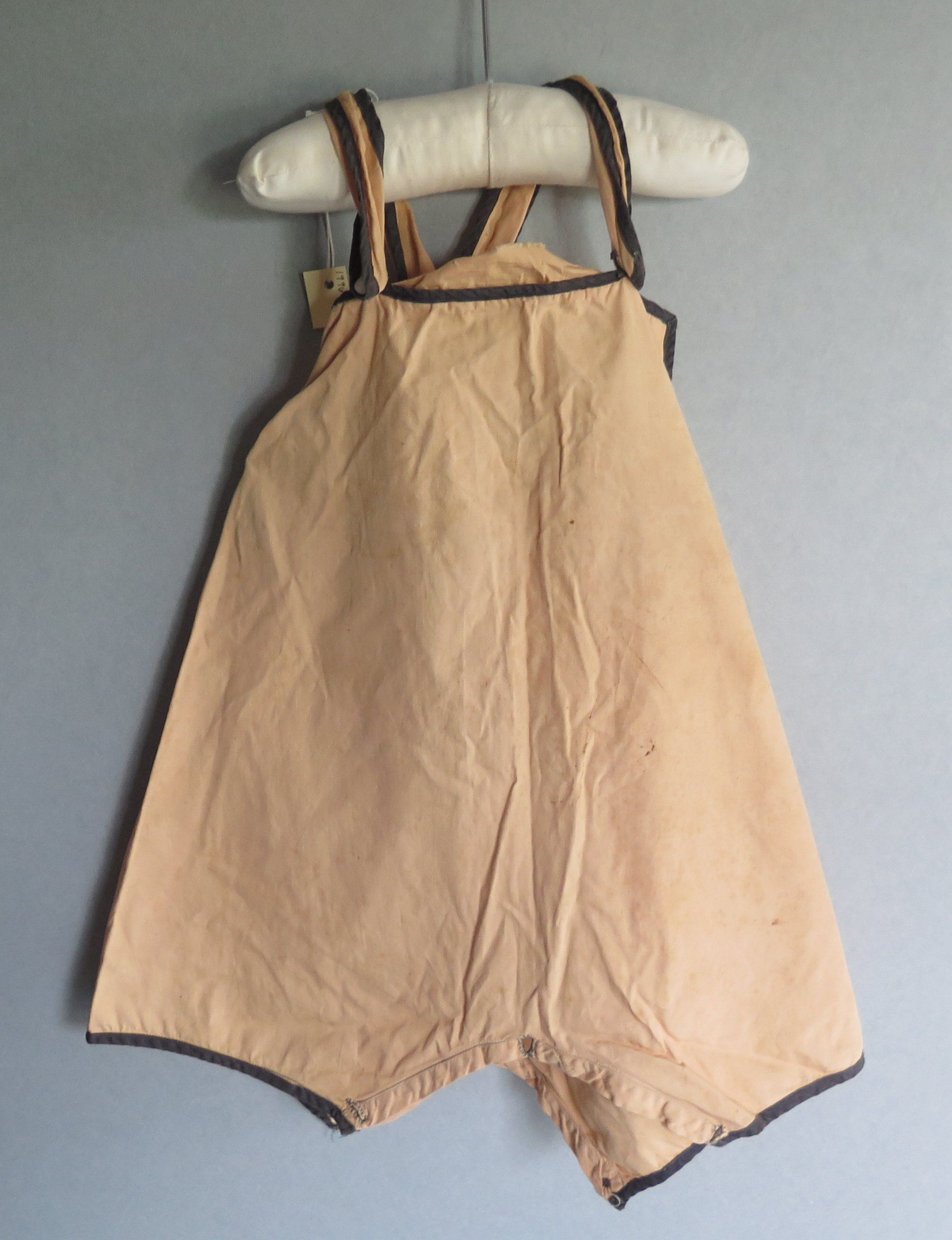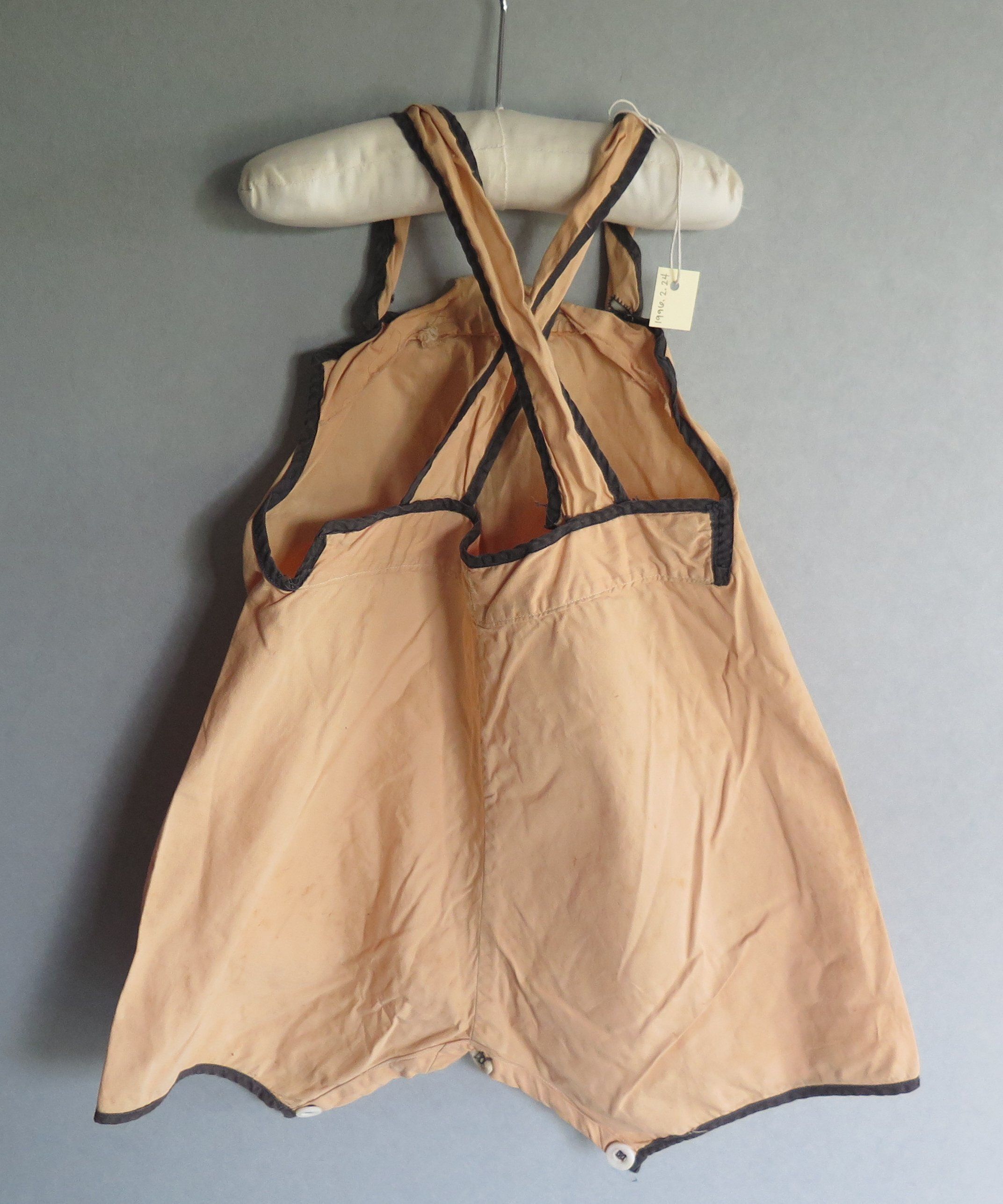 Gold child's romper with black trim on the legs, neckline and straps. The romper appears to be more like overalls, with bottons in the front to secure closure. There are buttons on the bottom to close around the legs. The straps of the romper cross in the back. The jumper measures 6" (w) x 15" (l).