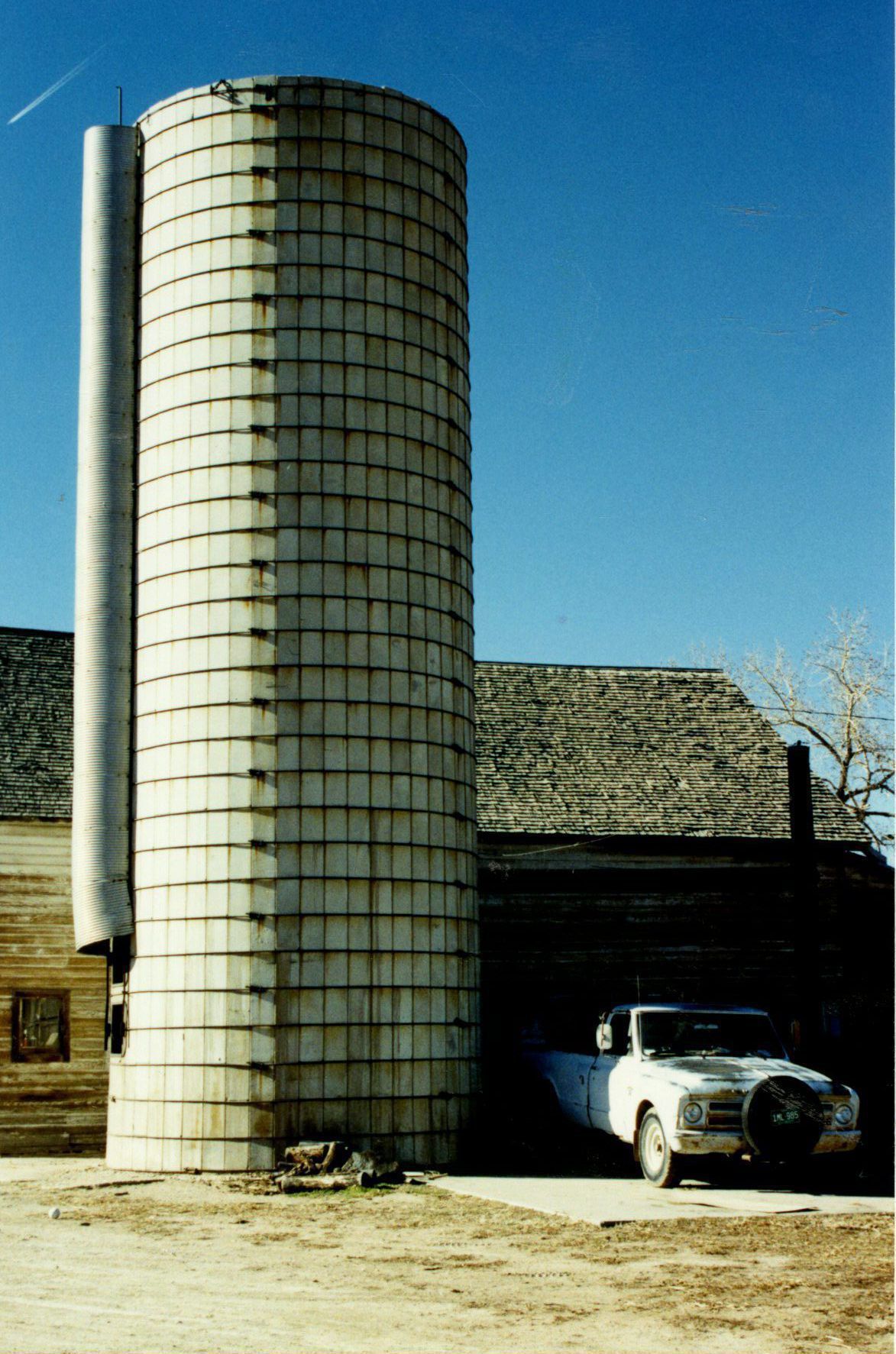 Vertical picture of the grain silo on the Brunner property, with white truckPhotograph Details