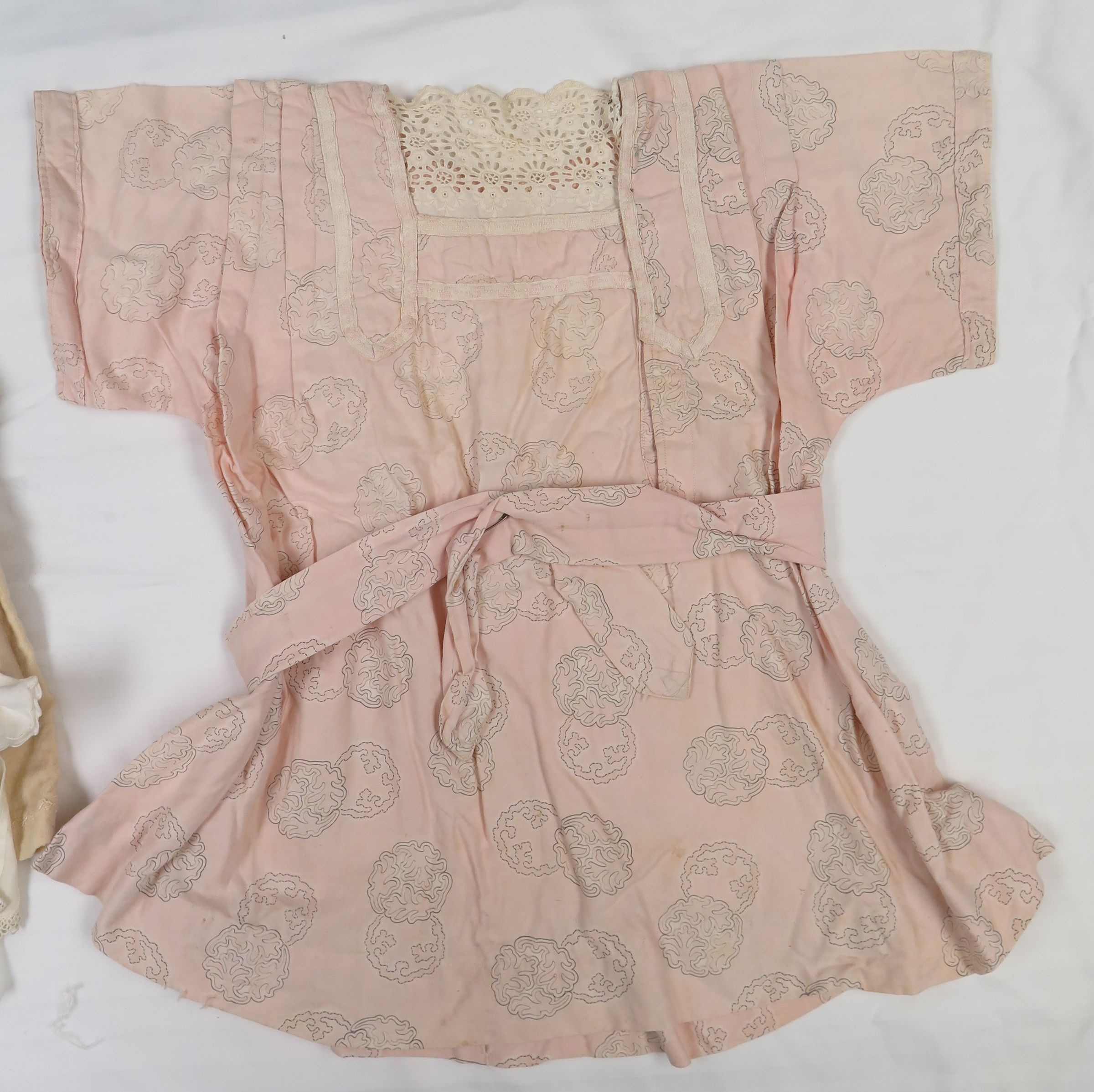 Baby Dress Pink. The pink fabric has a darker colored circular design pattern all over it. The top has a pale pink or off white lace in the front. There is a tie across the middle of the dress in the same material as the dress. Dress measures 11" (w) x 19" (l).