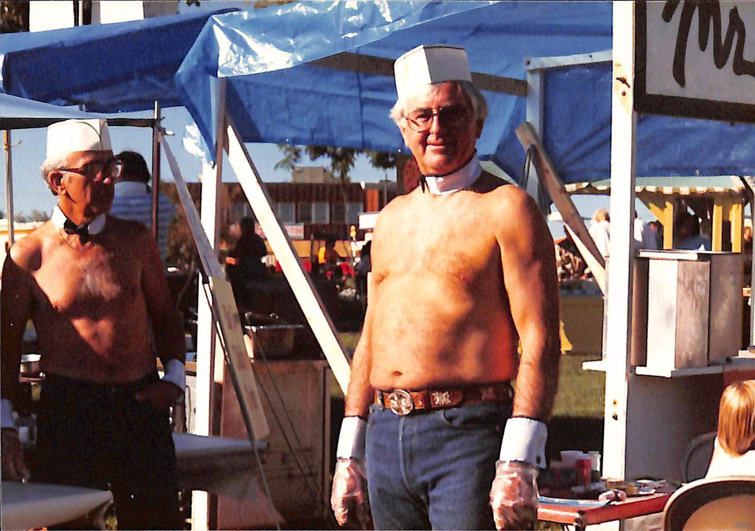 Item is a photograph taken on Kodak paper of the 1989 Broomfield Days. The photo features two older men with glasses standing in front of a Broomfield Days event booth with a blue tarp roof. They are both shirtless but wearing a white paper sailor hat, collar, cuffs, and jeans with a large belt buckle. The one in the front is smiling, while the other is not paying attention. A green sticky note on the back of the photo reads "Jerry?," which could be the name of one of the men. They could have been helping out with the "Bal Swan Duz Donuts Topless" event.Photograph Details