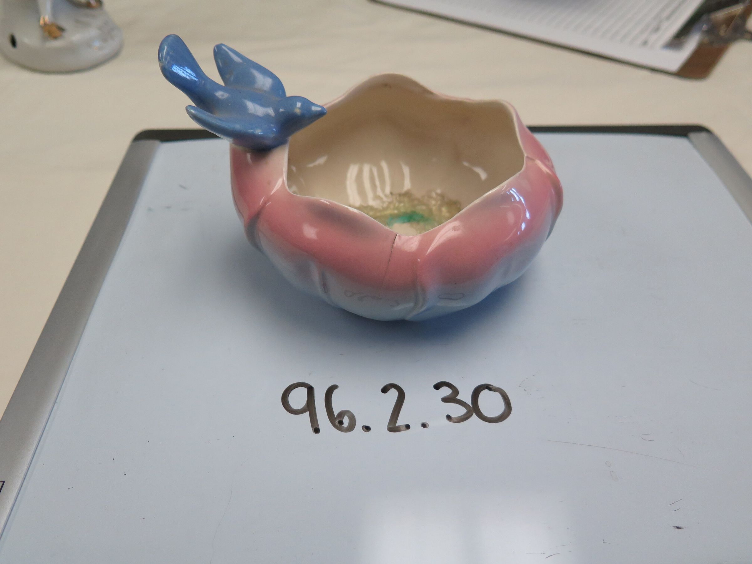 This is a pink ceramic Royal Copley planter with blue bird on top. The bird has a broken wing. It measures 4"(h) x 5" (d).