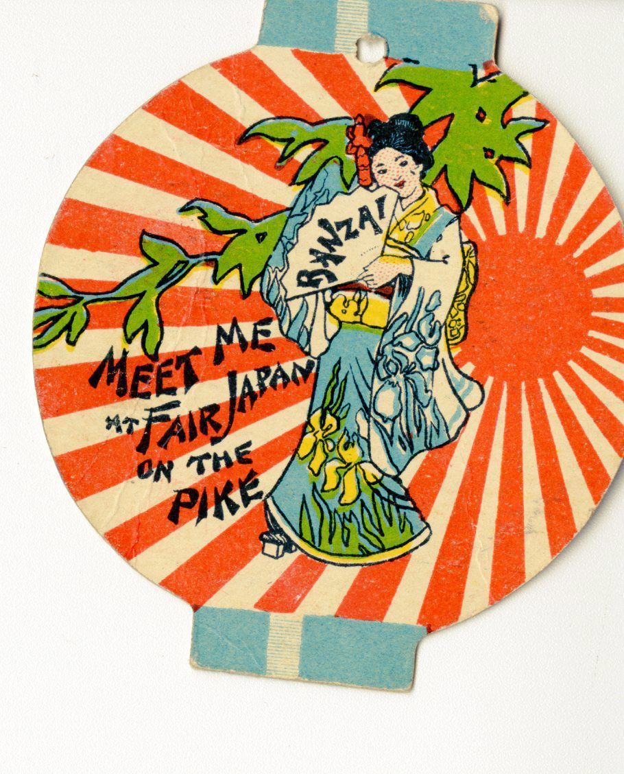 A thin cardboard tag from the 1904 World Fair. It's in the shape of a lantern with a blue tab-area on the top and bottom, a hole punched through the top to presumably attach it. On the front, it features a geisha with black, tied hair and a red hair ornament. She has red lips and pale white skin and wears a lavender and yellow kimono. Her sleeves are long and flowing, featuring purple flower designs. The upper section of her kimono is white and yellow, the obi and bow being the same yellow color with flower patterns. On the bottom half of her kimono is lavender with yellow flowers, green grass, and white piping. She holds a white fan that reads "BANZAI" and geta sandals. The background has a green plant/vine and the backdrop is the flag of the rising sun. The text beside her reads "Meet me at fair Japan on the pike."