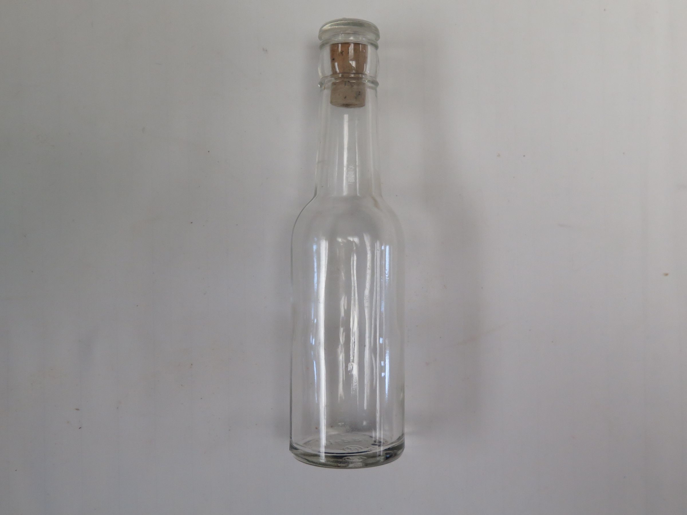 This is a clear glass bottle with a round base and a cork in the top. The bottle measures 7.5" (h) x 2" (dia).