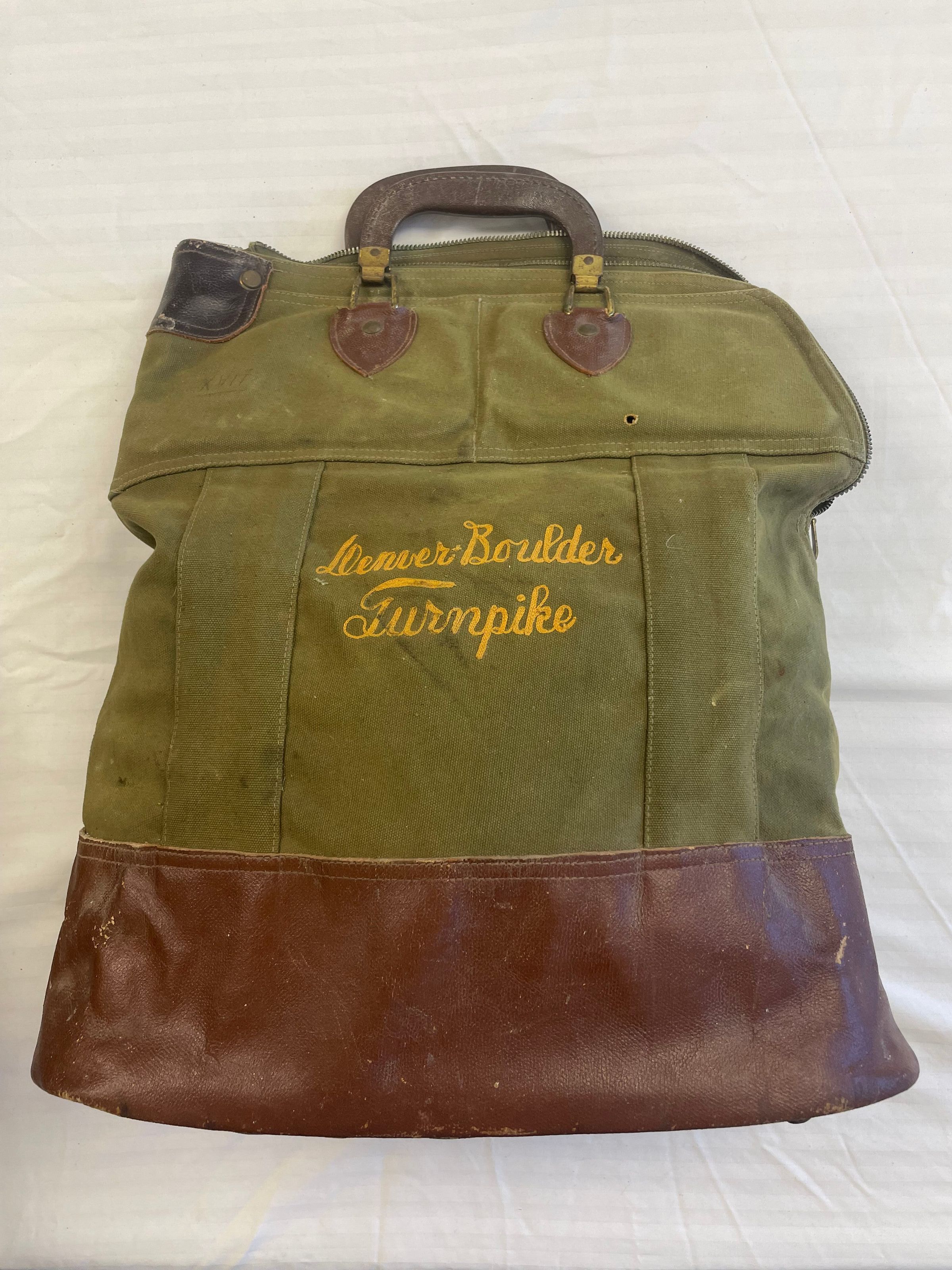 A bag make out of olive green fabric with a leather bottom and leather handles to carry the bag. On the side is written Denver-Boulder Turnpike with yellow/gold thread. In the top left corner is the roman numeral 'XVII' written with pencil on both sides of the bag.