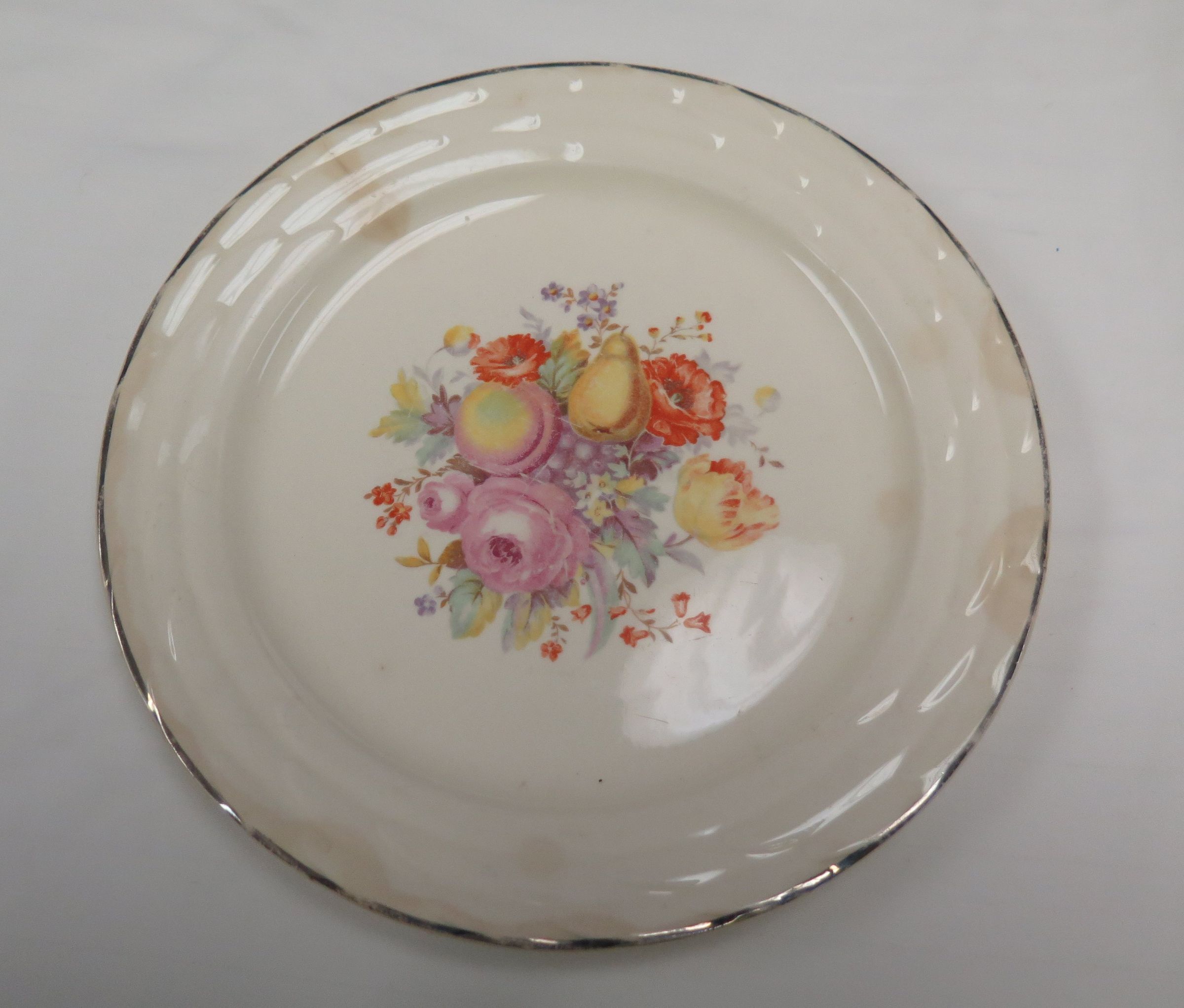 This is a white decorative plate with a silver rim and a floral design in the center. The plate measures 0.5" (h) x 7" (dia).
