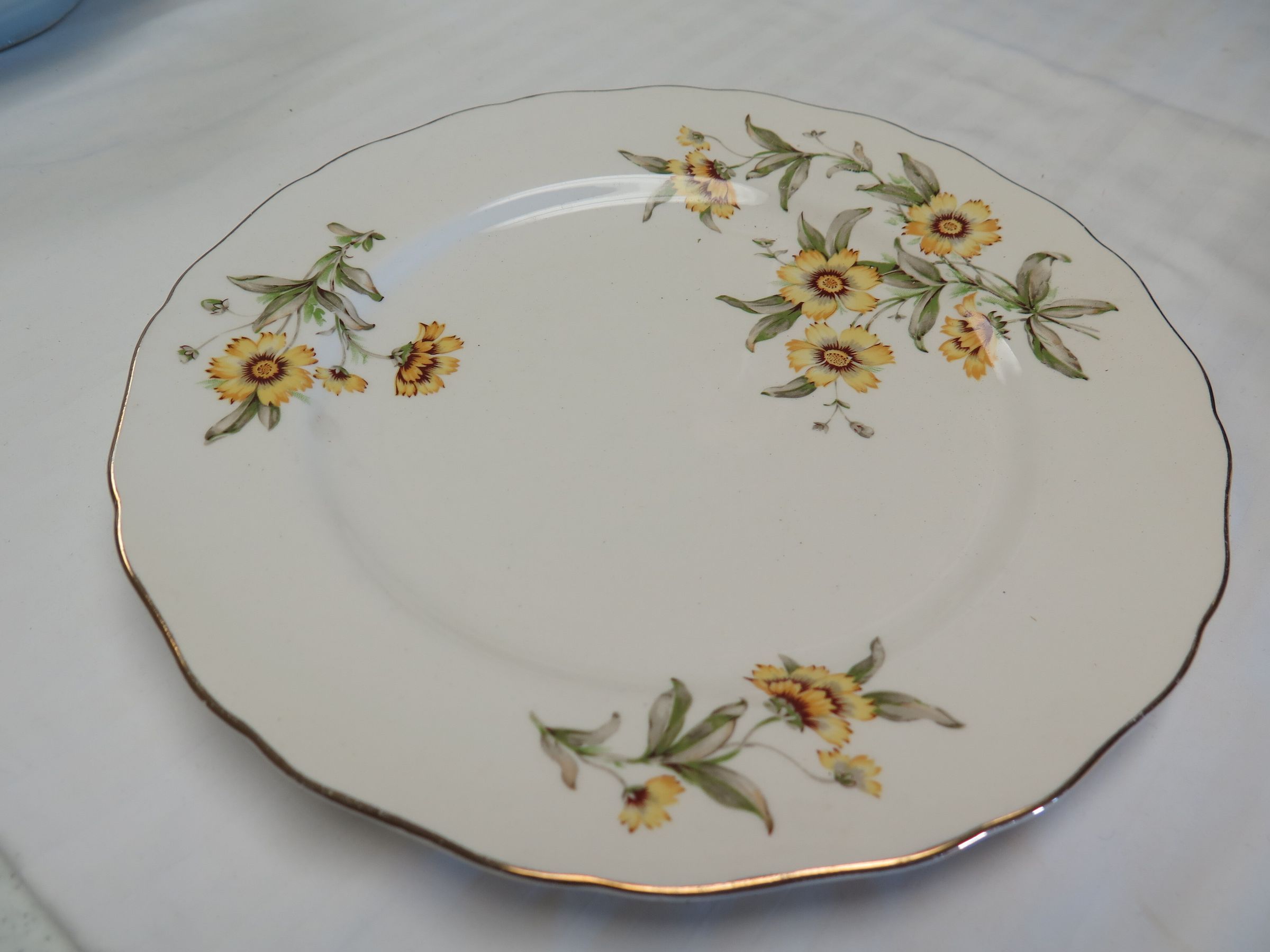 This is a white serving plate with a gold rim and yellow flowers around the edge. The plate measures 1" (h) x 10" (dia).